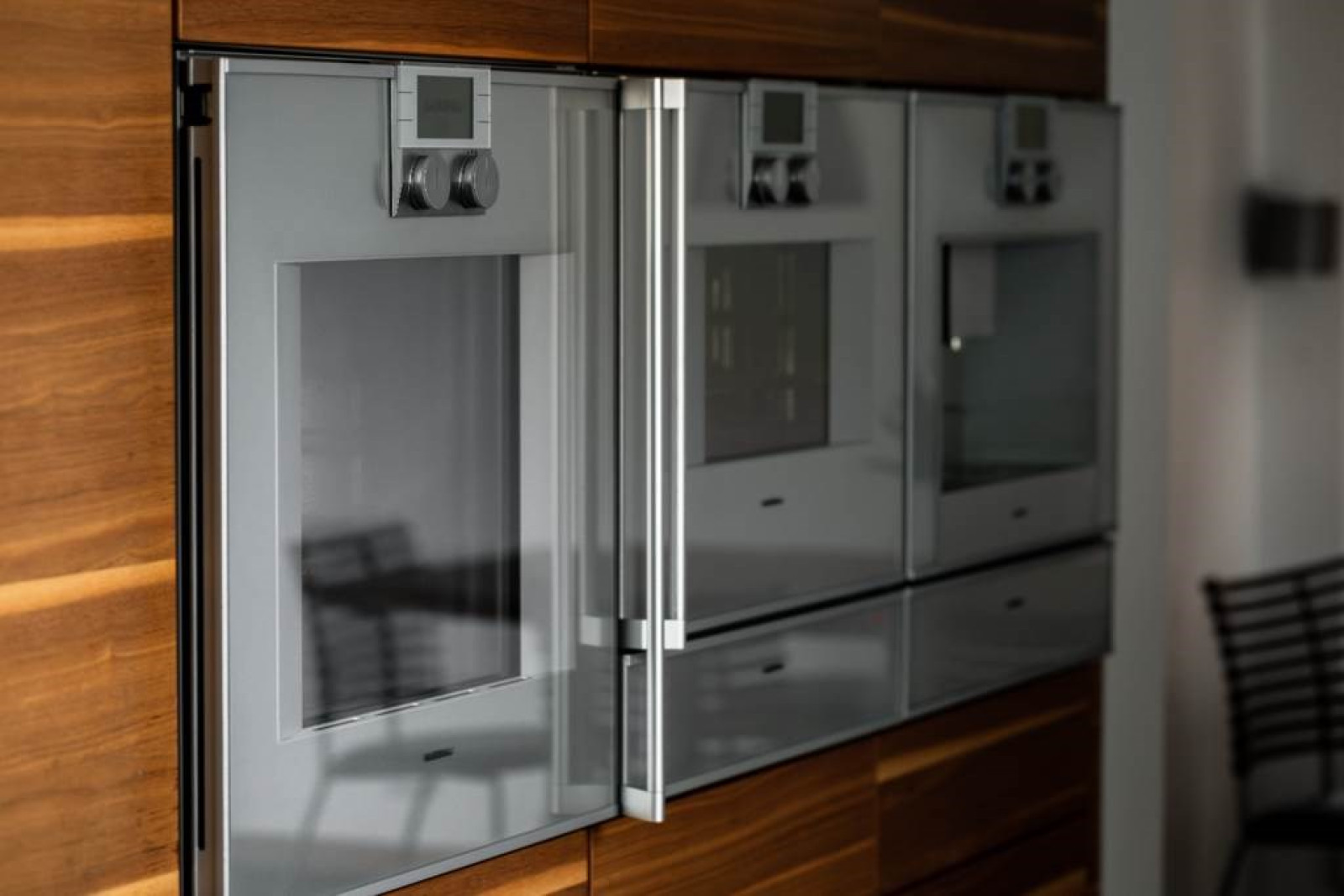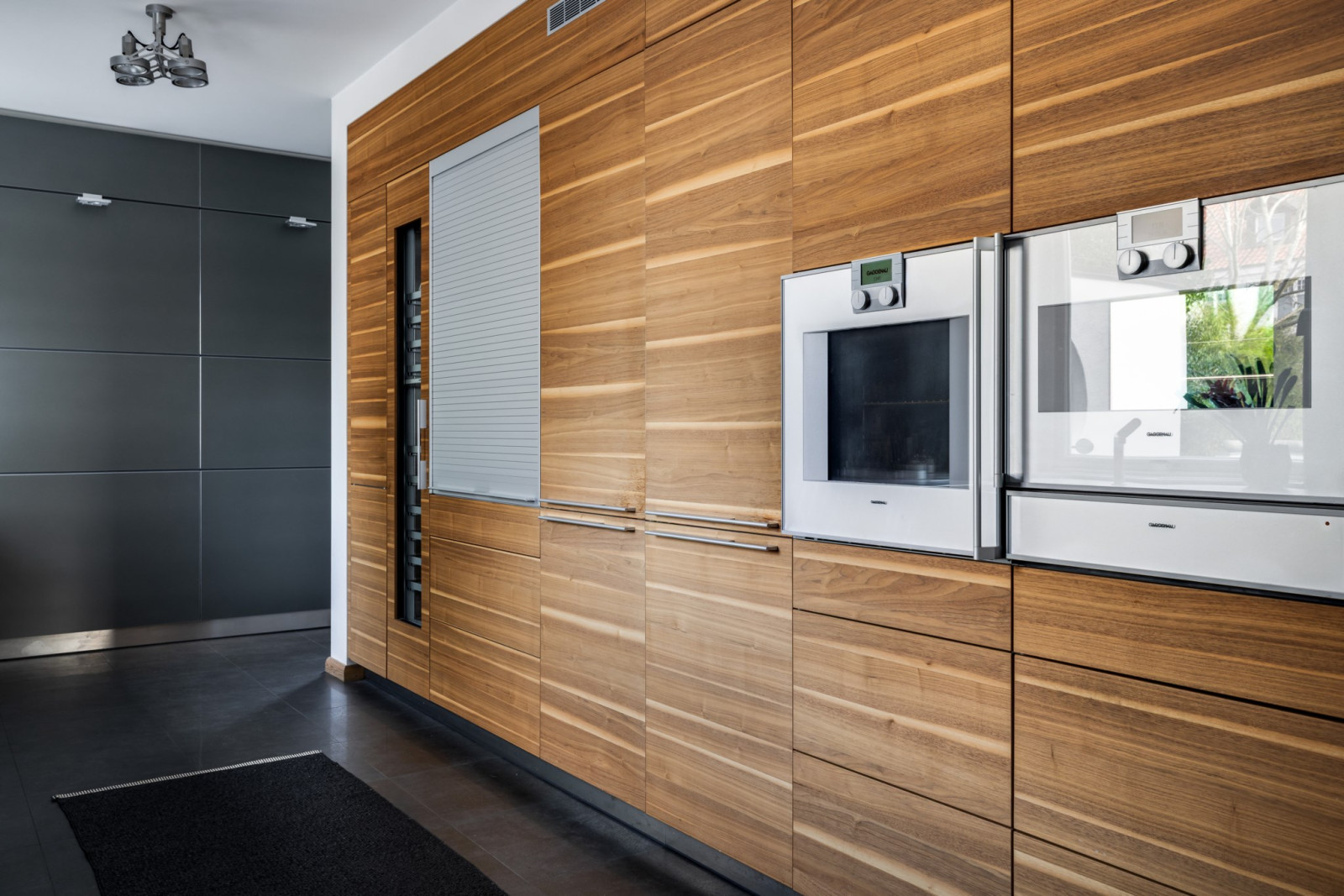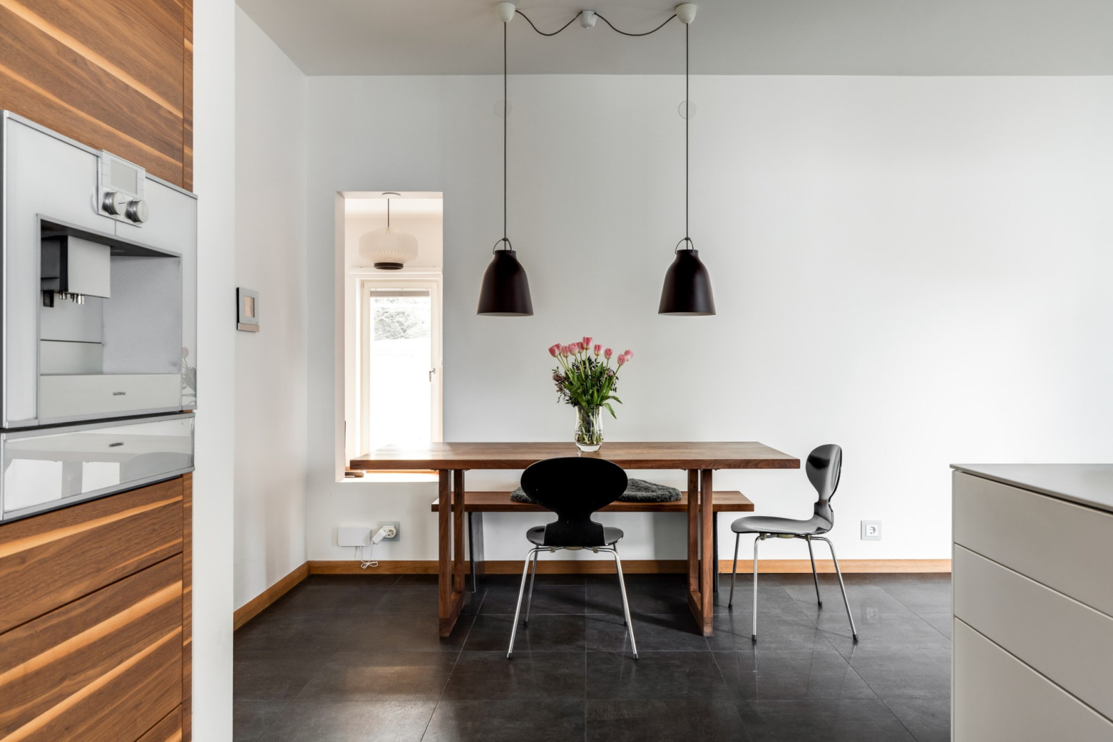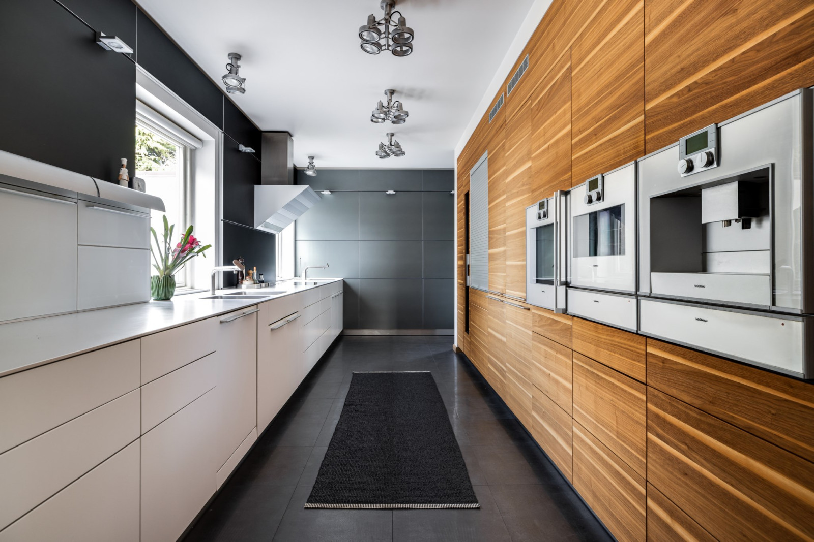 KÖK MED MATPLATS. Bulthaup inredning i matt vitt och valnöt. Väggpanel system i aluminium med integrerat elsystem. Bulthaup köksfläkt med kolfilter. Maskinell utrustning från Gaggenau, bestående av induktionshäll (5 zoner), vinkyl, dubbel kyl/frys, ugn, ångugn, diskmaskin, dubbla tallriksvärmare, samt kaffemaskin. Klinkergolv och spotlights tak.