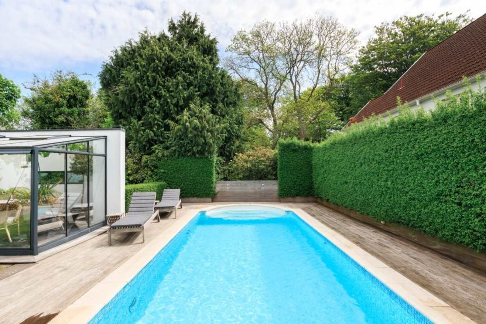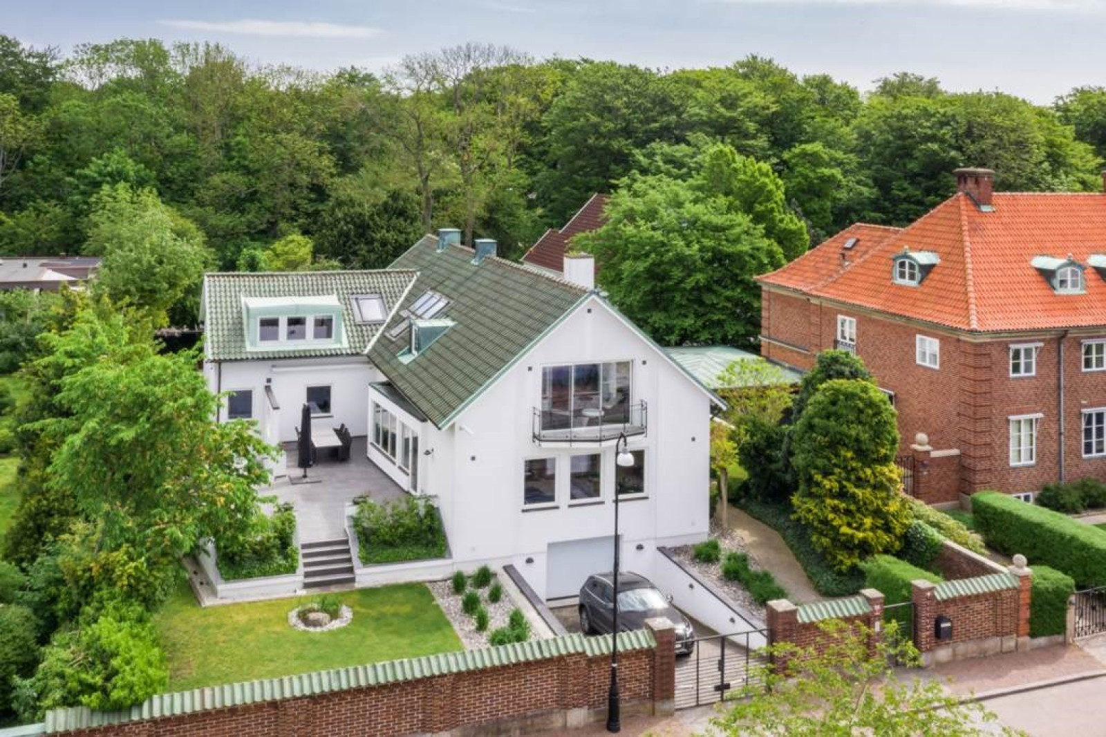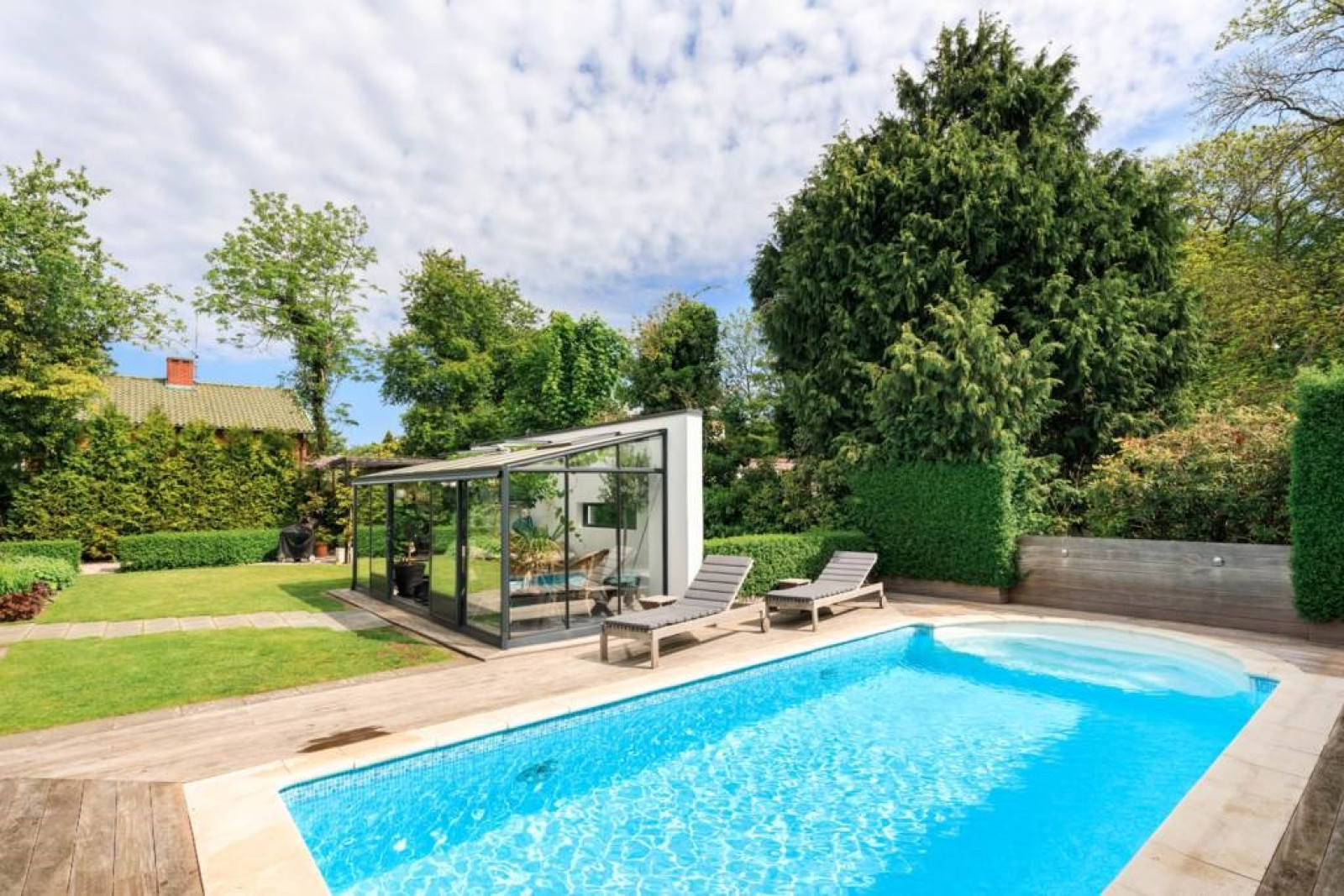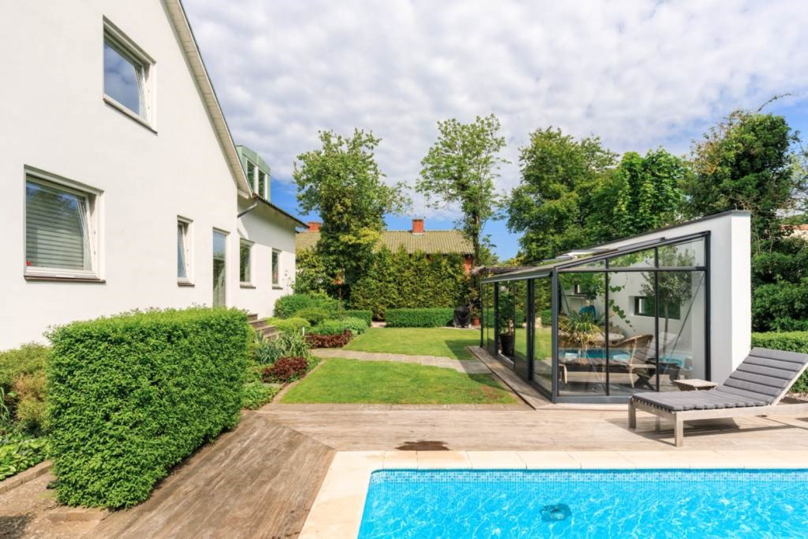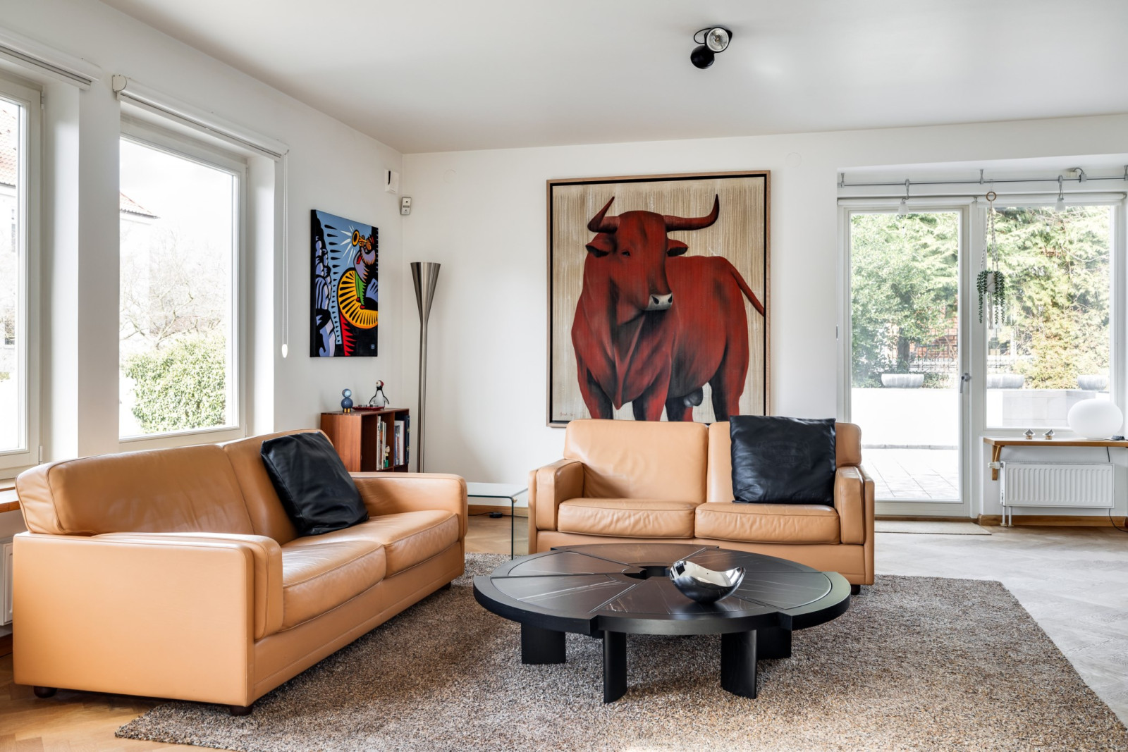 SOVRUM med ekparkett och utsikt mot trädgård.