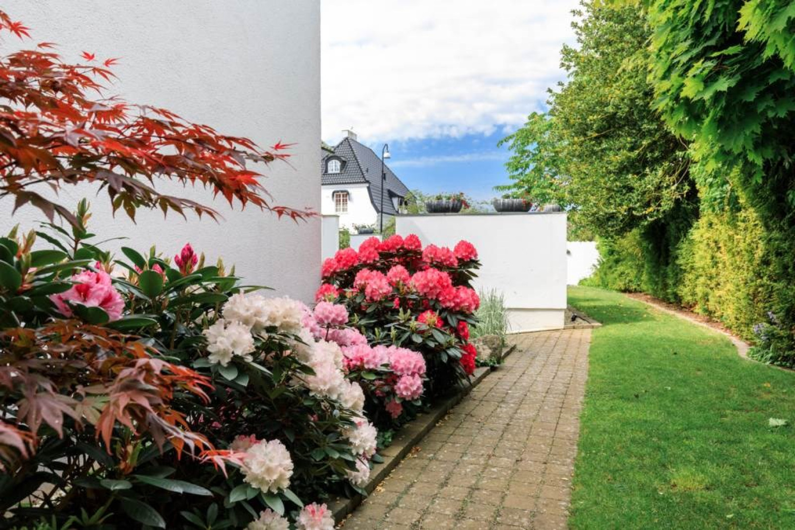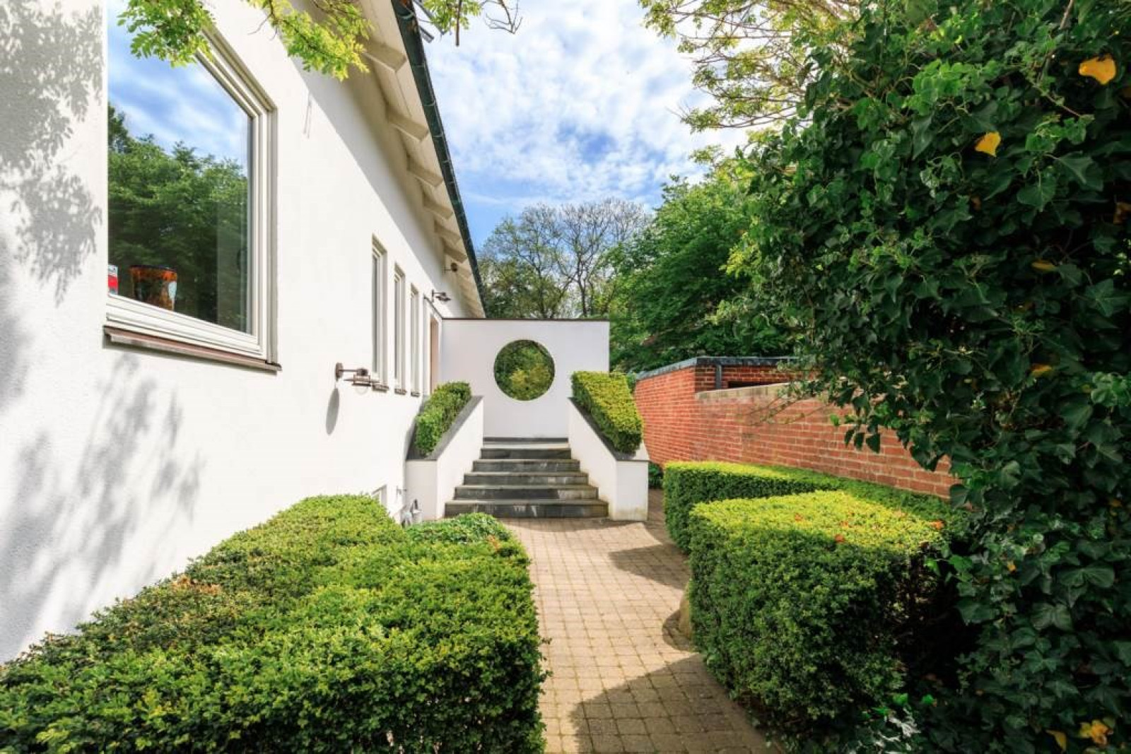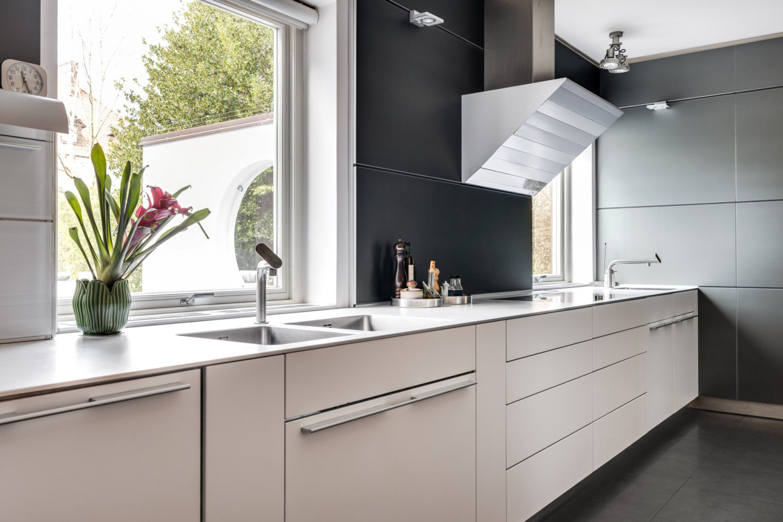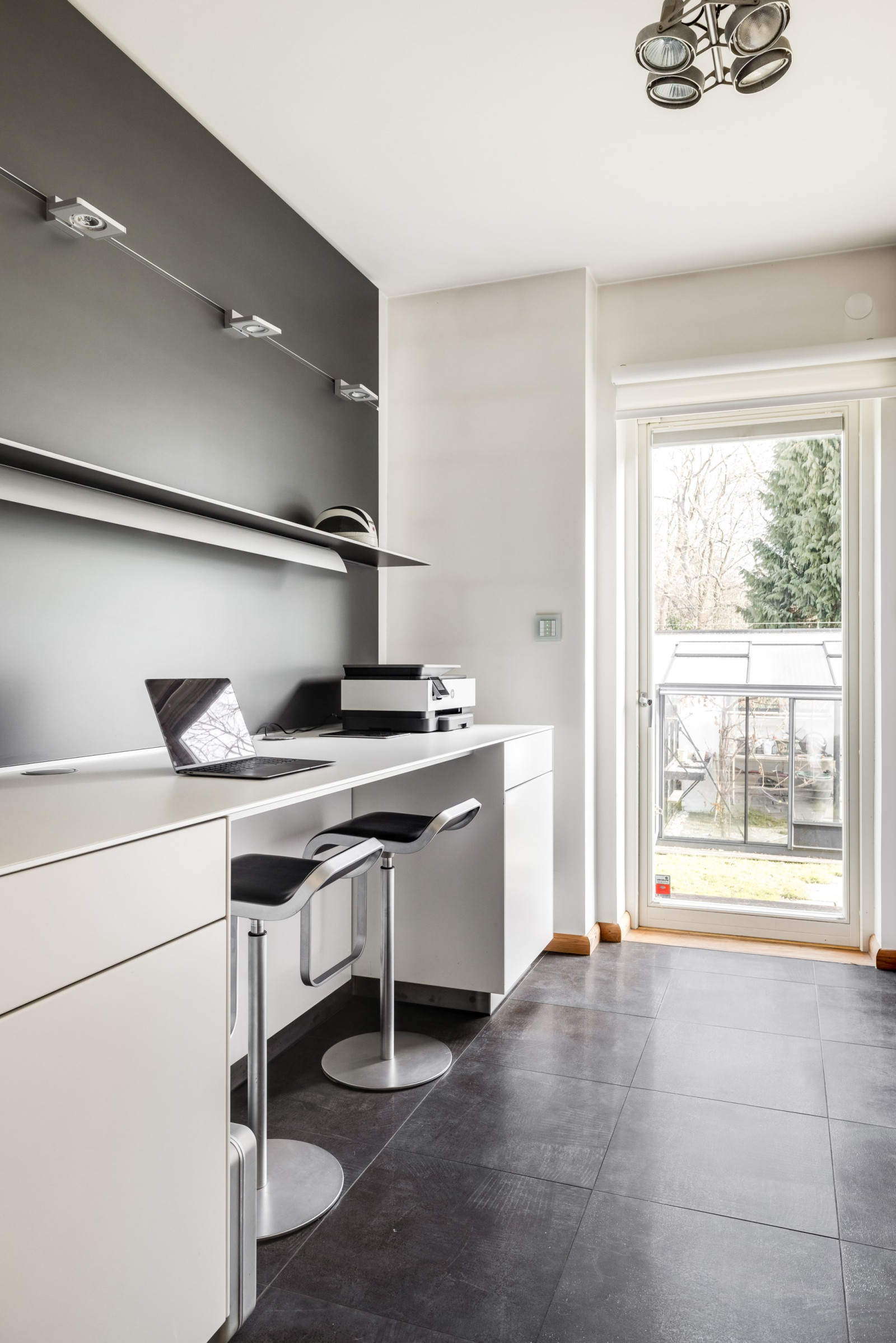 KONTOR med klinker, Bulthaup fast kontorsinredning i matt vitt, väggpanel system i aluminium med integrerat elsystem samt utgång till trädgård.