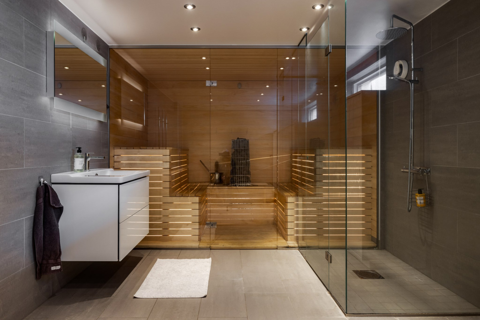 DUSCHRUM och bastu med glasväggar.