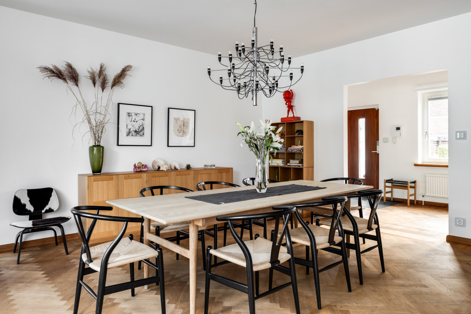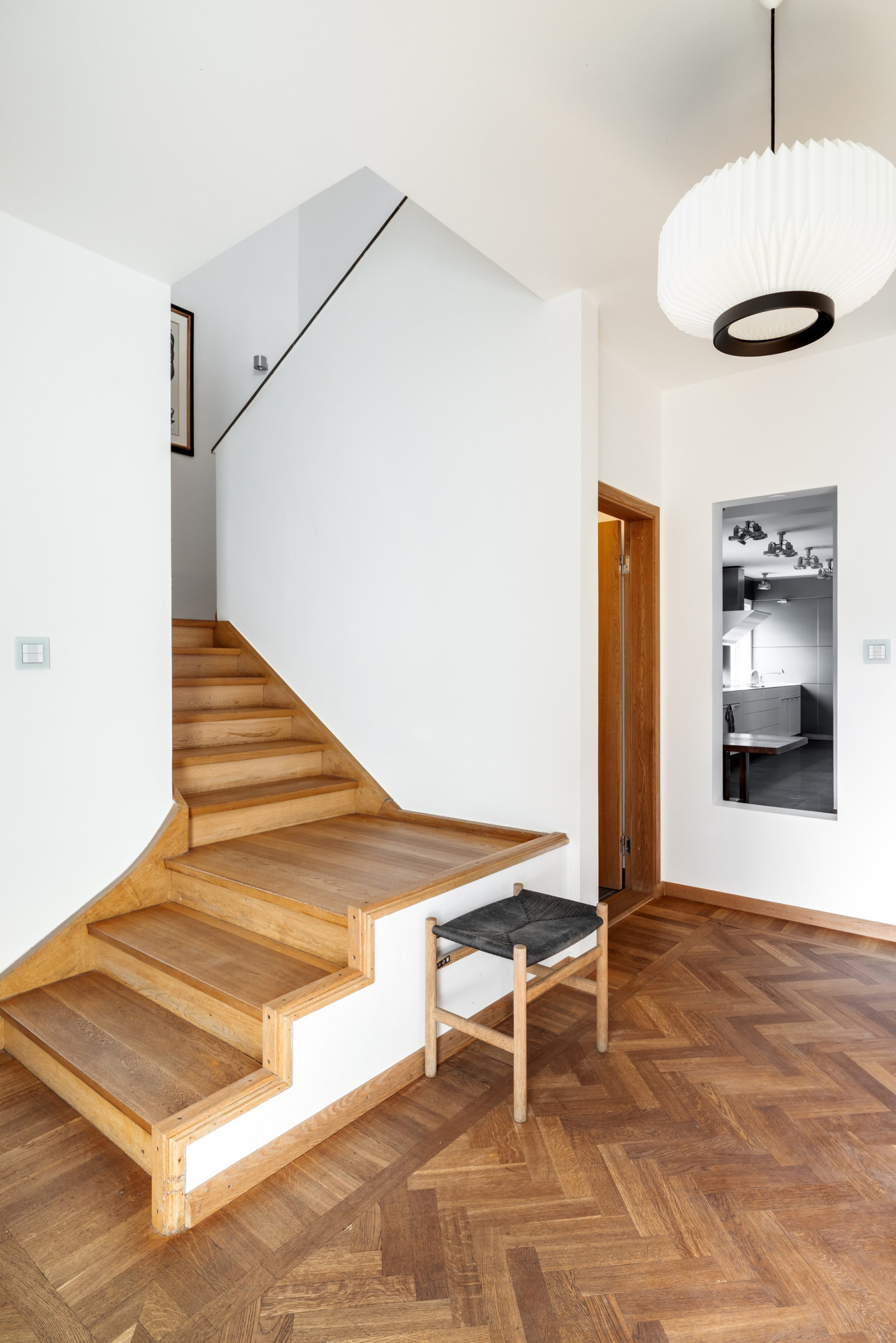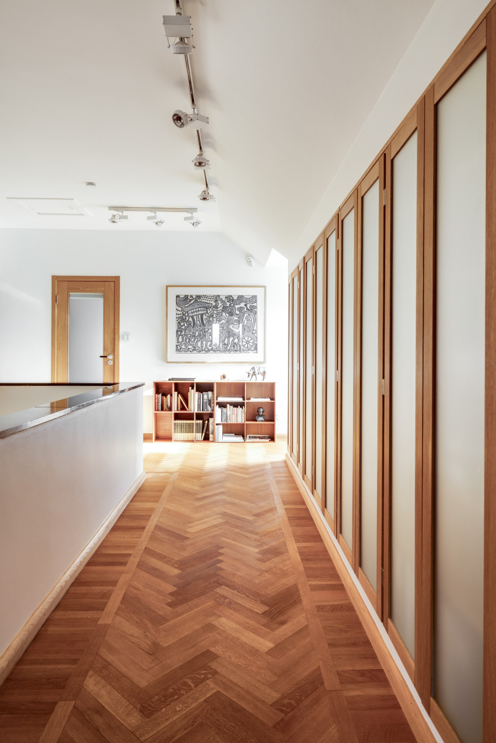 HALL med fiskbensparkett och inbyggda skåp i ek och glas.