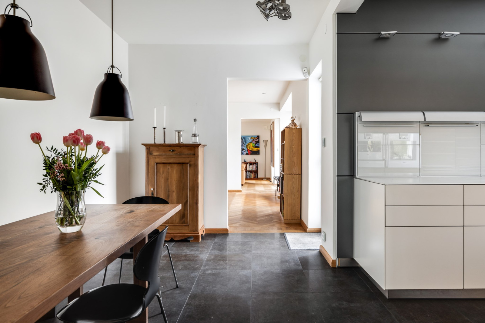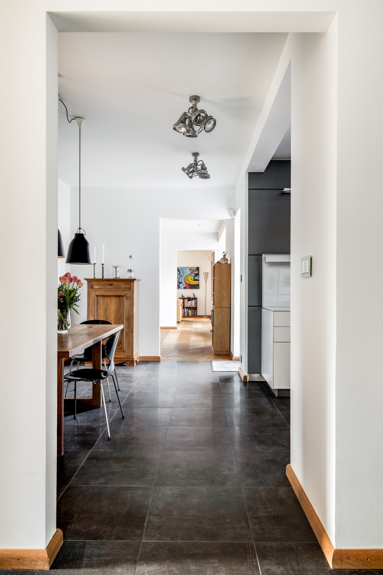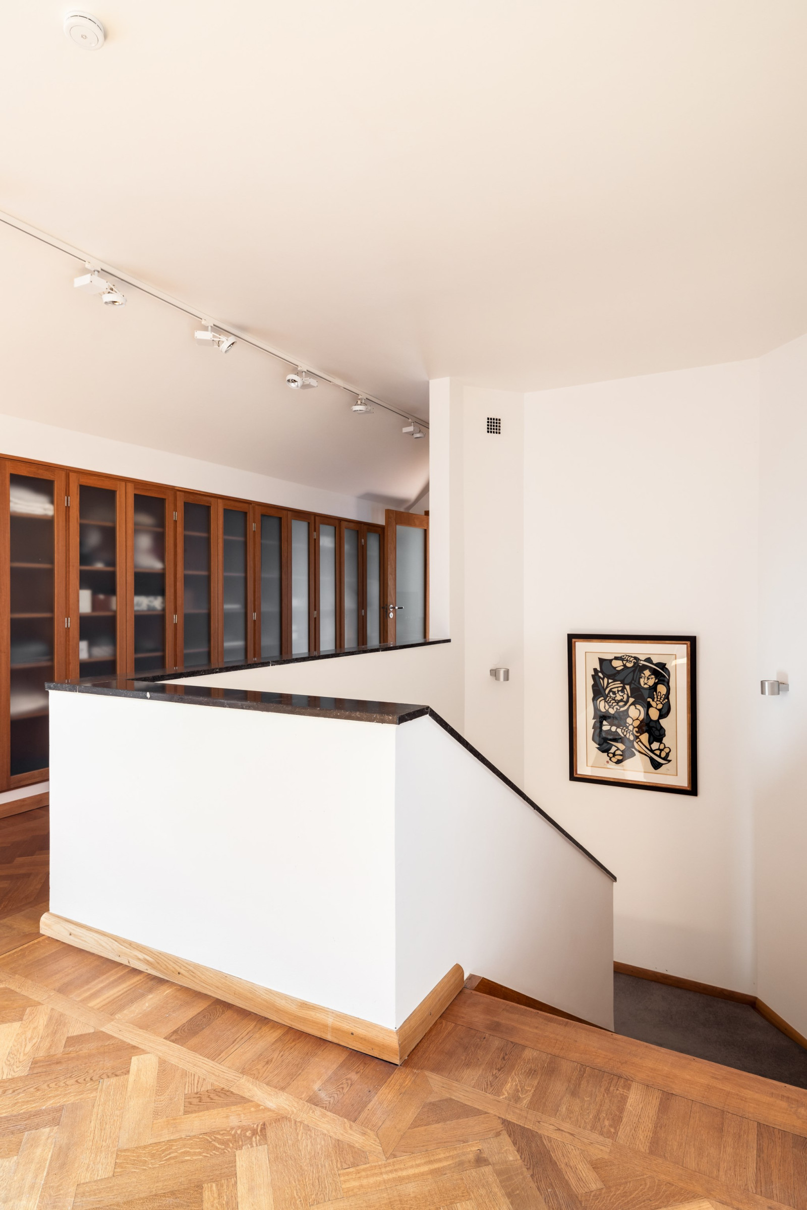 HALL med fiskbensparkett och inbyggda skåp i ek och glas.