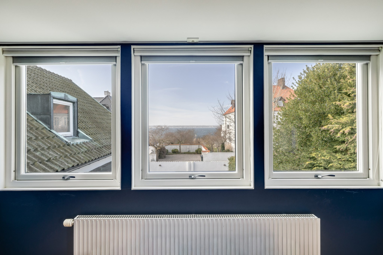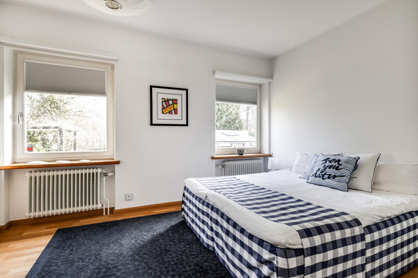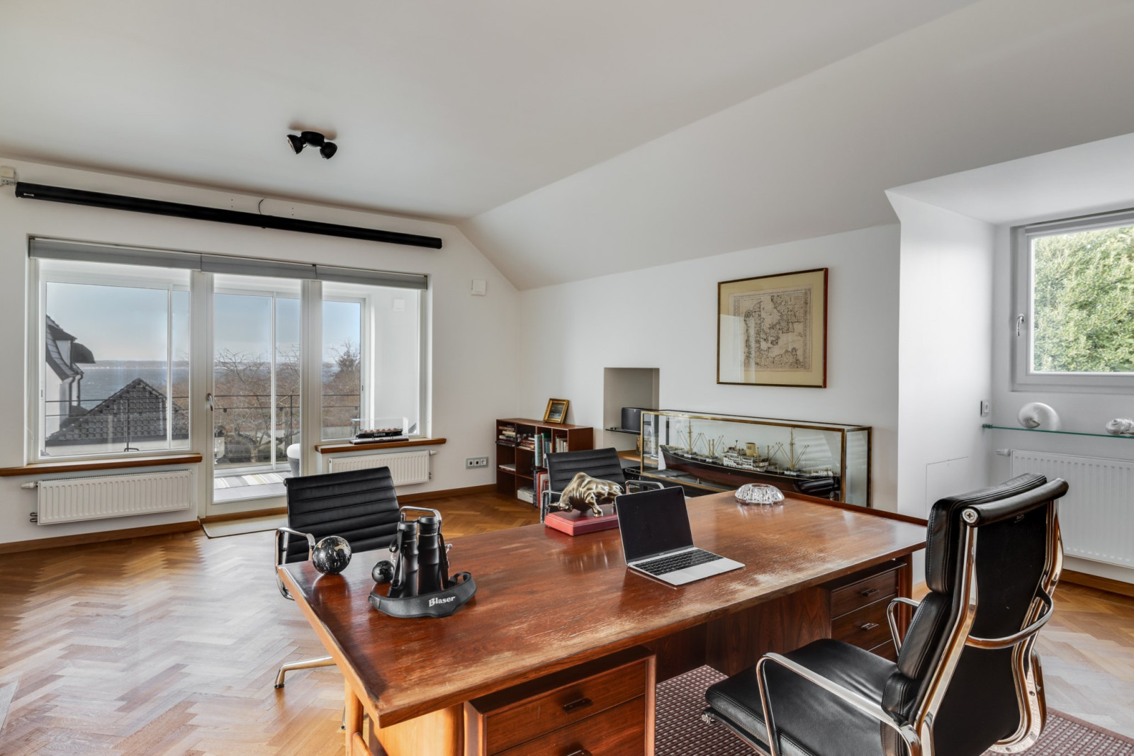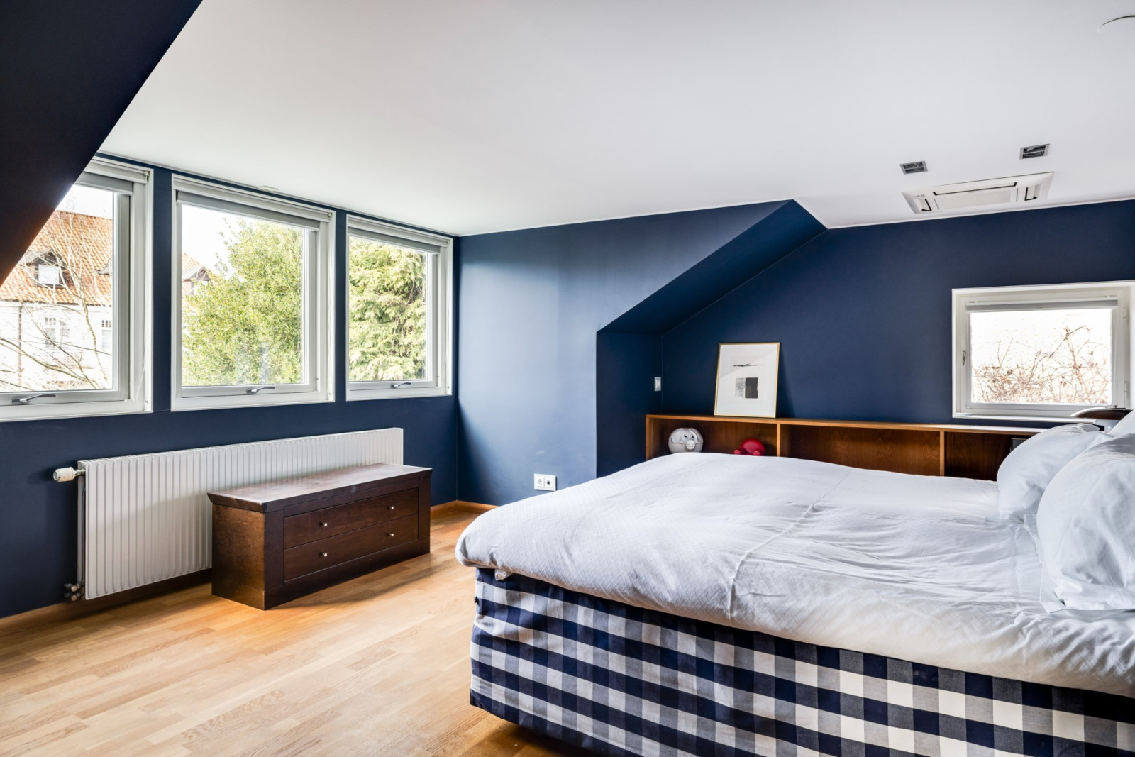 MASTER BEDROOM med ekparkett, platsbyggda ekhyllor, kabelsystem för ljudanläggning/projektor/duk. AC. Stor fönsterkupa med fin sundsutsikt.