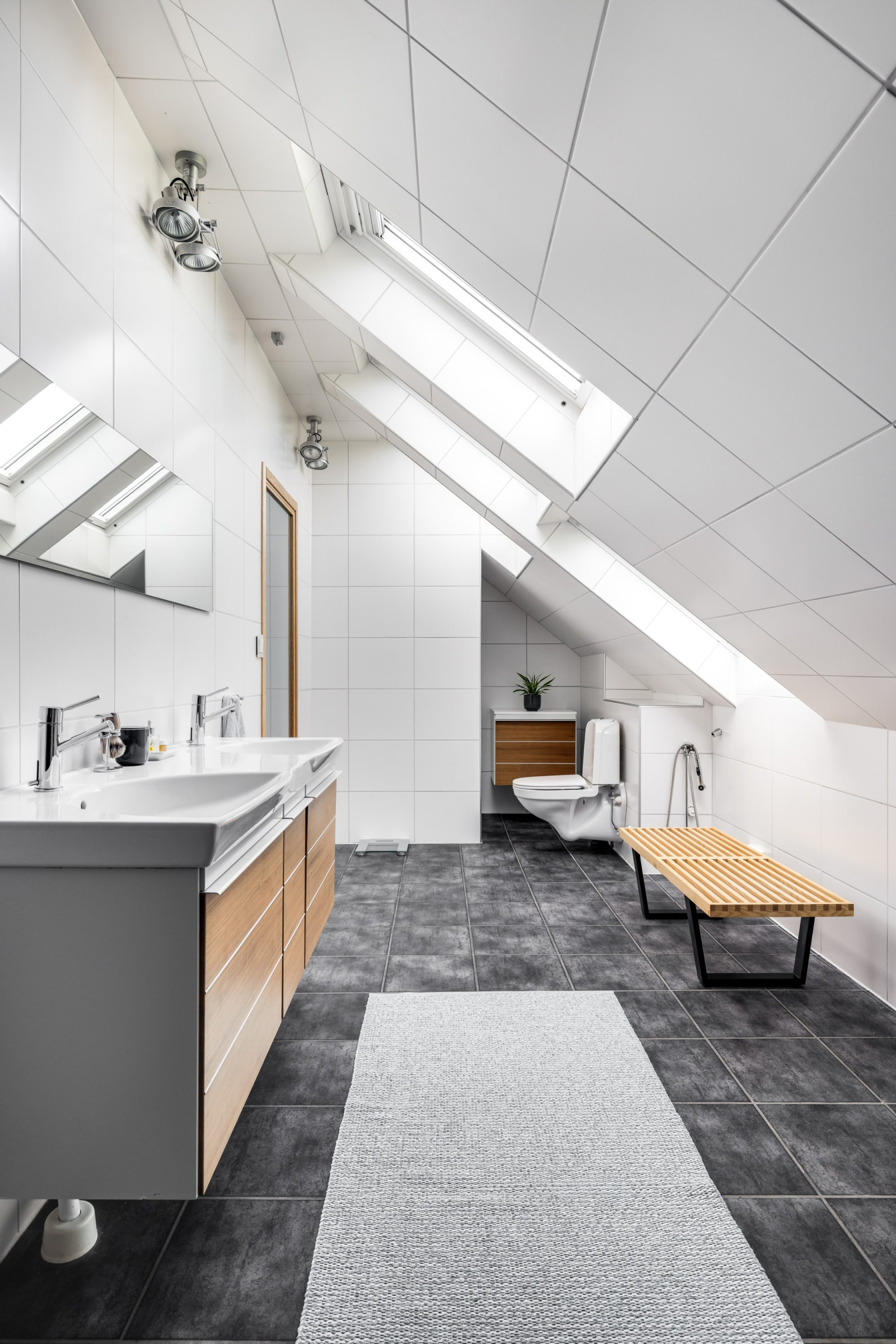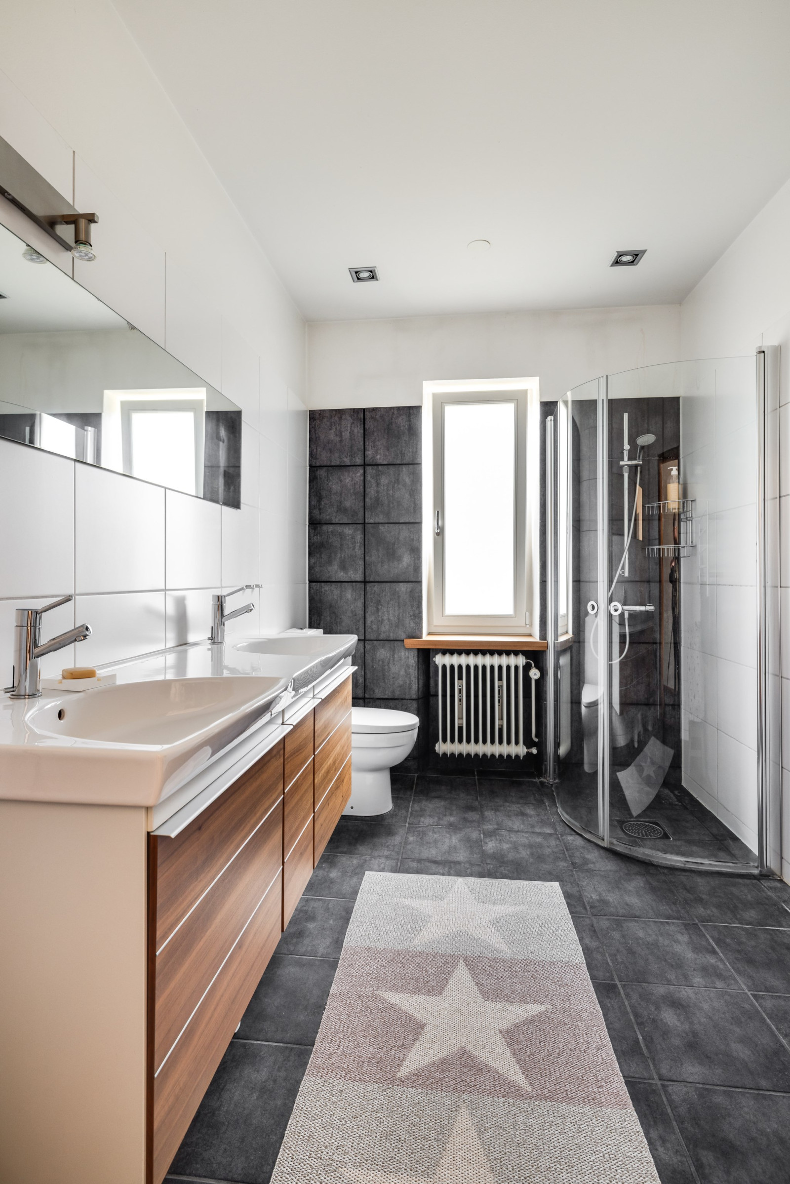 DUSCHRUM med kakel och klinker, dubbelhandfat, skåp i valnöt, dusch, toalett, handdukstork, spotlights i tak, samt fönster.