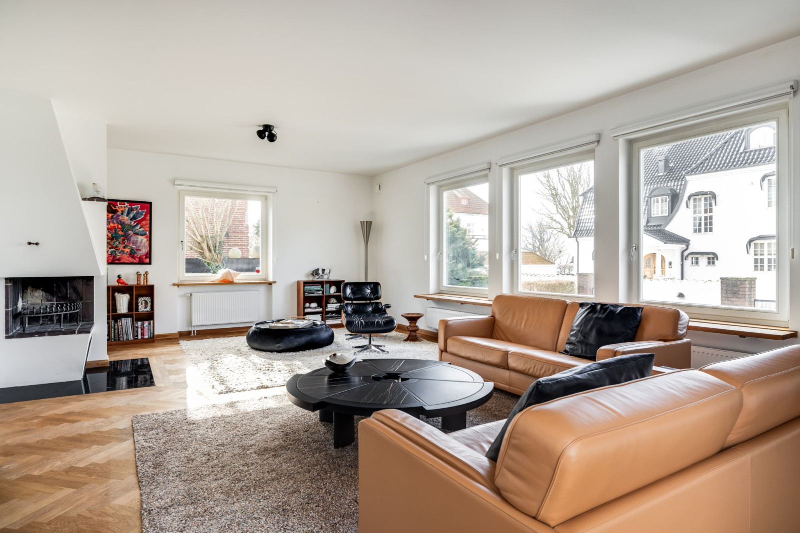 VARDAGSRUM med fiskbensparkett, öppen spis och utgång till altan.