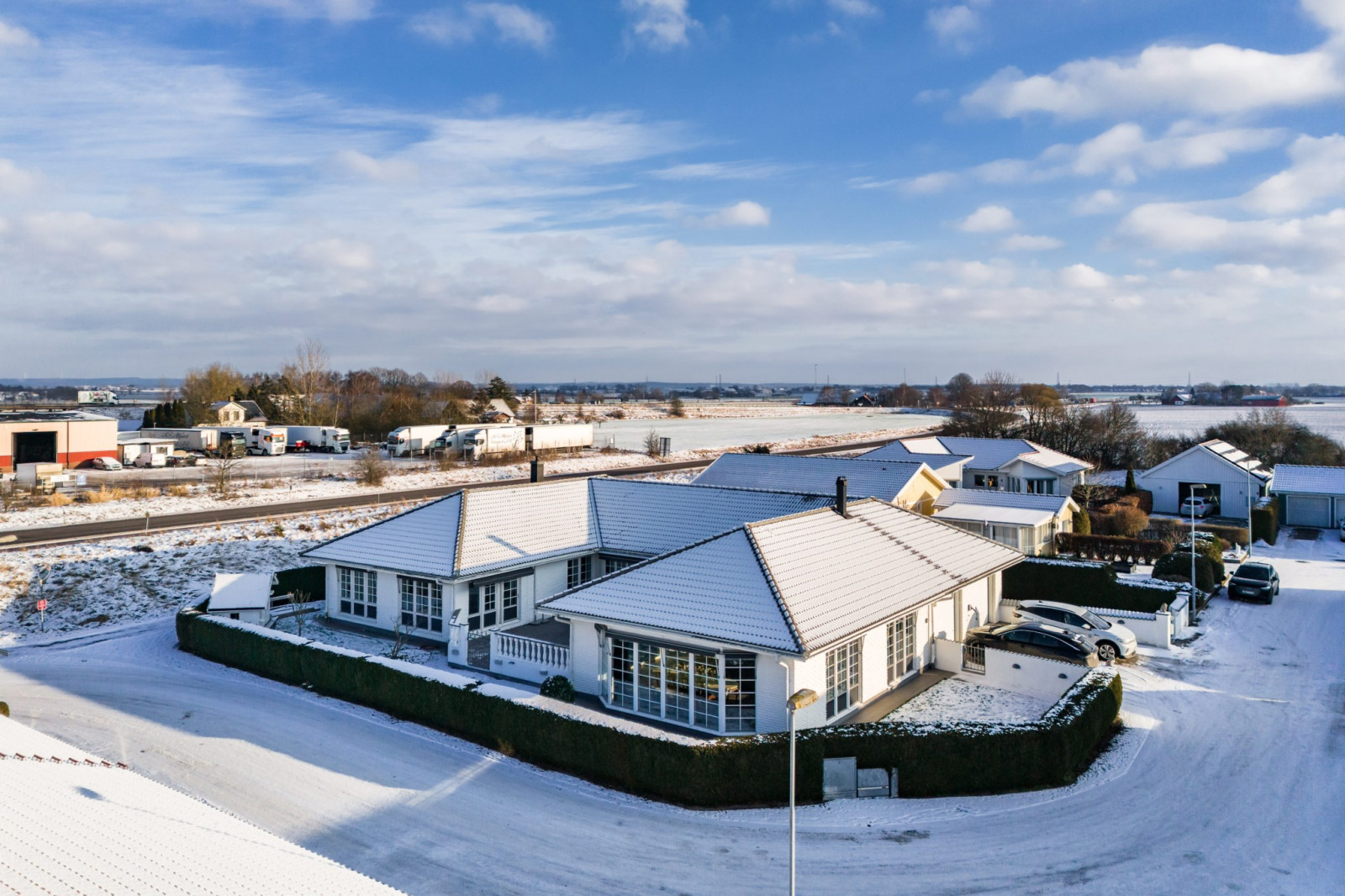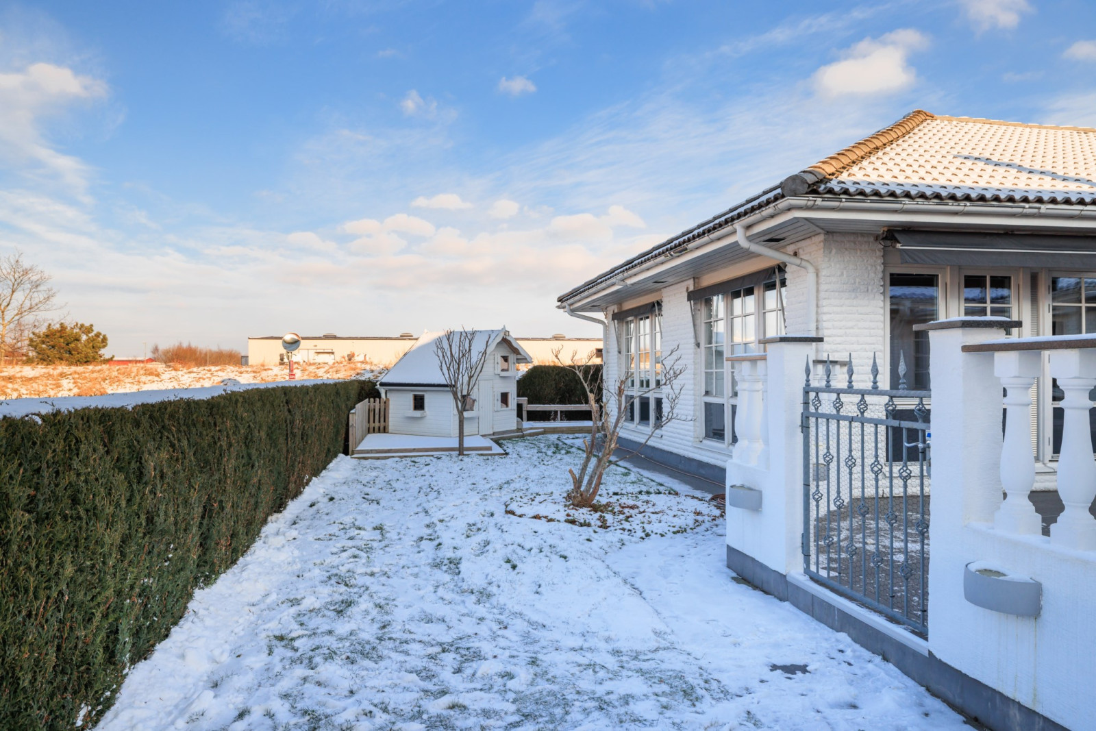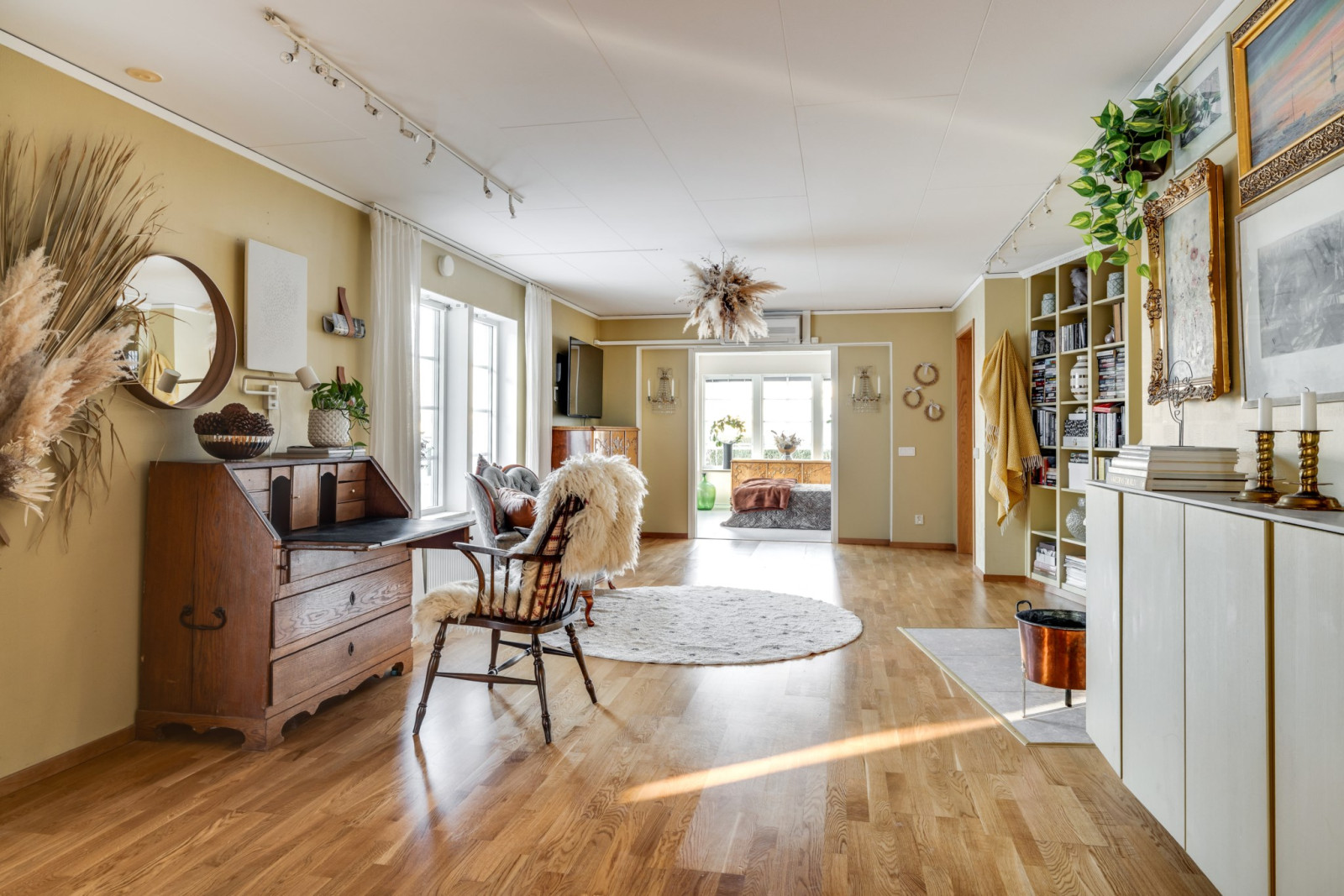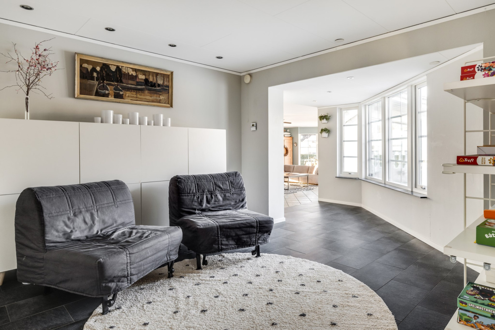 I anslutning till allrummet finns ett tillbyggt rum som ger ännu mer yta och flexibilitet. Här möts du av ett stilrent klinkergolv och generöst ljusinsläpp som skapar en härlig atmosfär. Rummet passar perfekt som sovrum, gästrum eller kanske ett kreativt hobbyrum – möjligheterna är många.