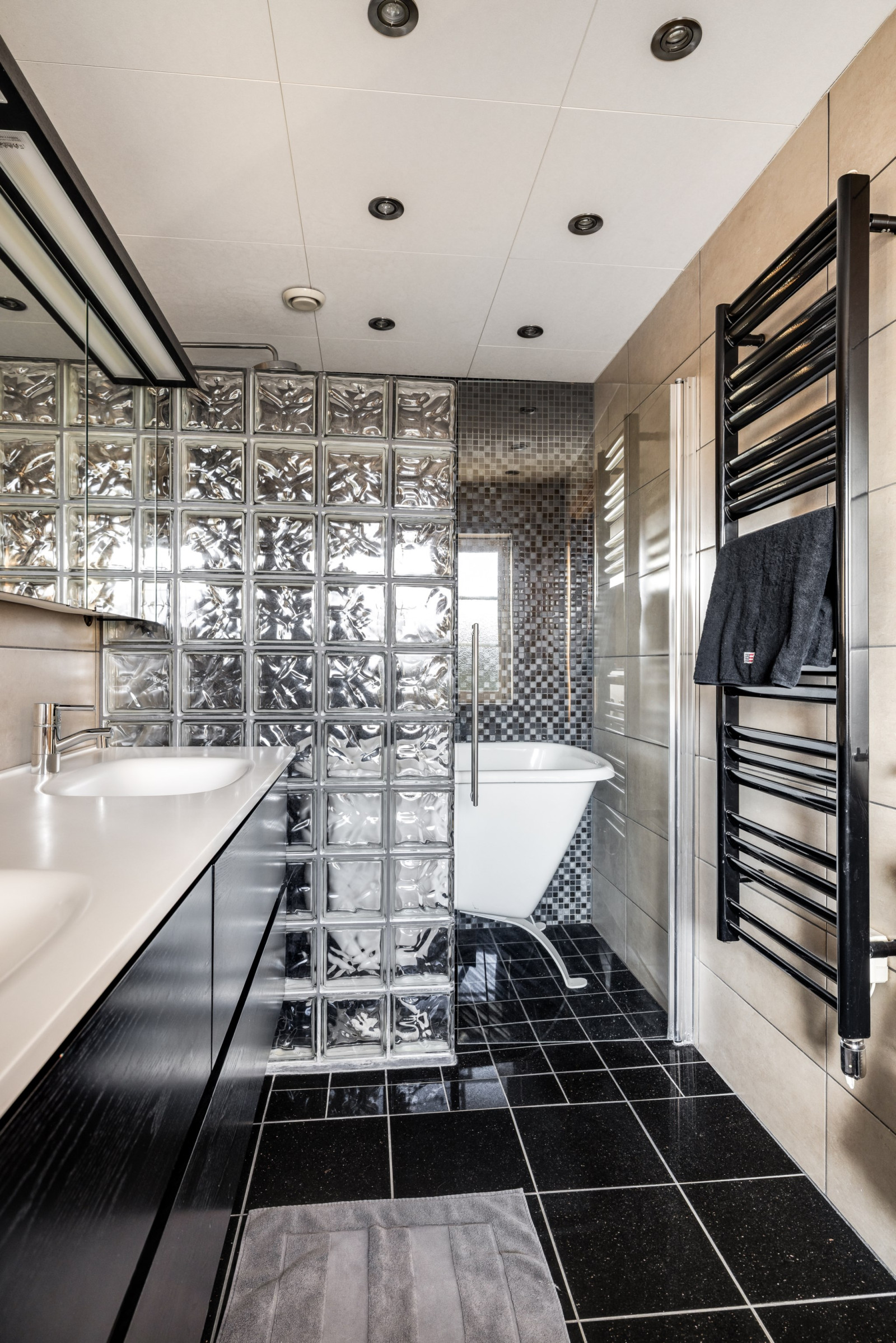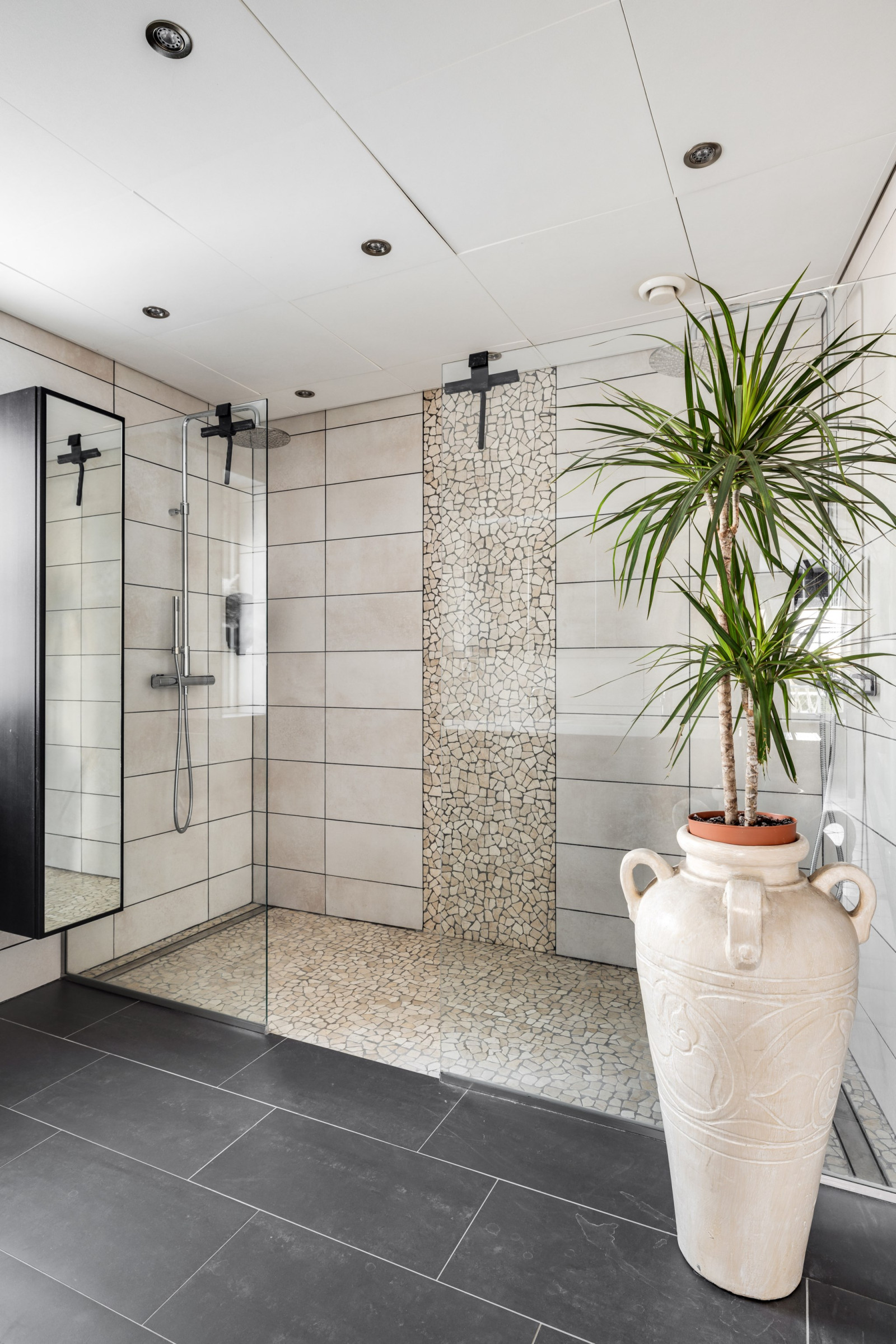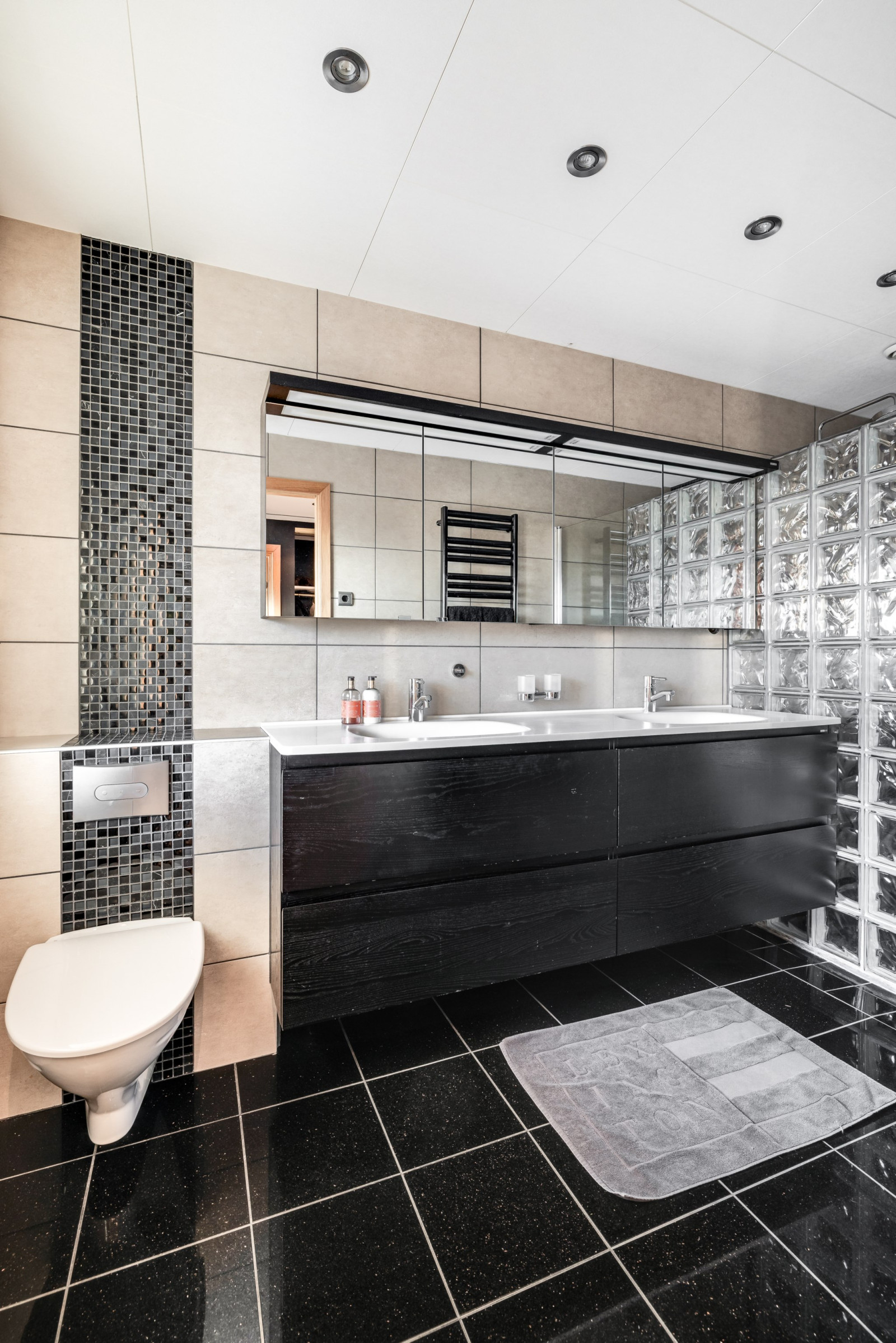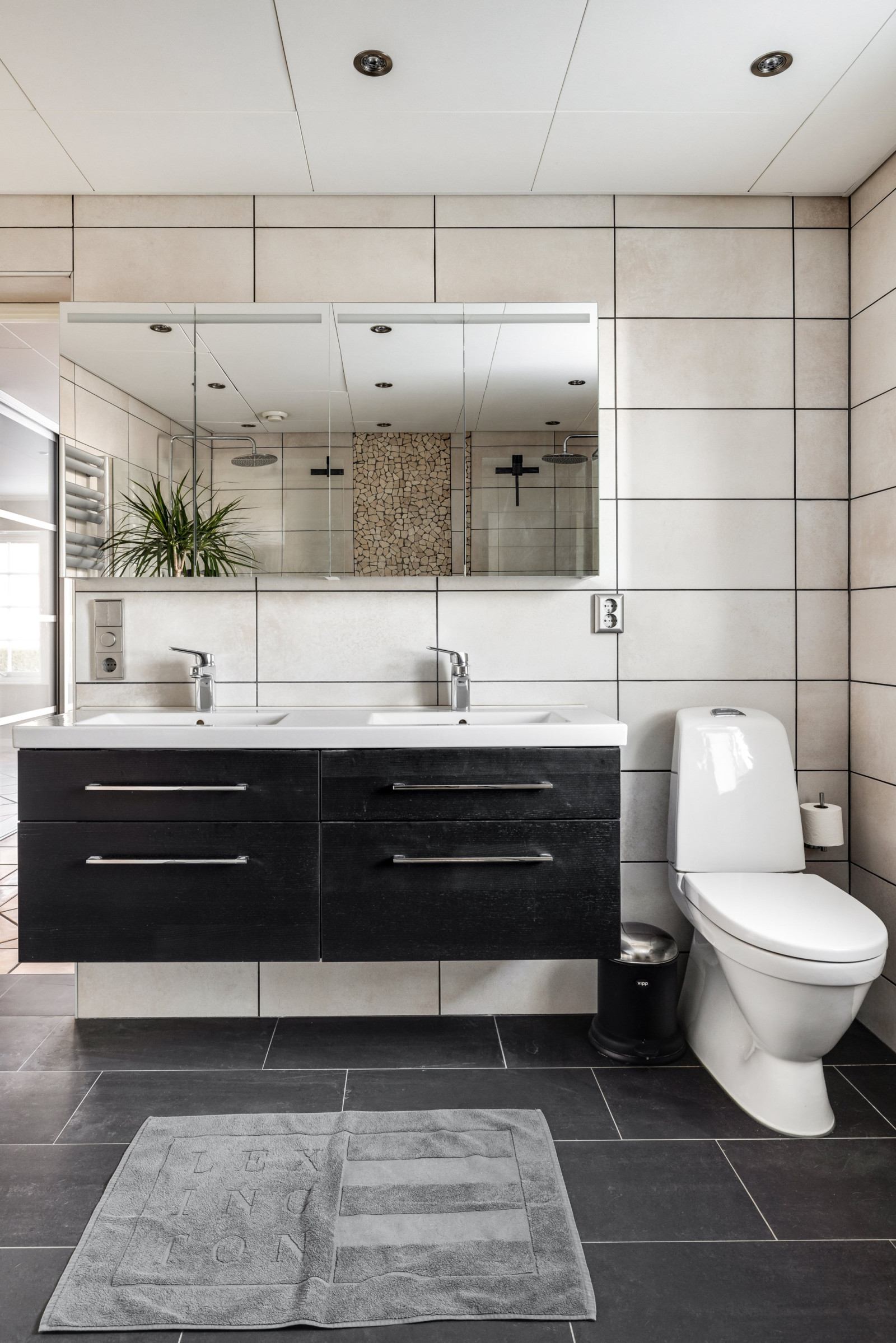Detta en suite-badrum erbjuder generös rymd och exklusiva detaljer. Här finns dubbla handfat, wc och två separata duschar – perfekt för bekvämlighet och funktion i vardagen. Rummet är helkaklat och renoverat 2017 med stilrena materialval som ger en modern och elegant känsla.