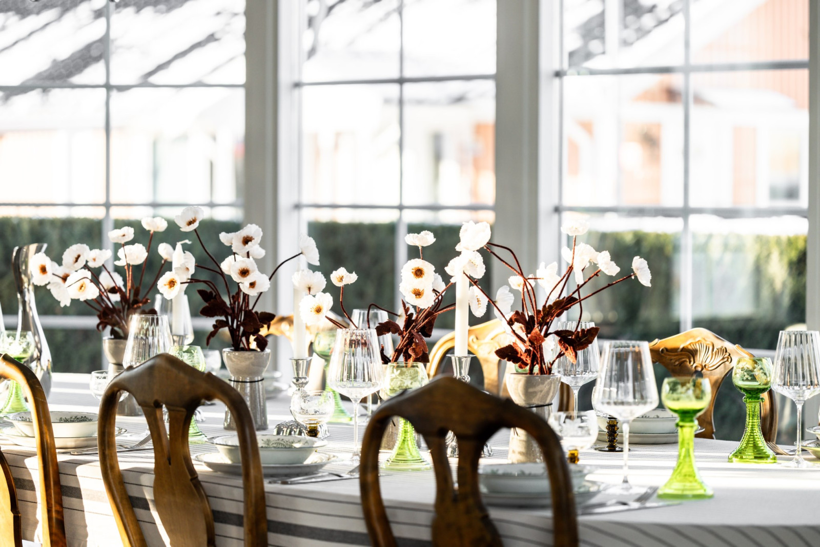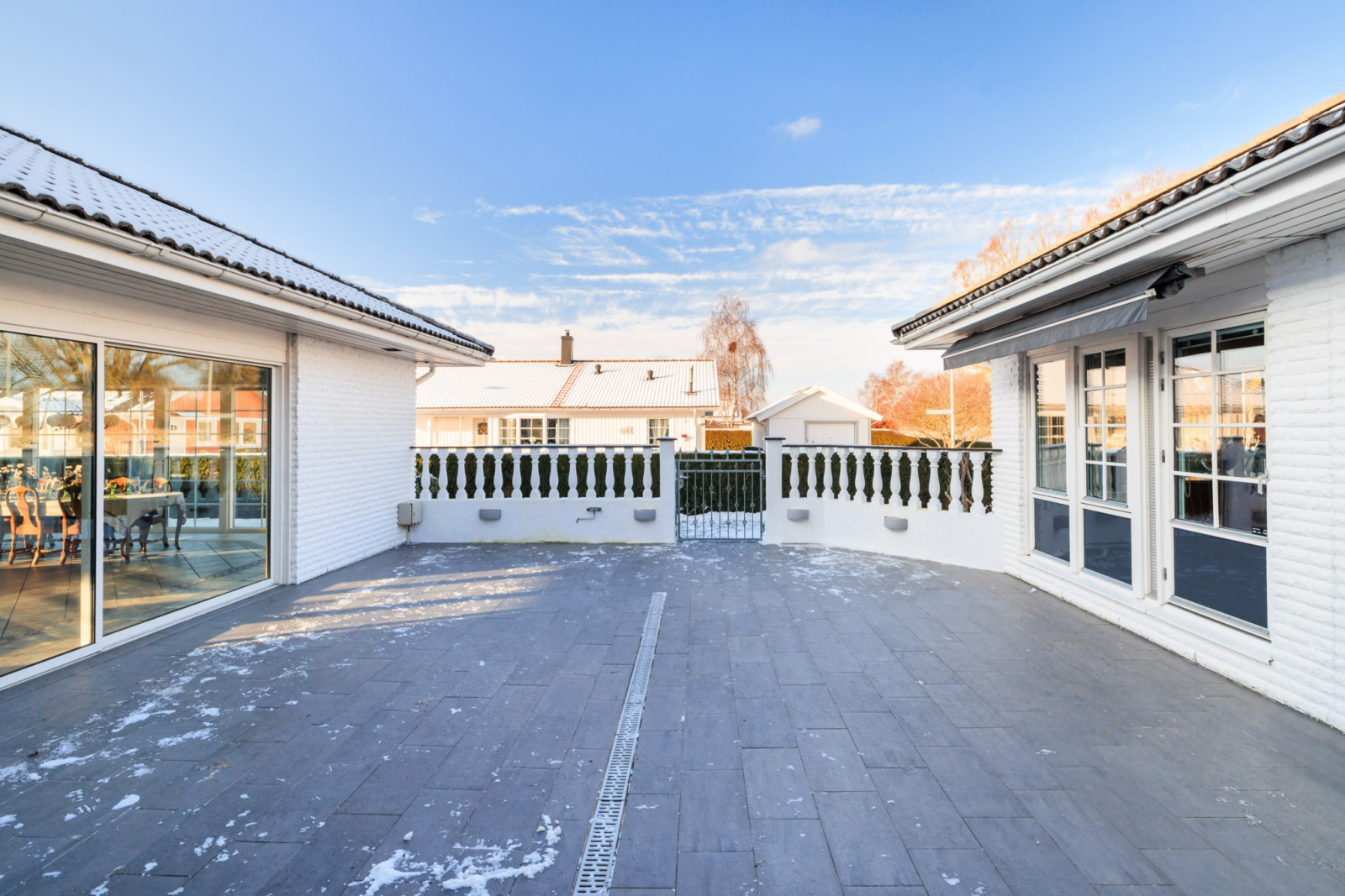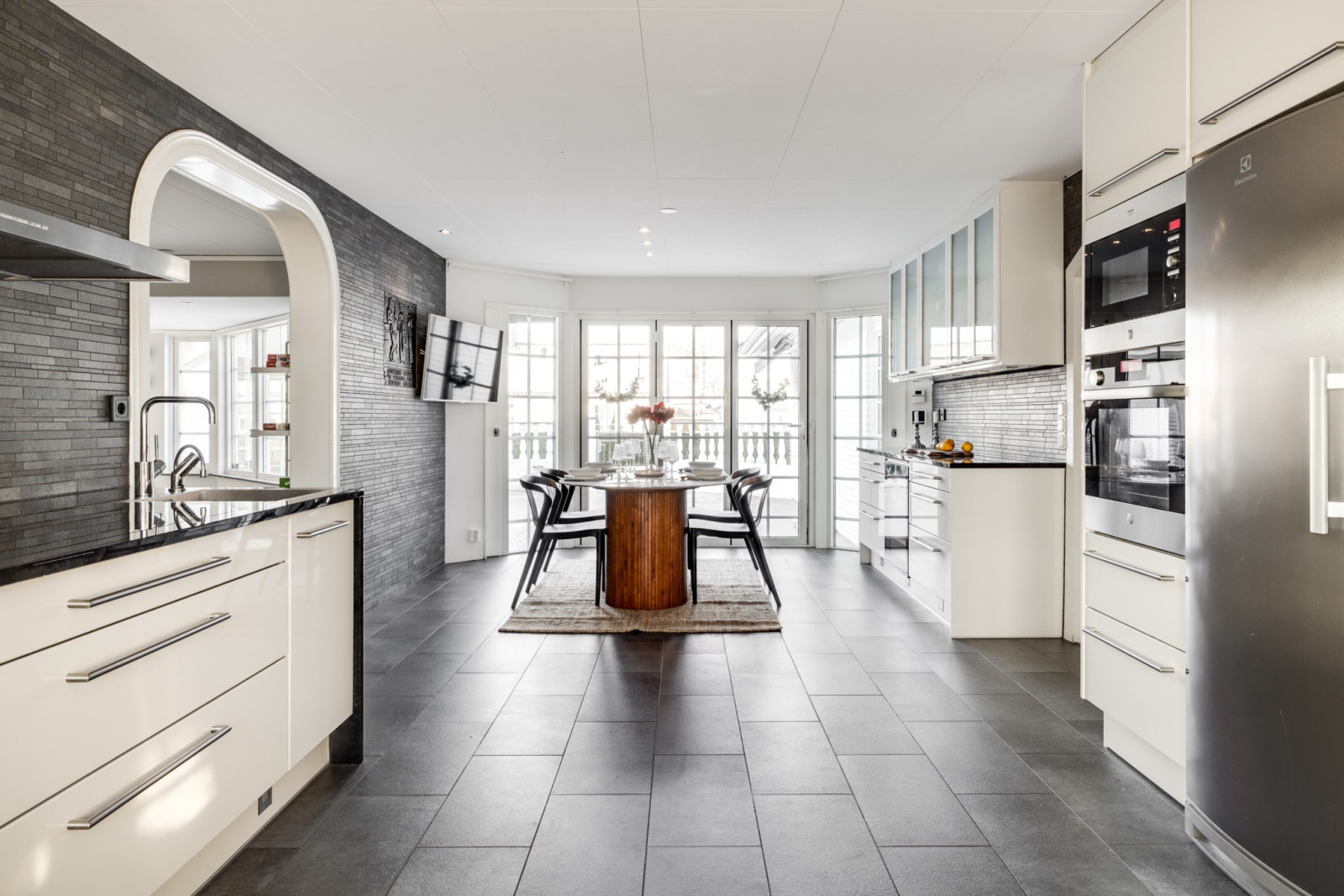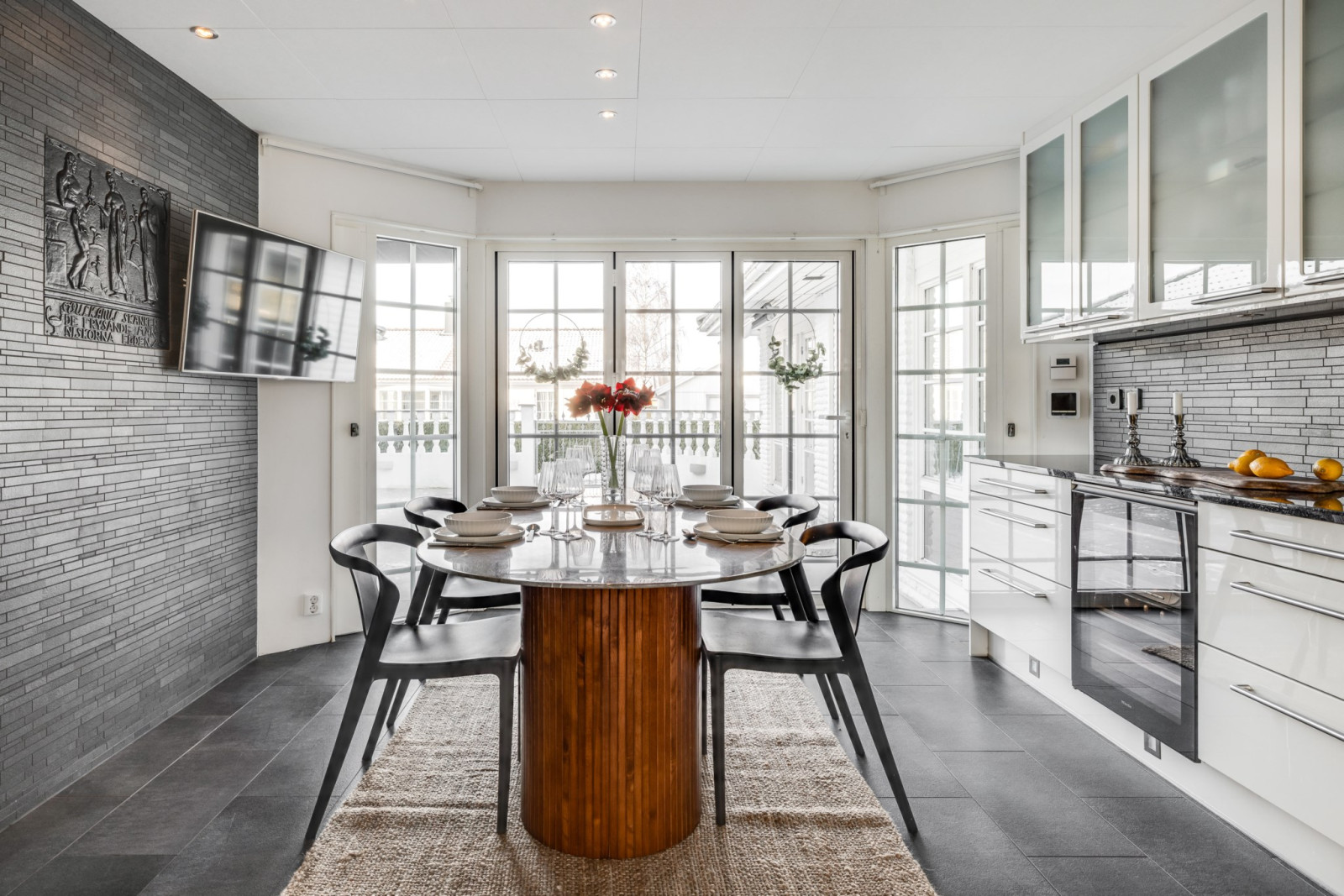 Vid matplatsen finns ett öppningsbart fönsterparti som leder ut till den skyddade, stenlagda uteplatsen – en naturlig förlängning av köket för sommarens måltider och sociala stunder.