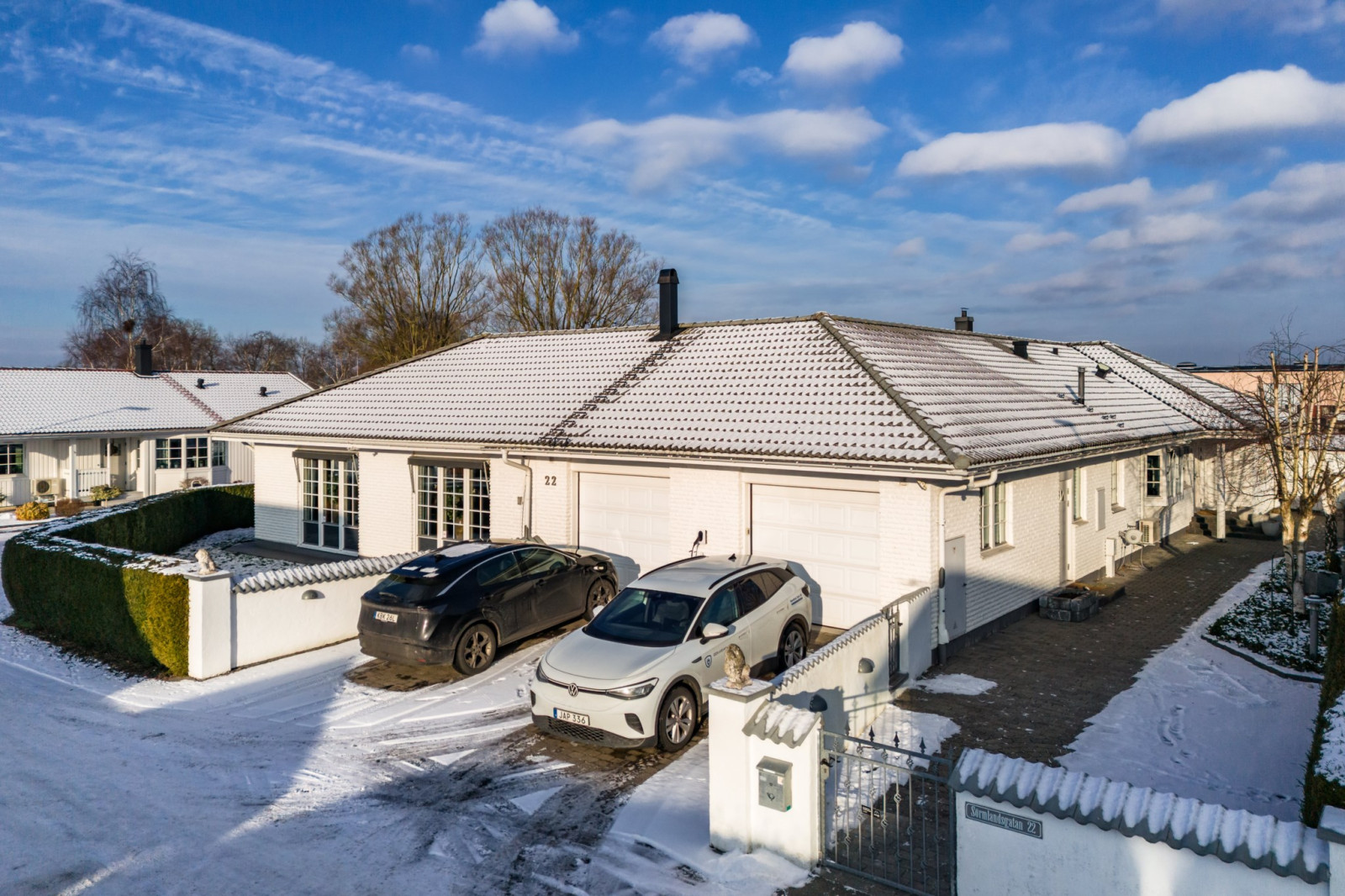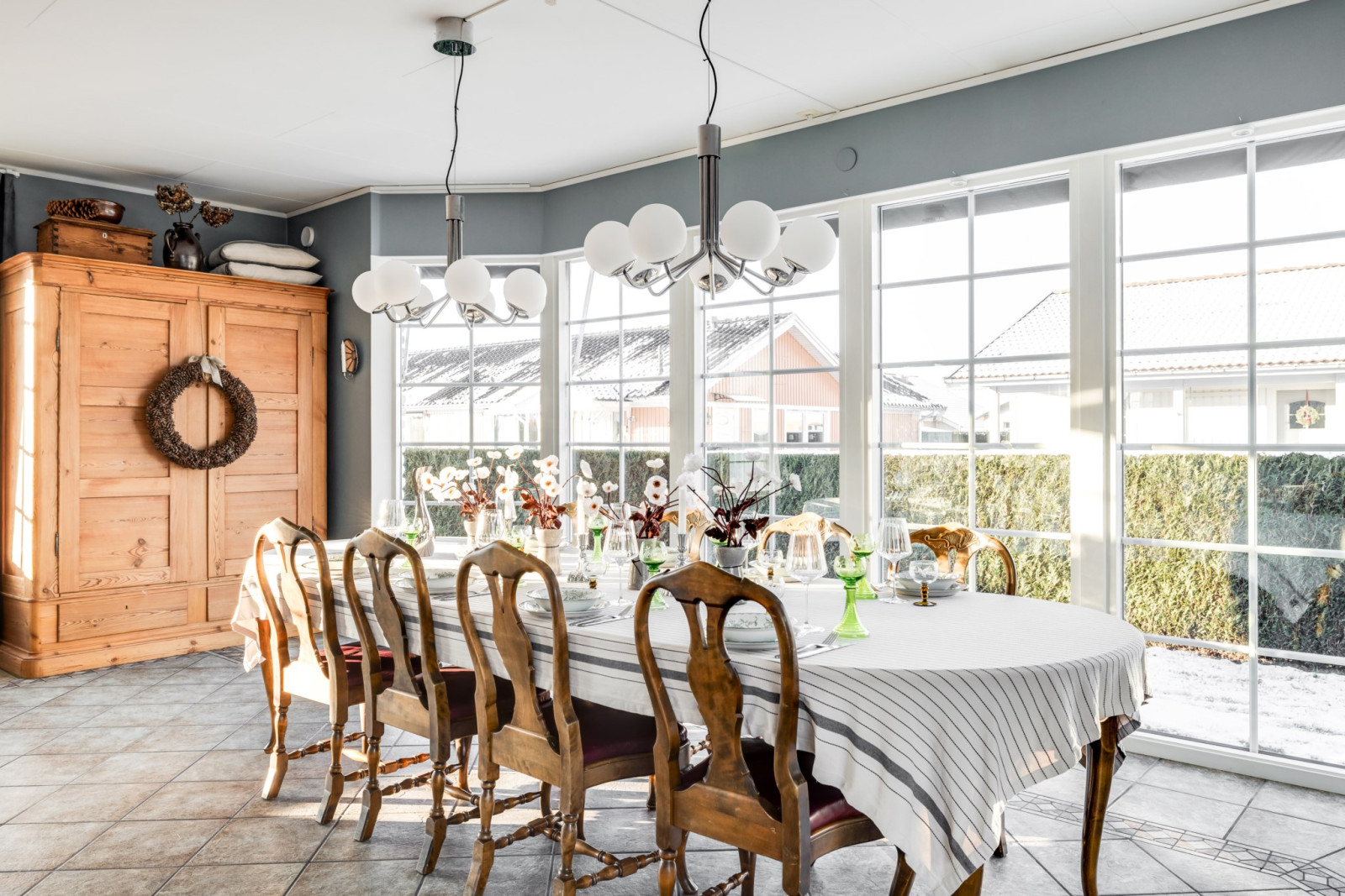 Husets stora, underbara allrum – hela 80 kvm. Detta fantastiska allrum som tillsammans med köket är hjärtat i huset erbjuder generösa ytor för alla livets högtider. Här finns plats för släkt och vänner, stora middagar och festliga tillfällen året runt. De stora skjutdörrspartierna öppnar upp mot den stensatta innergården och skapar en naturlig förlängning av rummet – perfekt för sommarens sammankomster.