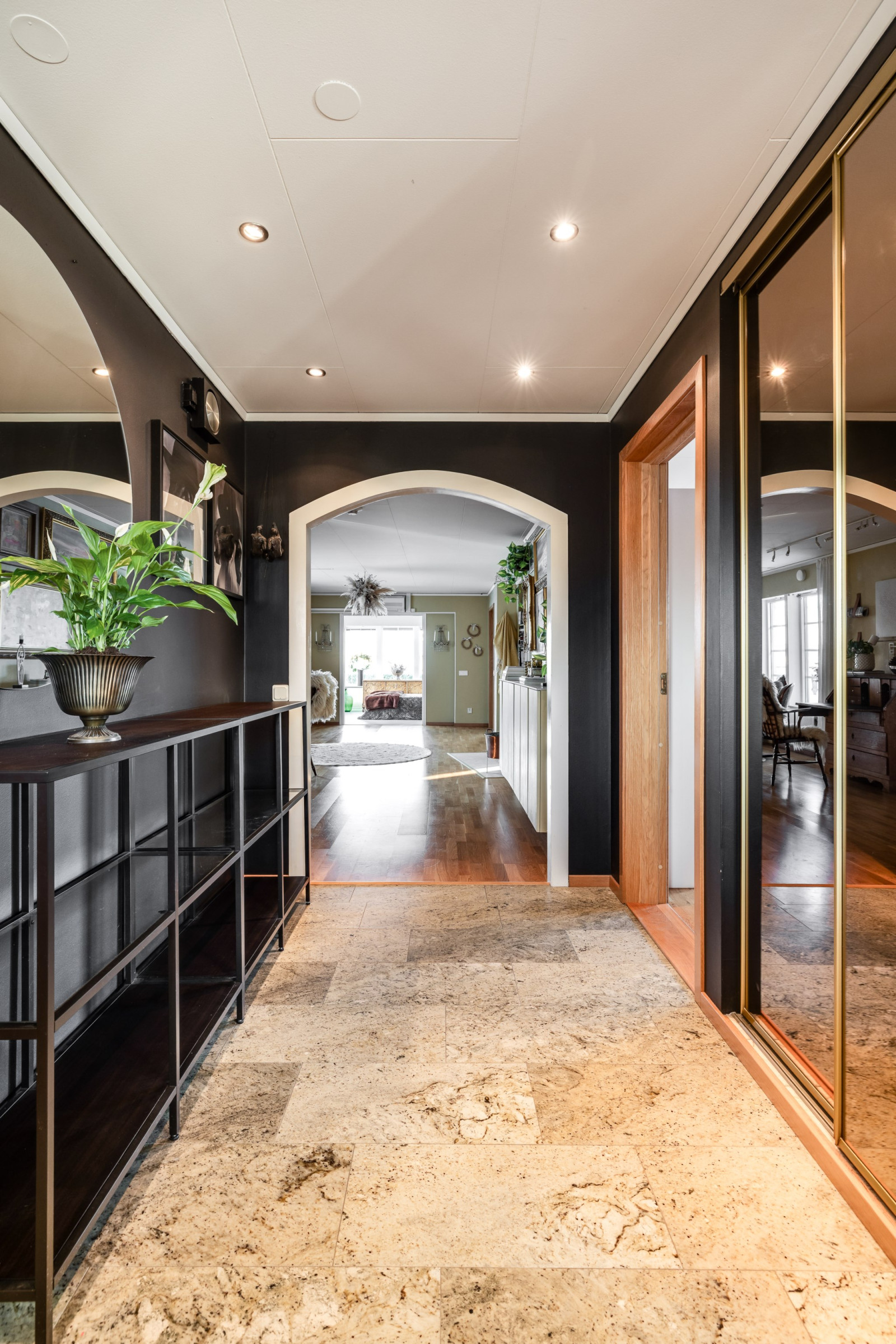 Stilfull entré med generös rymd. Dubbeldörrarna öppnar upp till en rymlig och välkomnande hall med stengolv och gott om plats för möblering. Den öppna planlösningen ger fri sikt genom huset och skapar en härlig känsla av ljus och rymd. I direkt anslutning till hallen finns ett av husets badrum – perfekt placerat för både gäster och familj.