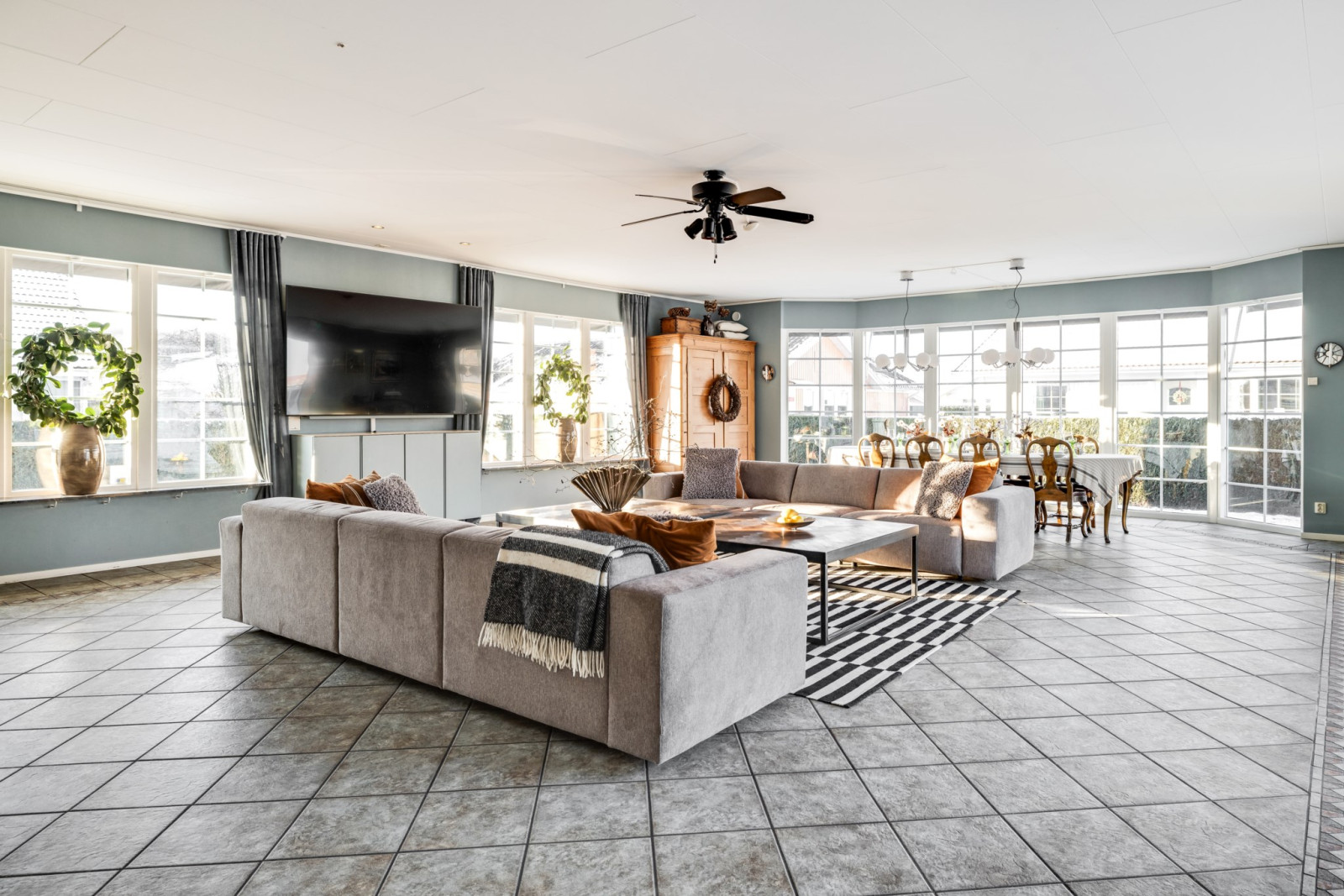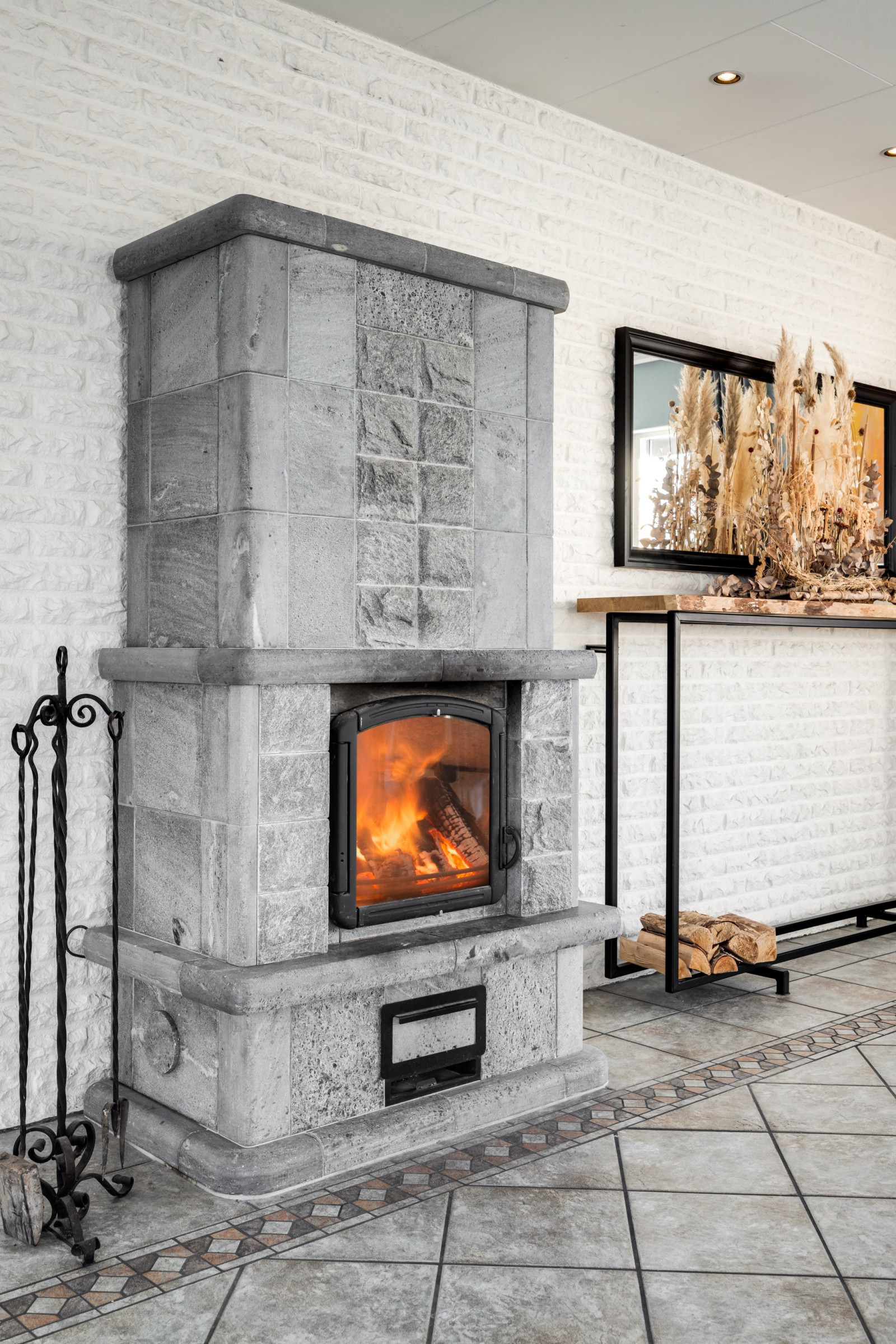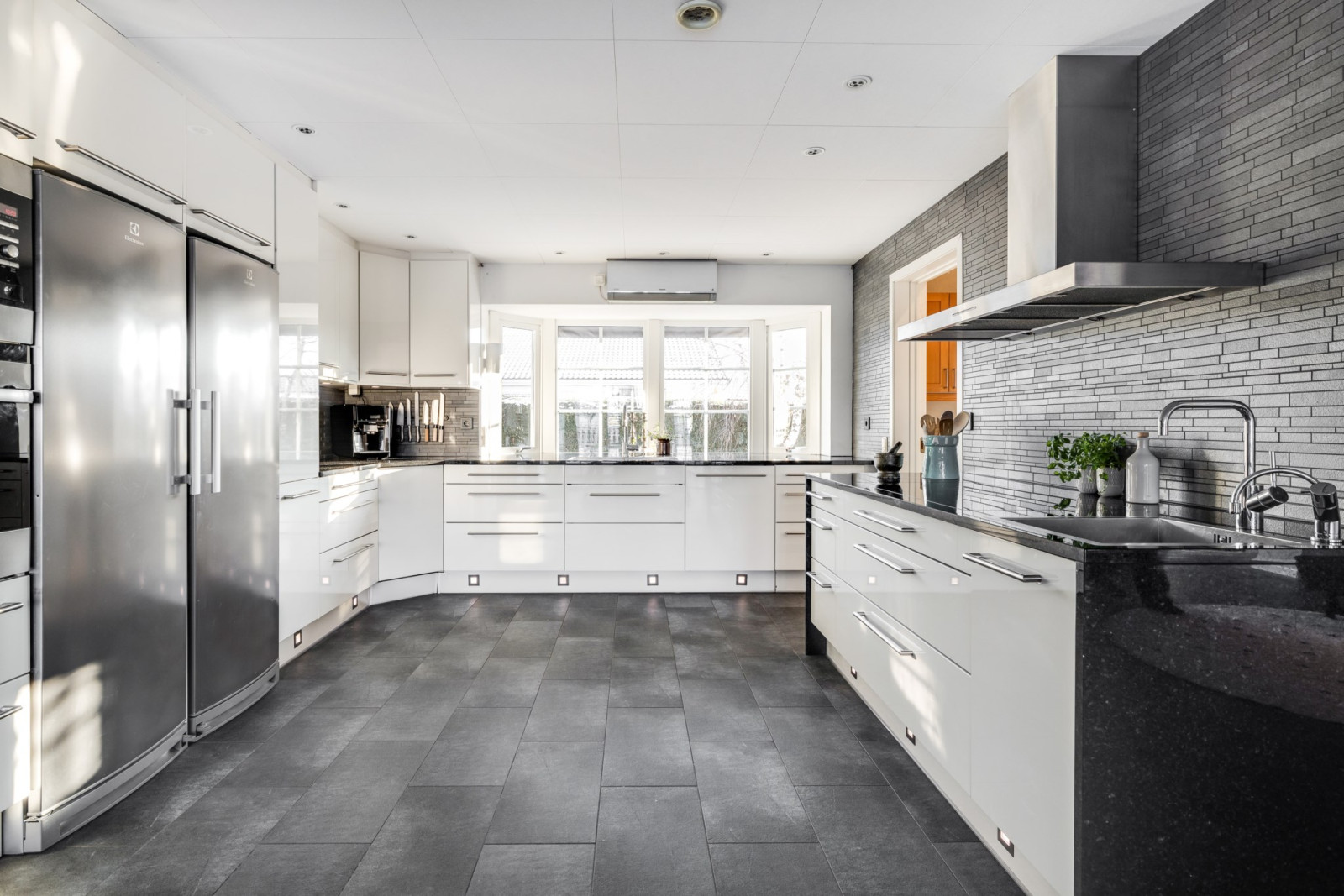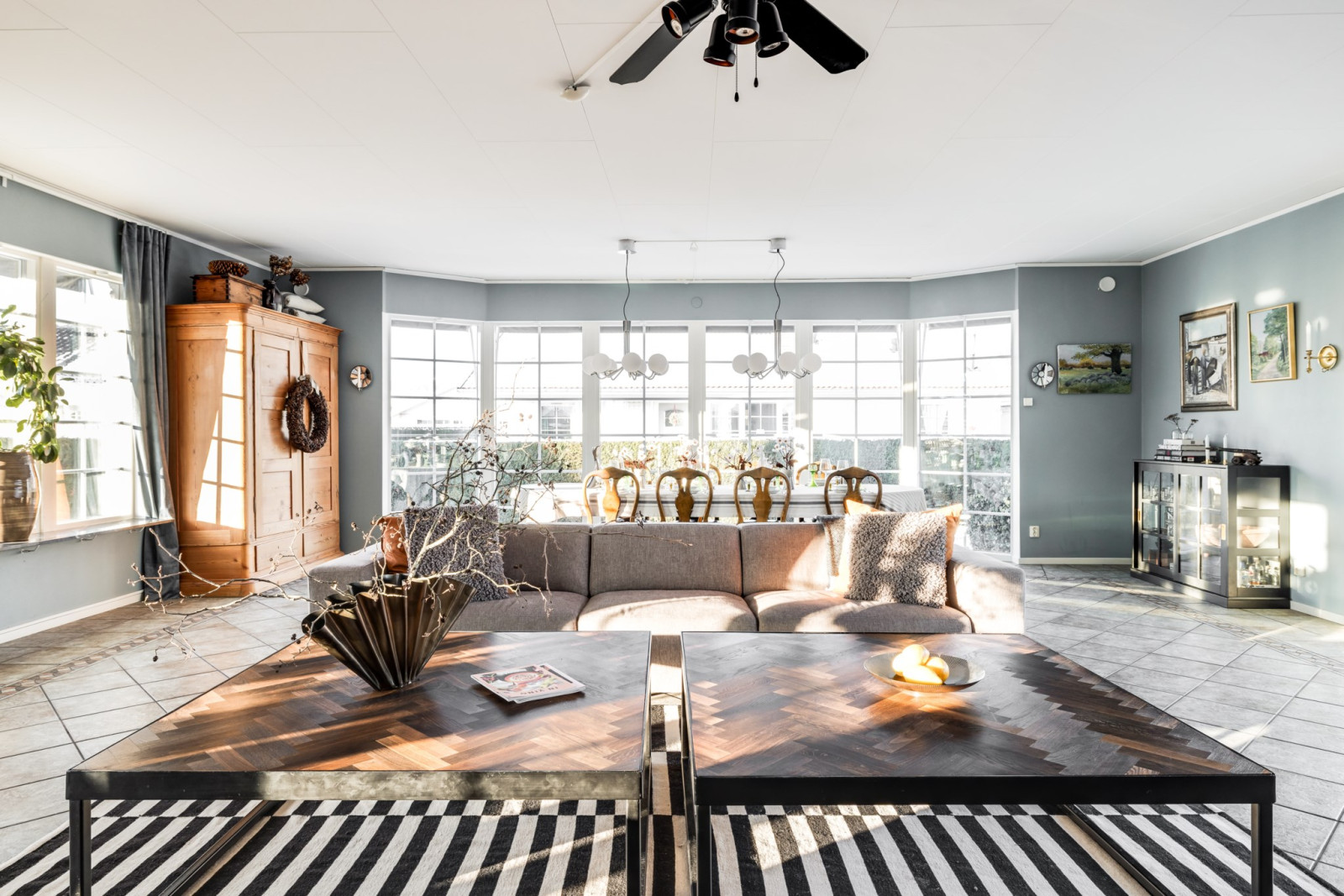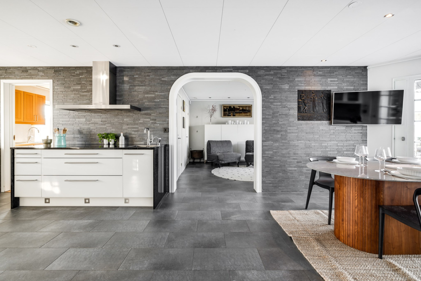 Golvet i elegant klinker ger en stilren känsla och är både praktiskt och tidlöst. Ett rum som verkligen imponerar och ger hemmet karaktär.