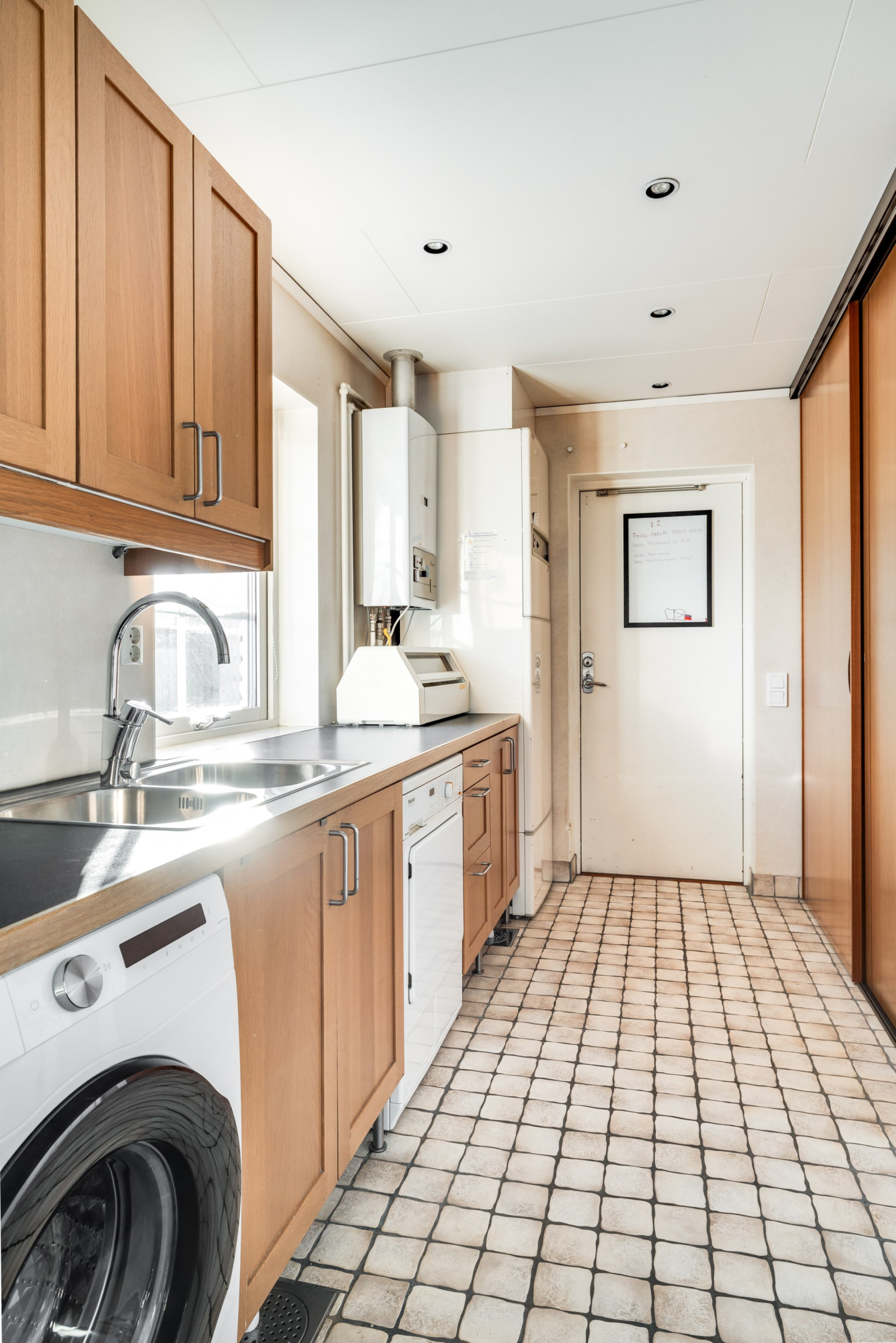 Tvättstugan är utrustad med både tvättmaskin och torktumlare och erbjuder en funktionell arbetsyta för vardagens sysslor. Härifrån har du direktaccess till garage och groventré – perfekt för en smidig vardag och enkel hantering av tvätt, ytterkläder och förvaring. Utgång till garage och groventré.