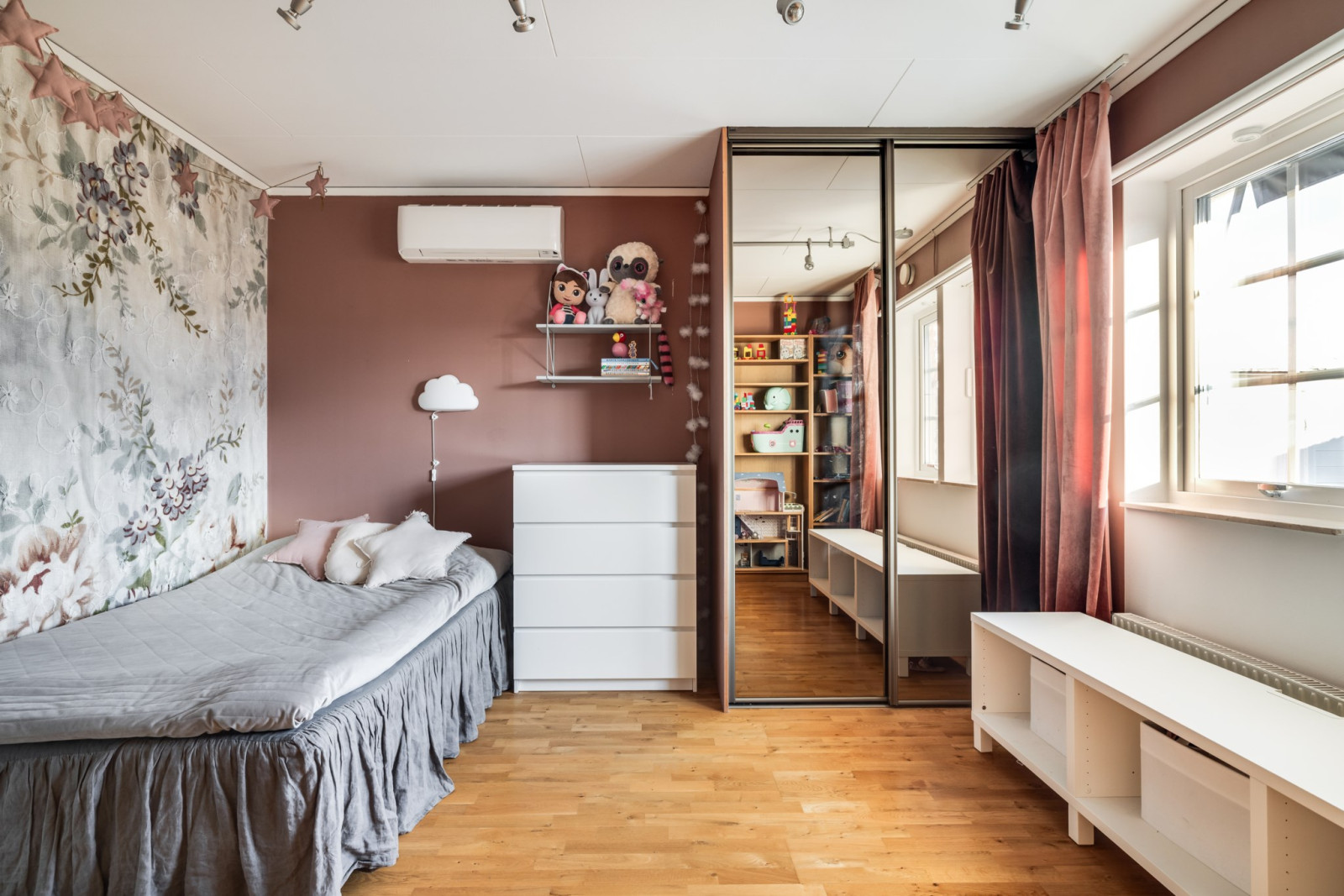 Detta rum, som tidigare var ett sovrum, har vid ombyggnaden fått en perfekt placering för både lek och lugn. Här finns gott om plats för barnens lekrum, en mysig läshörna eller ett praktiskt hemmakontor.