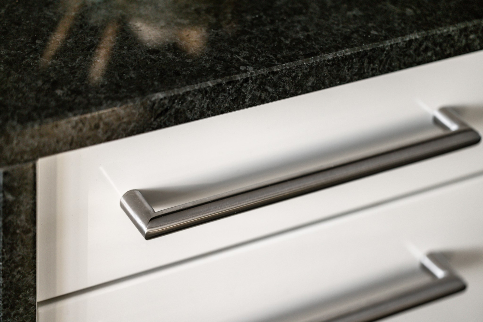 Detta kök imponerar med sin generösa yta och genomtänkta design. Här finns gott om förvaring och arbetsytor, perfekt för dig som älskar att laga mat och umgås. Köksinredningen från HTH kombineras med eleganta bänkskivor i svart granit som ger en stilren och exklusiv känsla.