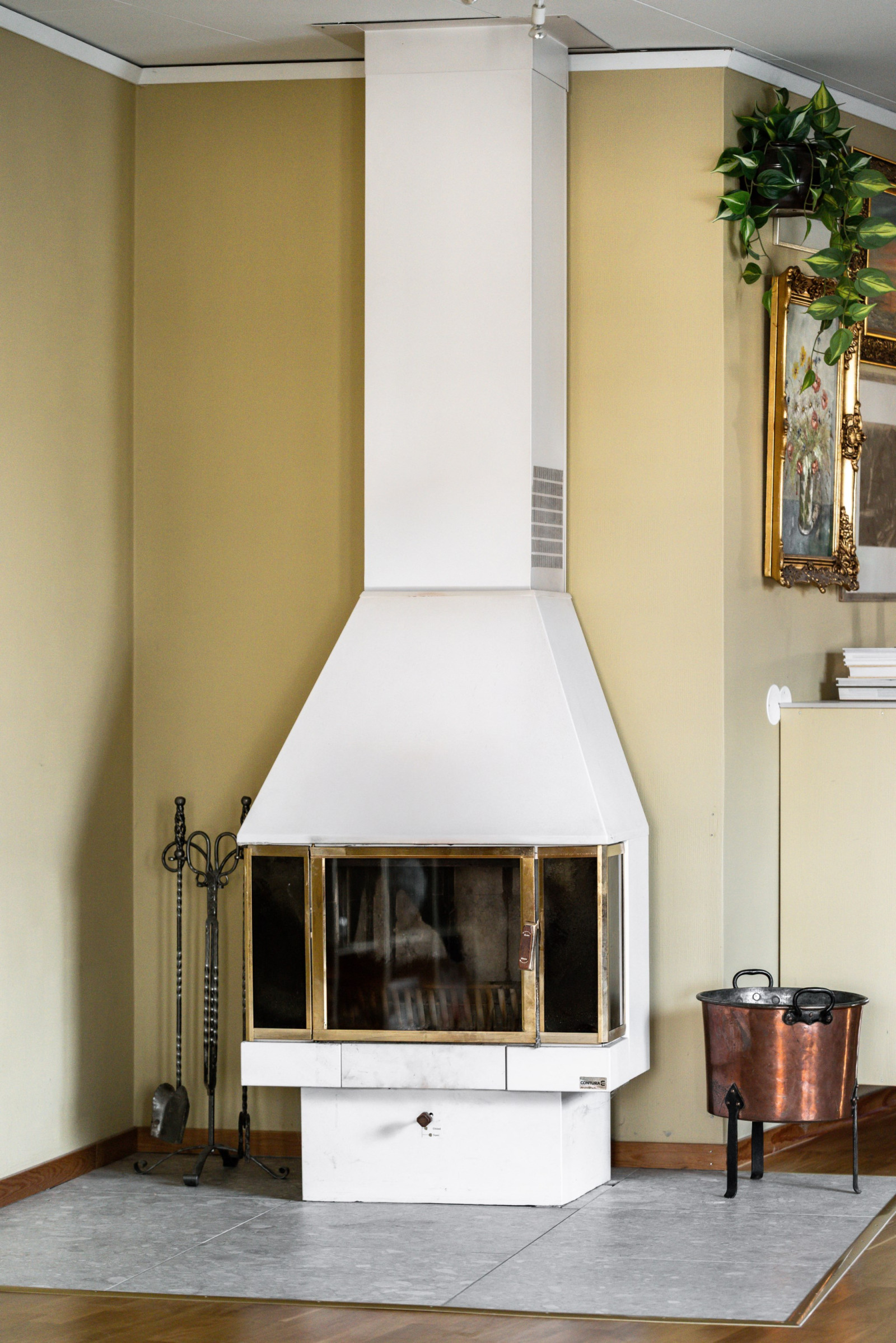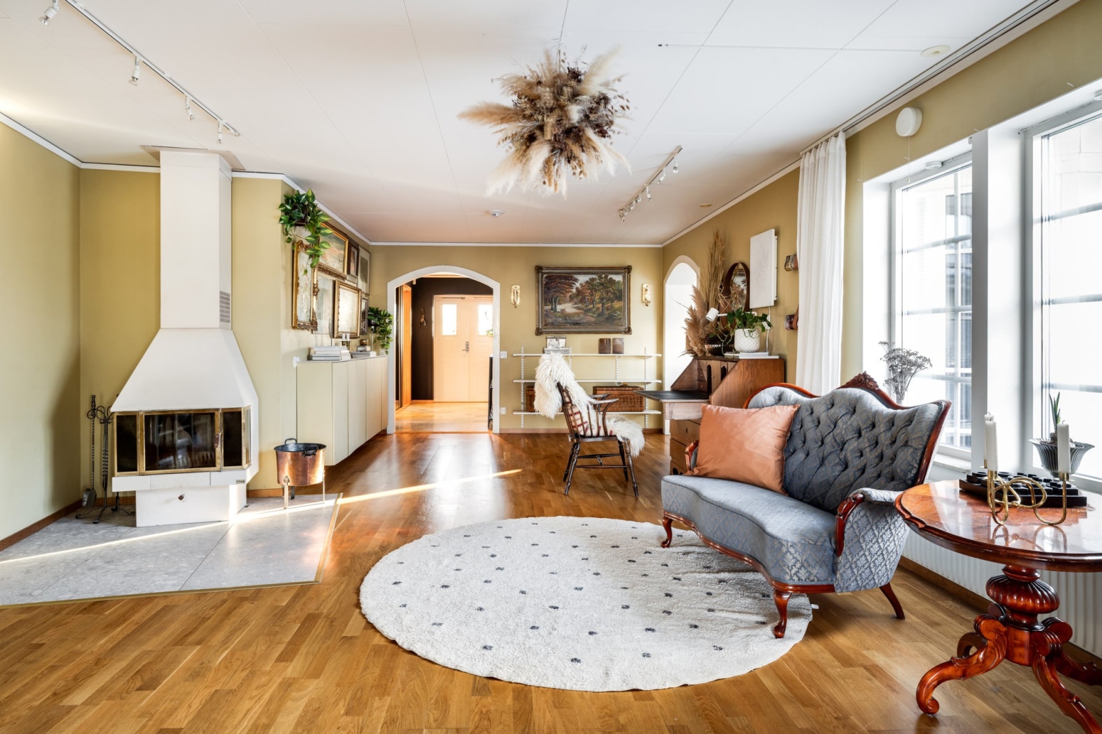 Rummet har dessutom en centralt placerad braskamin som skapar en varm och inbjudande atmosfär, perfekt för både vardag och fest. Ett flexibelt utrymme som ger hemmet extra karaktär och funktion.