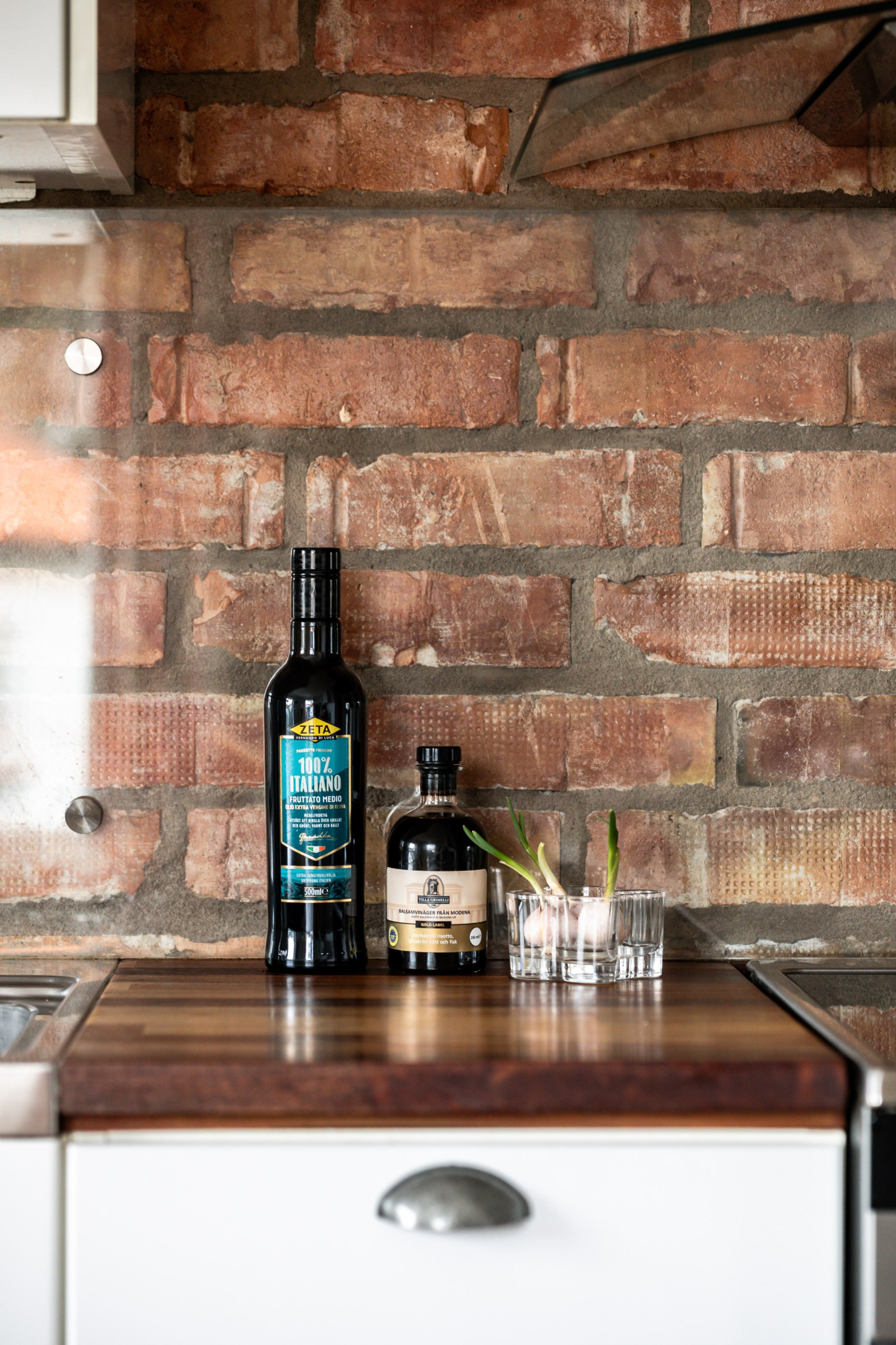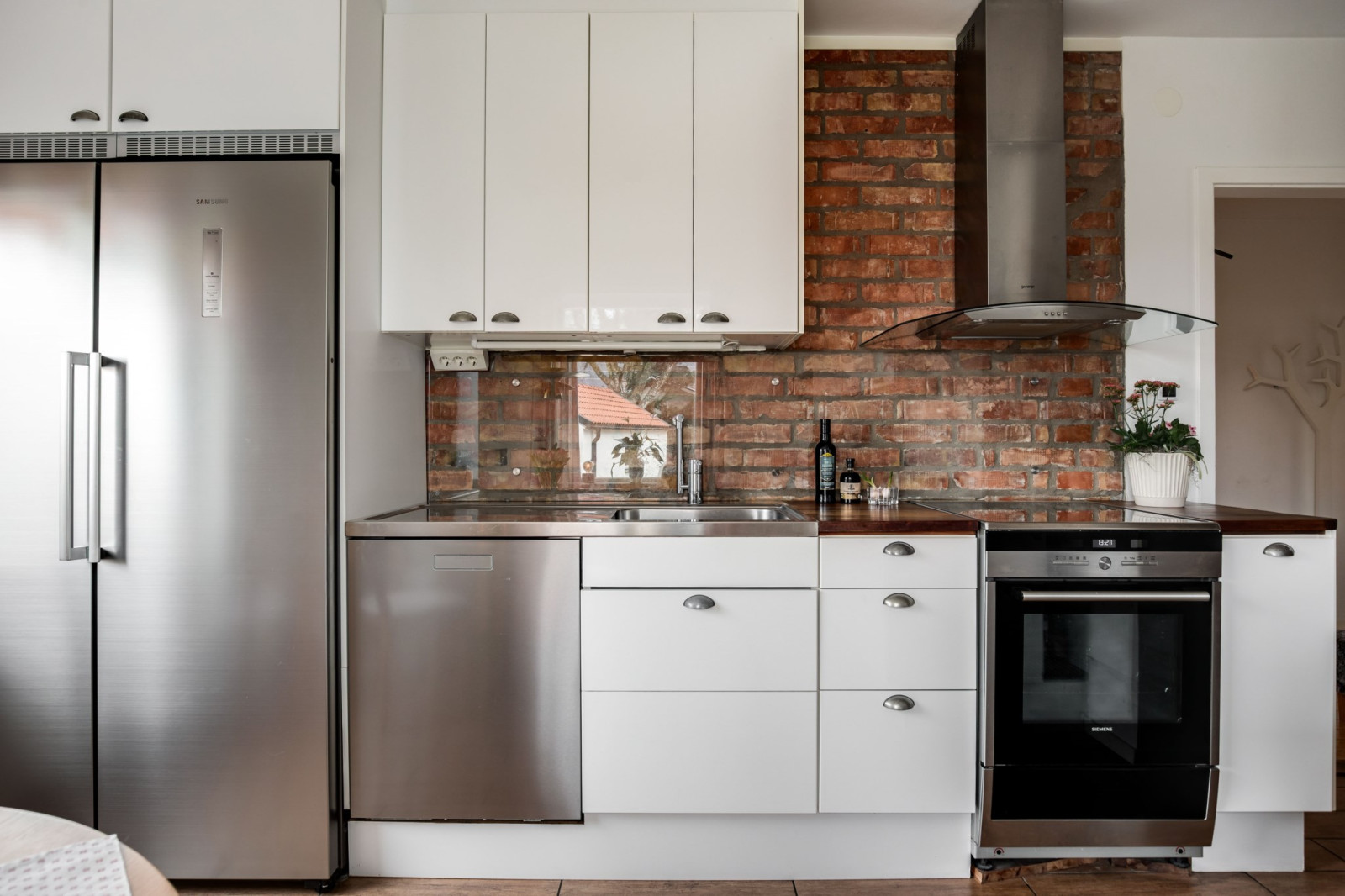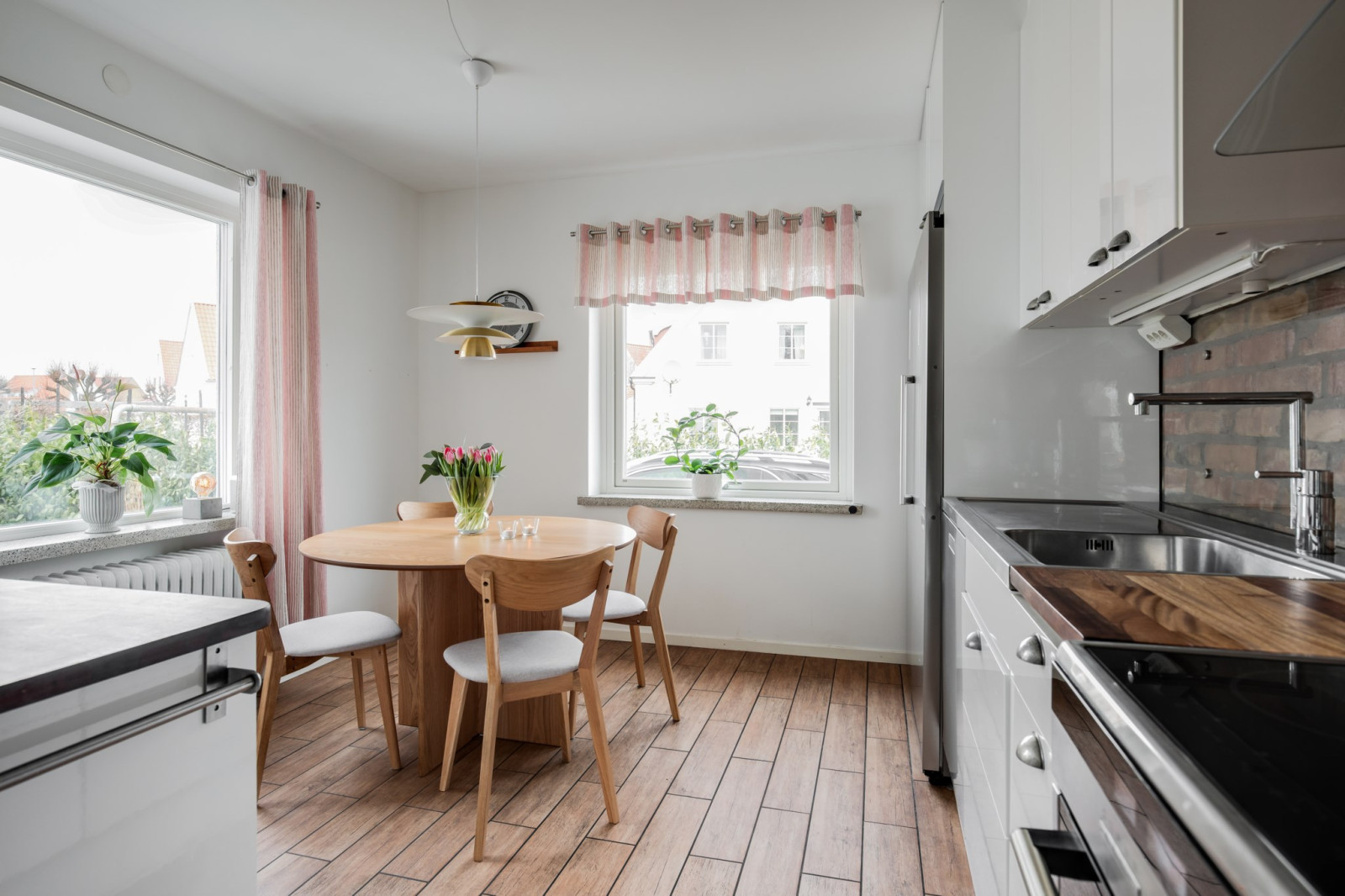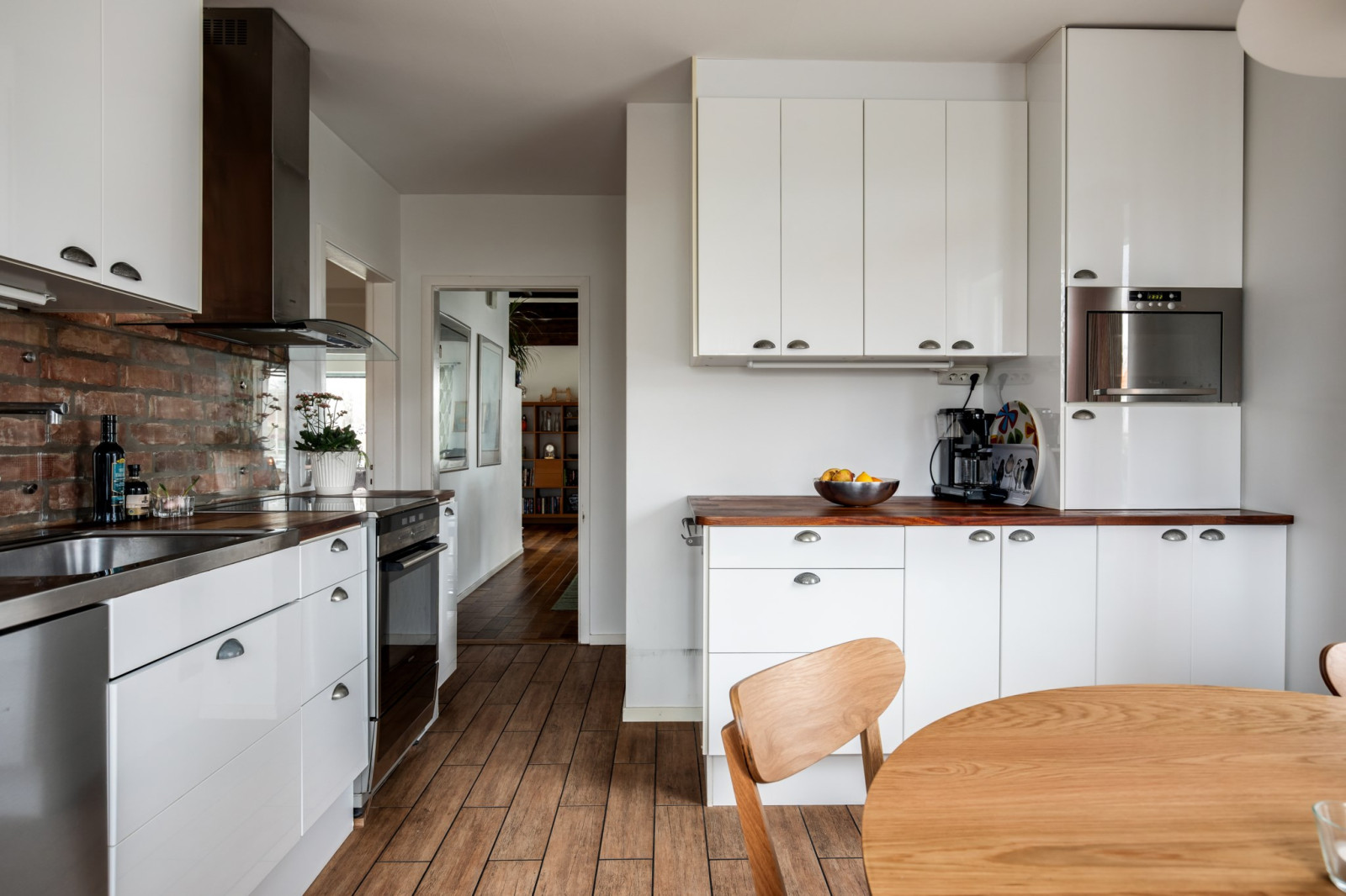 Trivsamt kök placerat i husets ena gavel med plats för matbord och utsikt mot trädgården. En fin tegelvägg har tagits fram vilket ger rummet en varm och personlig karaktär. Köket erbjuder bra arbetsytor och goda förvaringsmöjligheter, vilket gör det både praktiskt och funktionellt i vardagen.
