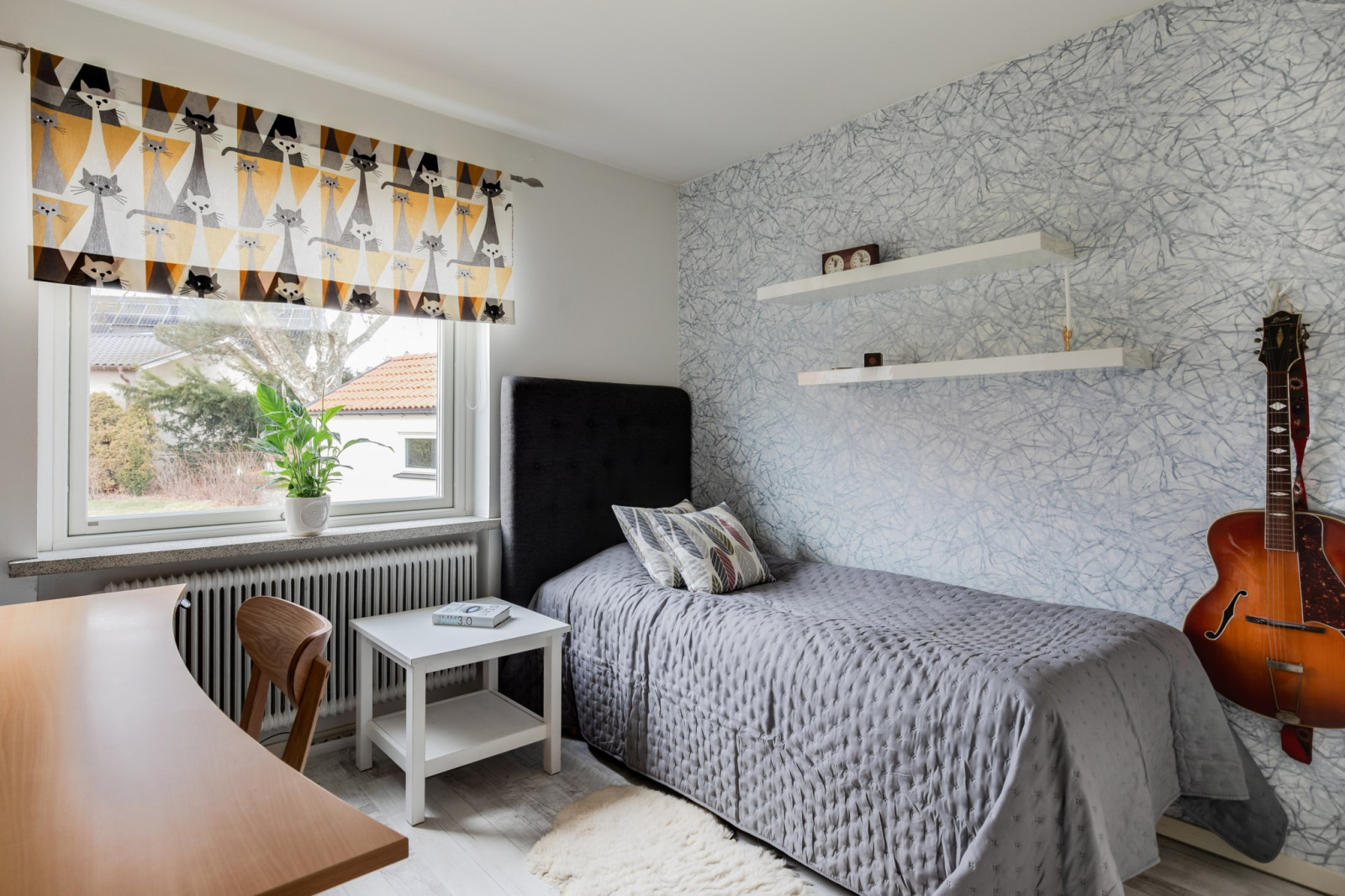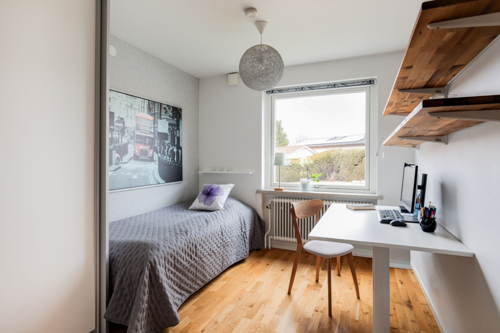 Välplanerat sovrum som passar perfekt som barnrum, hemmakontor eller gästrum. Fint läge mot husets baksida med utsikt över grönskan och utan insyn, vilket skapar en lugn och rofylld miljö.