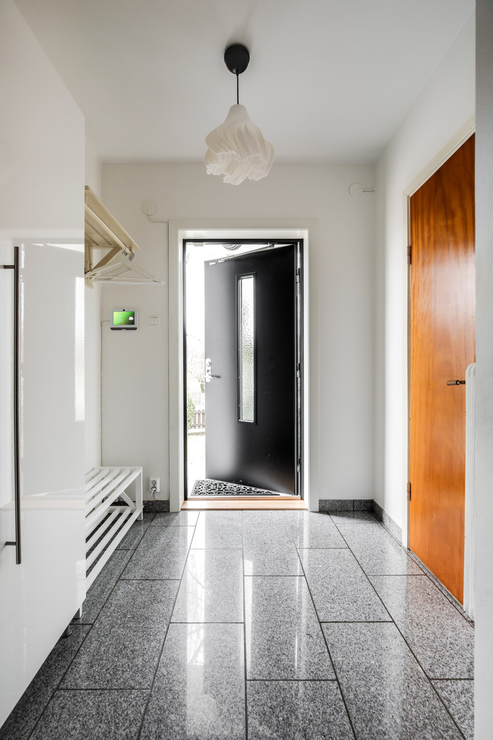 Välkomnande hall med klinkergolv och plats för avhängning av ytterkläder. Praktisk entré som ger ett trevligt första intryck av bostaden.