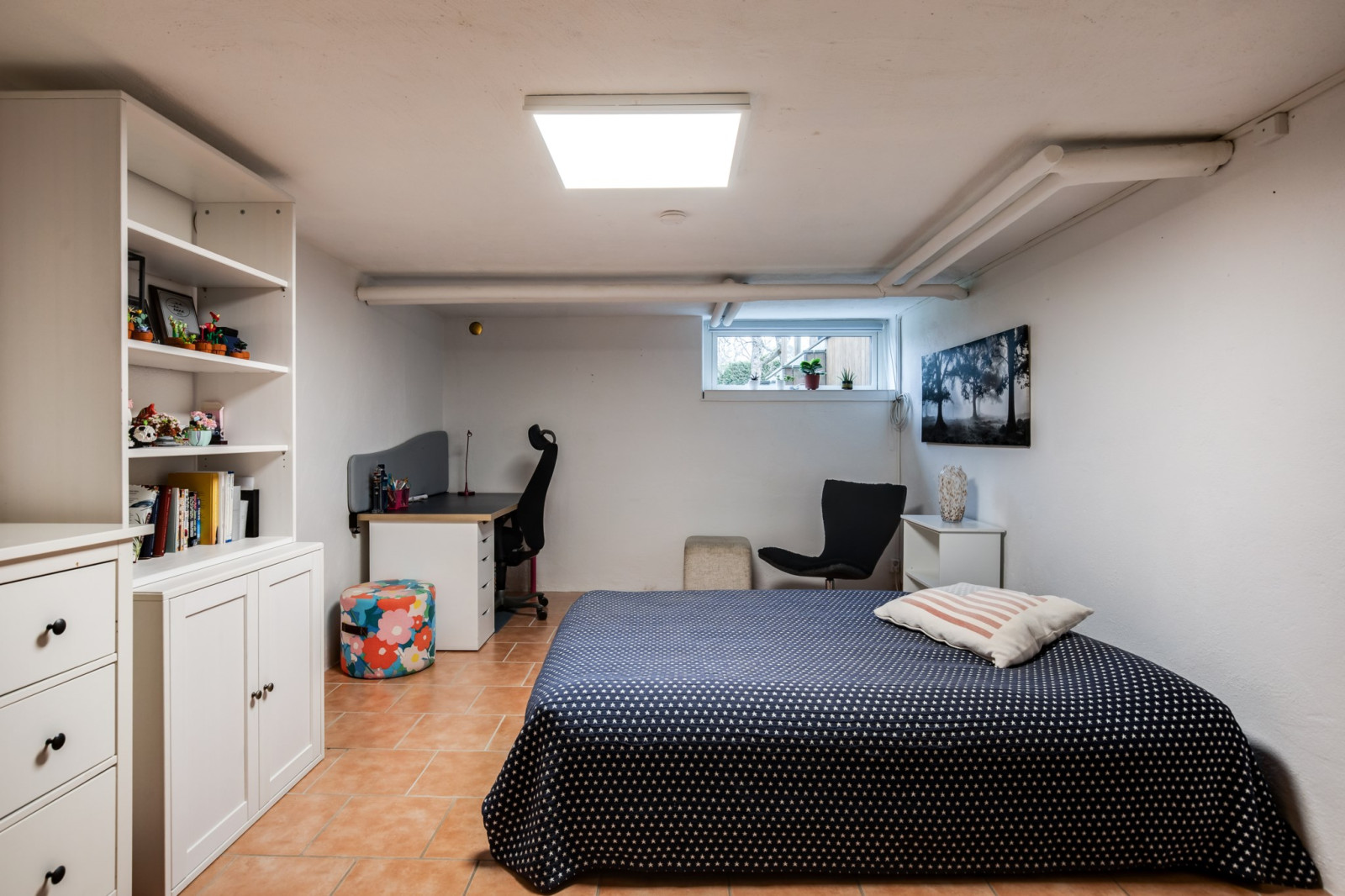 Rymligt och användbart rum i källaren med fönster som ger naturligt ljusinsläpp. Rummet har en bra storlek med plats för flera olika typer av möblemang, exempelvis säng, skrivbord och förvaring. Passar utmärkt som tonårsrum, gästrum eller hobbyrum.