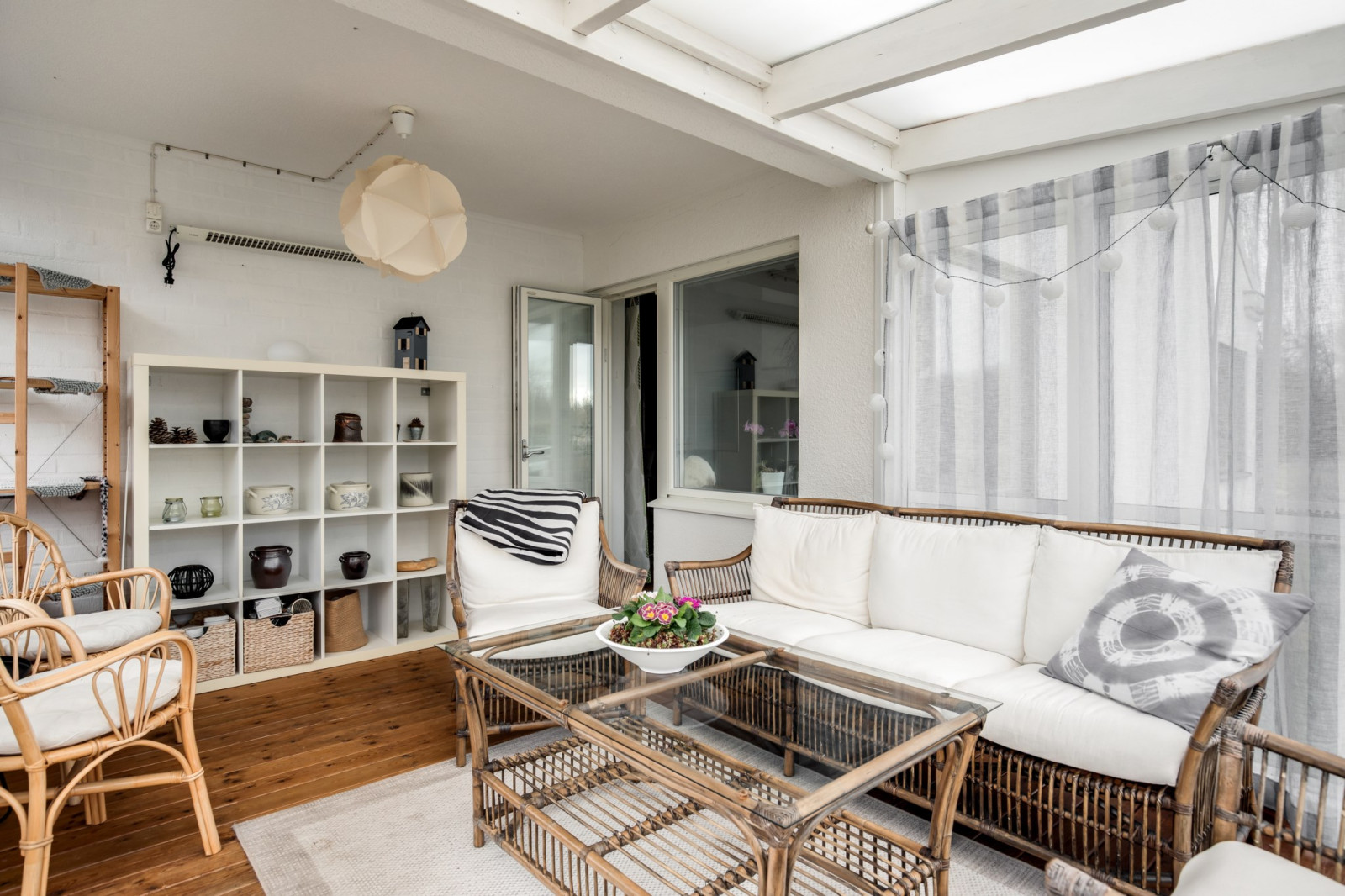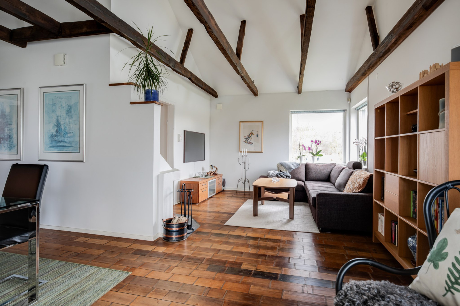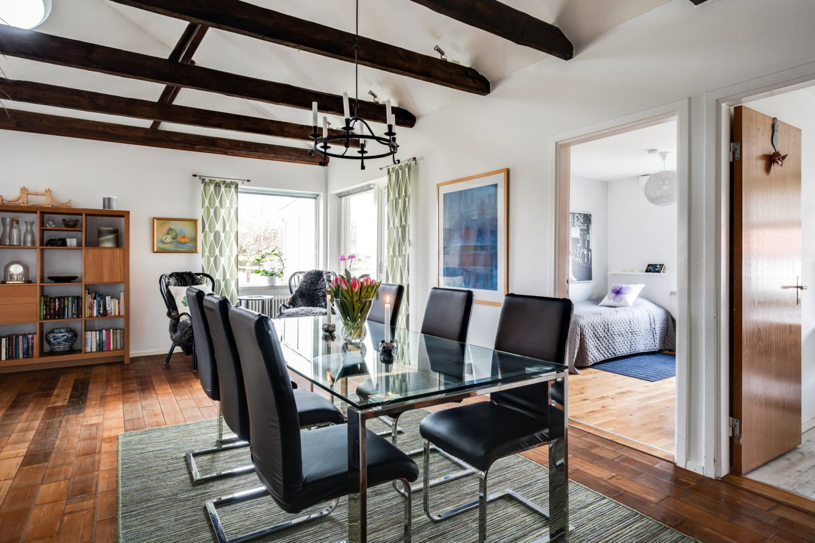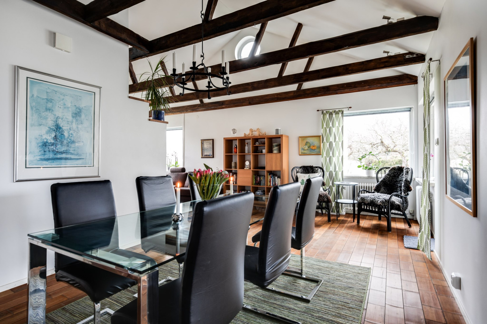 Rymligt och inbjudande sällskapsrum med öppet upp i nock och synliga takbjälkar som skapar en härlig rymd och mycket karaktär. Här finns gott om plats för både soffgrupp och matplats, vilket gör rummet till hemmets naturliga samlingspunkt. Öppen spis bidrar till en extra trivsam atmosfär. Från rummet finns utgång till det inglasade uterummet och vidare ut till trädgården.