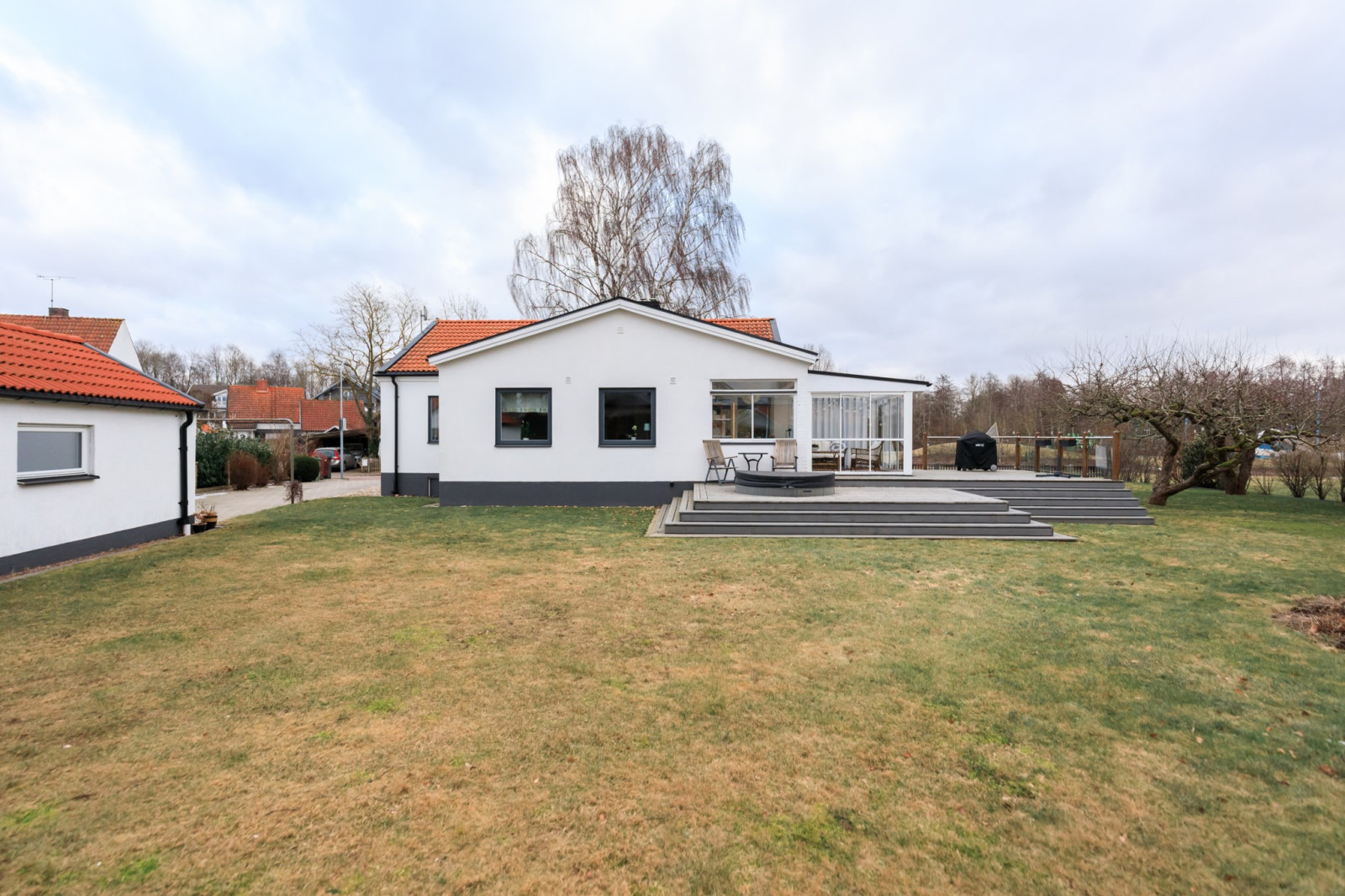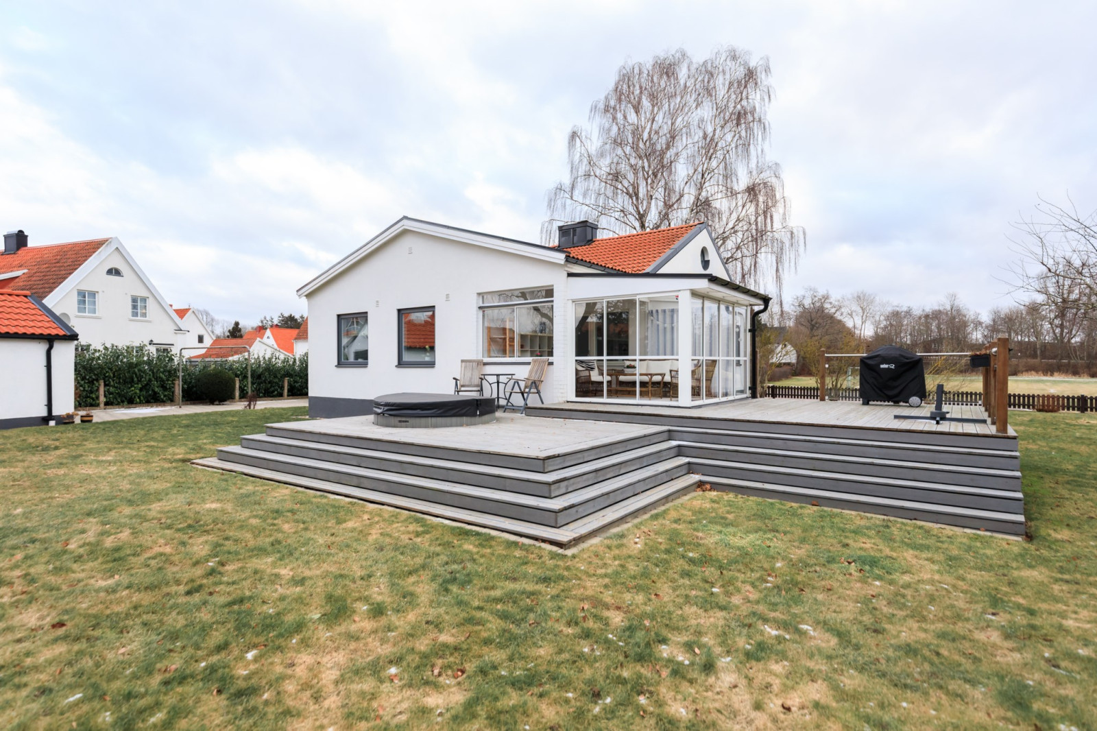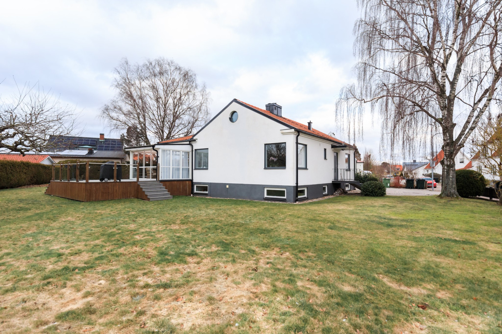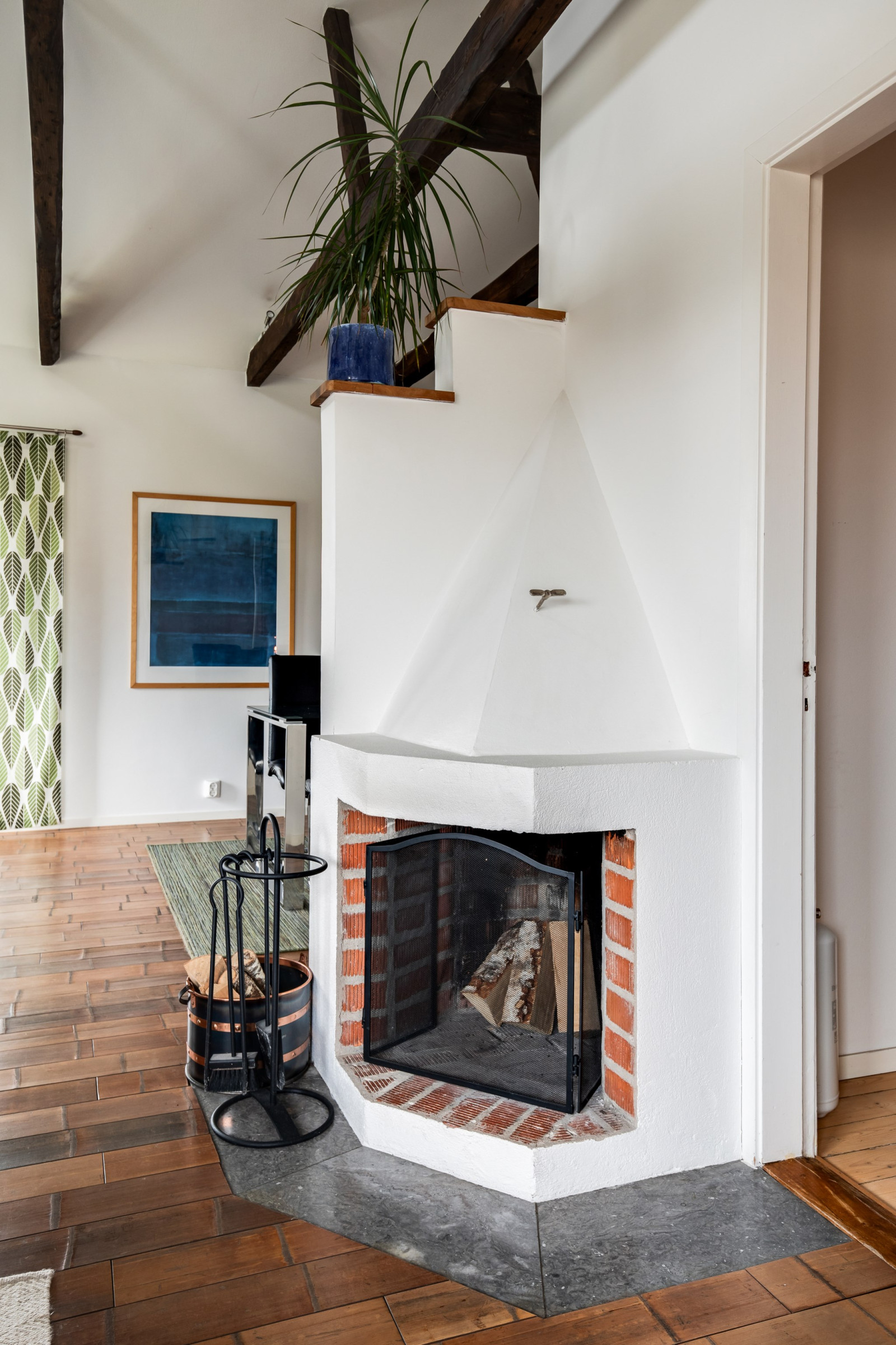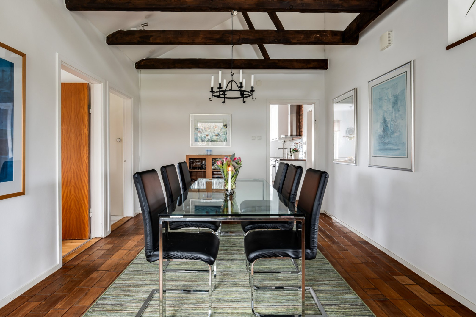 Rymligt och inbjudande sällskapsrum med öppet upp i nock och synliga takbjälkar som skapar en härlig rymd och mycket karaktär. Här finns gott om plats för både soffgrupp och matplats, vilket gör rummet till hemmets naturliga samlingspunkt. Öppen spis bidrar till en extra trivsam atmosfär. Från rummet finns utgång till det inglasade uterummet och vidare ut till trädgården.