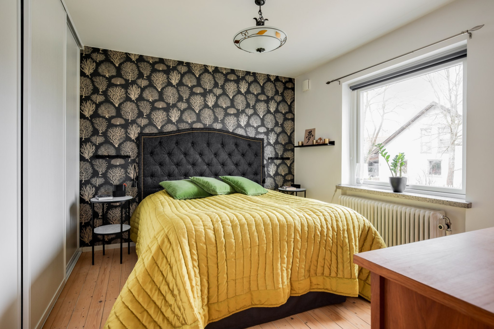 Sovrum i samma storlek som intilliggande rum och med samma fina läge mot husets baksida. Här erbjuds utsikt över grönskan och ett insynsskyddat läge som ger en lugn och rofylld känsla. Rummet passar utmärkt som barnrum, gästrum eller arbetsrum.