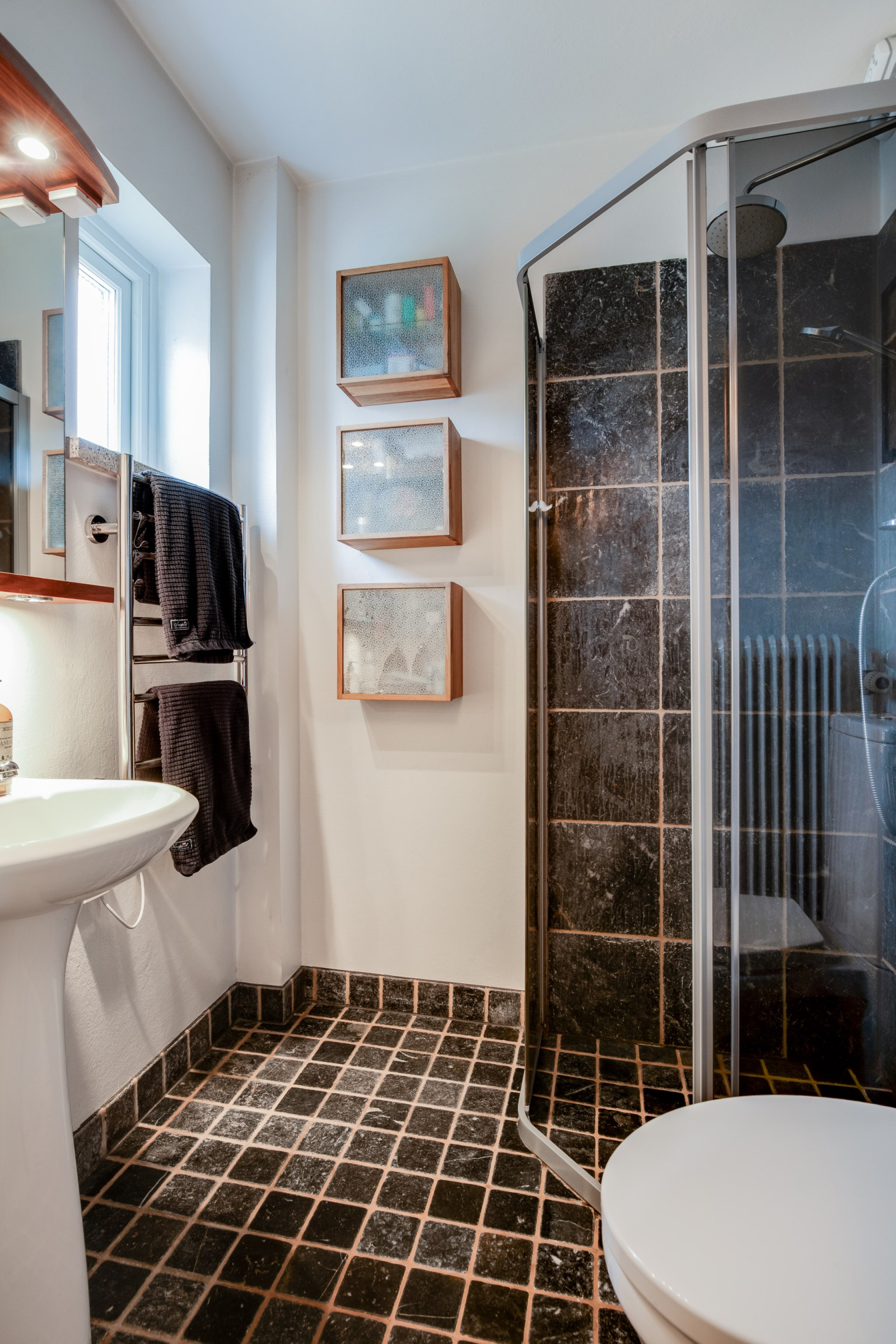 Renoverat badrum från 2010, i gott skick med svart klinker på golvet och ljusa väggar som skapar ett fräscht och ljust intryck. Utrustat med handfat, dusch och wc. Vädringsfönster ger naturligt ljusinsläpp och en trivsam atmosfär. Praktiskt och funktionellt för vardagens behov.