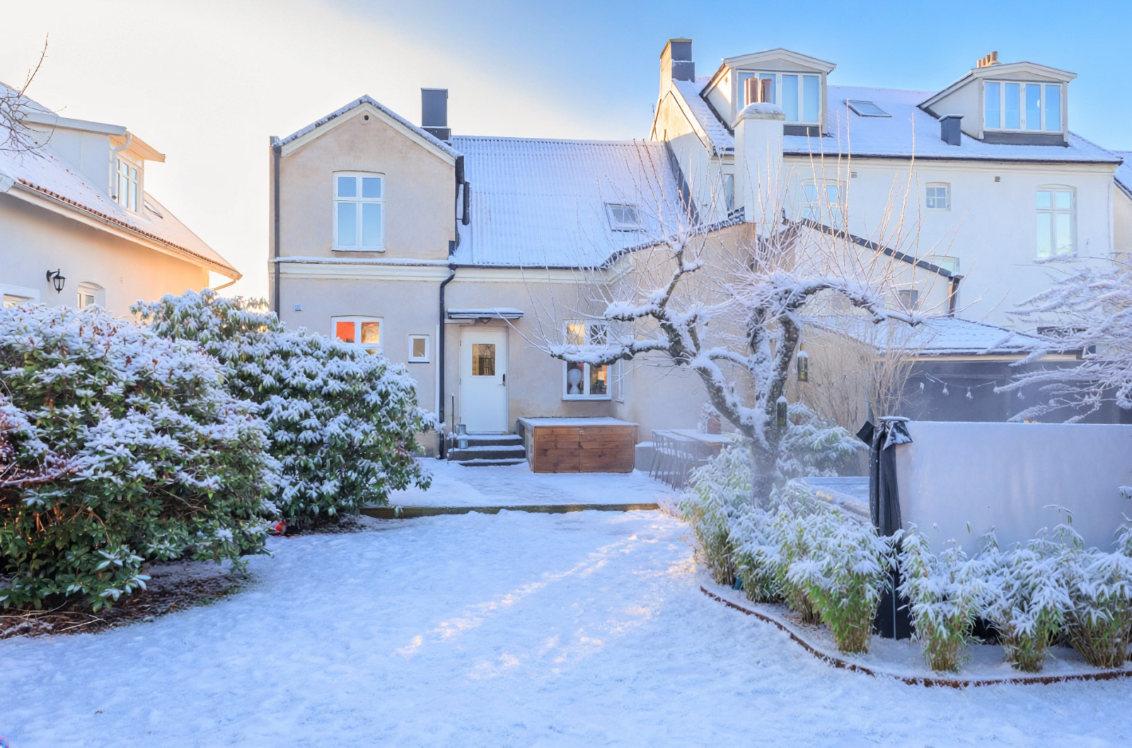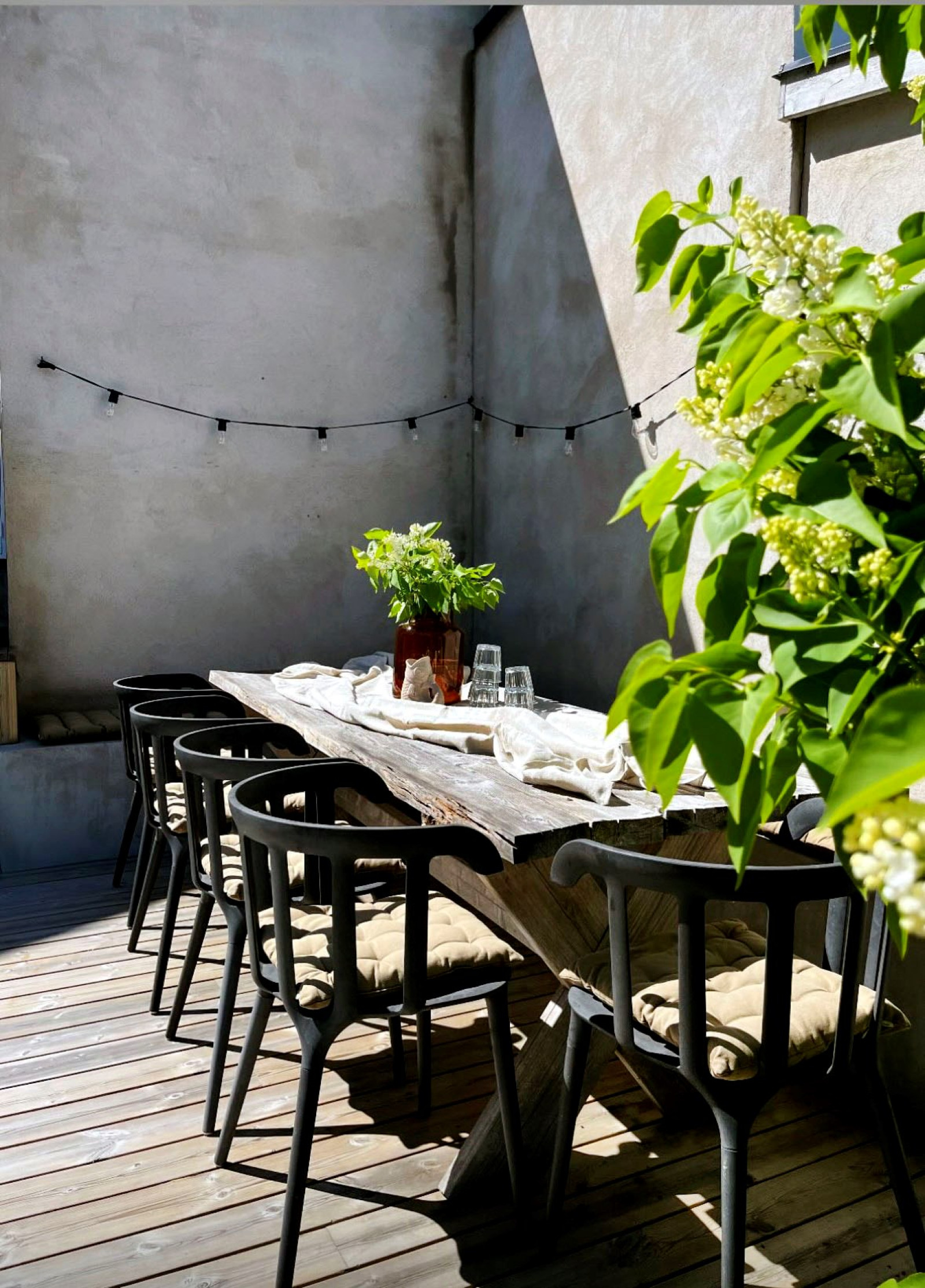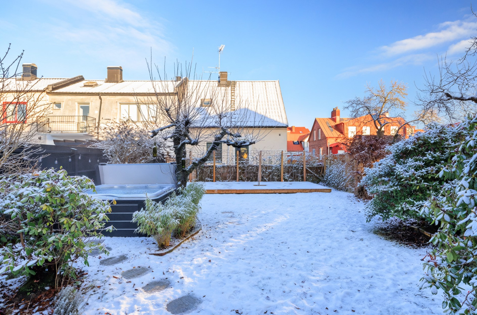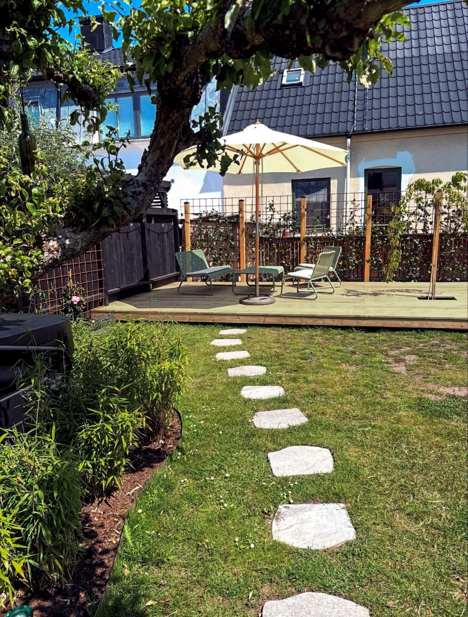 Trädgården är ett verkligt uterum, där varje hörn har sin egen karaktär och charm. Direkt vid köksutgången ligger ett trädäck med platsbyggd bänk, där många kan samlas för spontana måltider, samtal och skratt under bar himmel. Det andra trädäcket fångar kvällssolen och omfamnas av en spaljé med slingrande klätterväxter, som skapar en grönskande, skyddad matplats i lugn och ro. Ovan källartrappan reser sig ett upphöjt soldäck – en perfekt plats att breda ut dynor och låta solens strålar värma kroppen medan man njuter av utsikten över trädgården.
