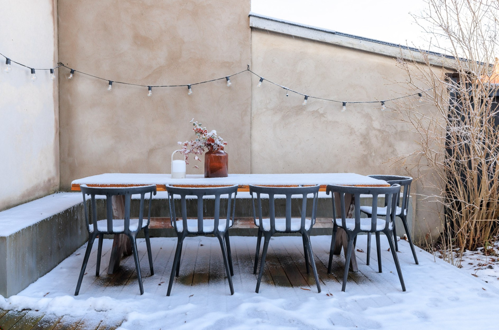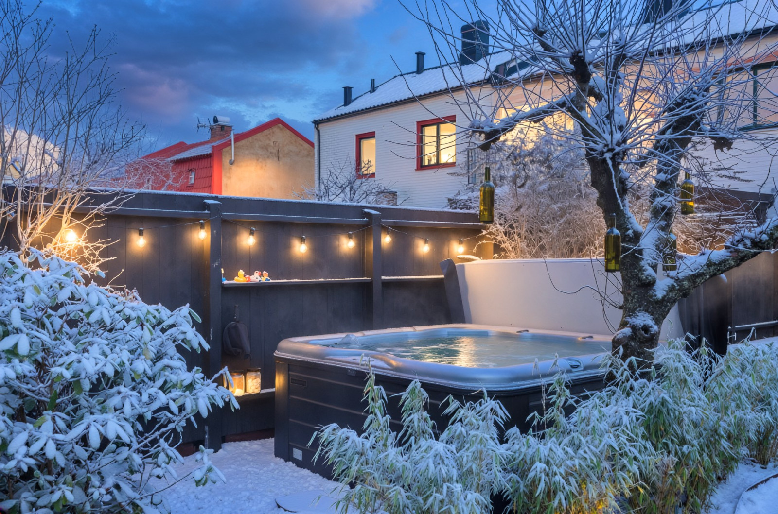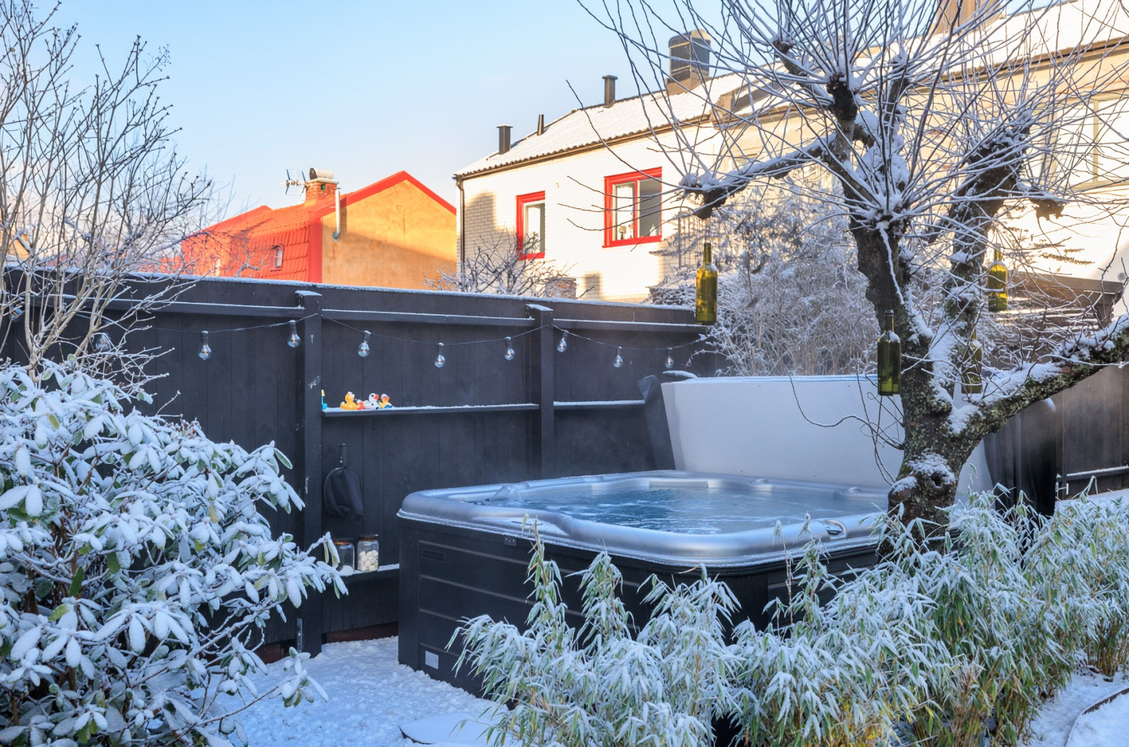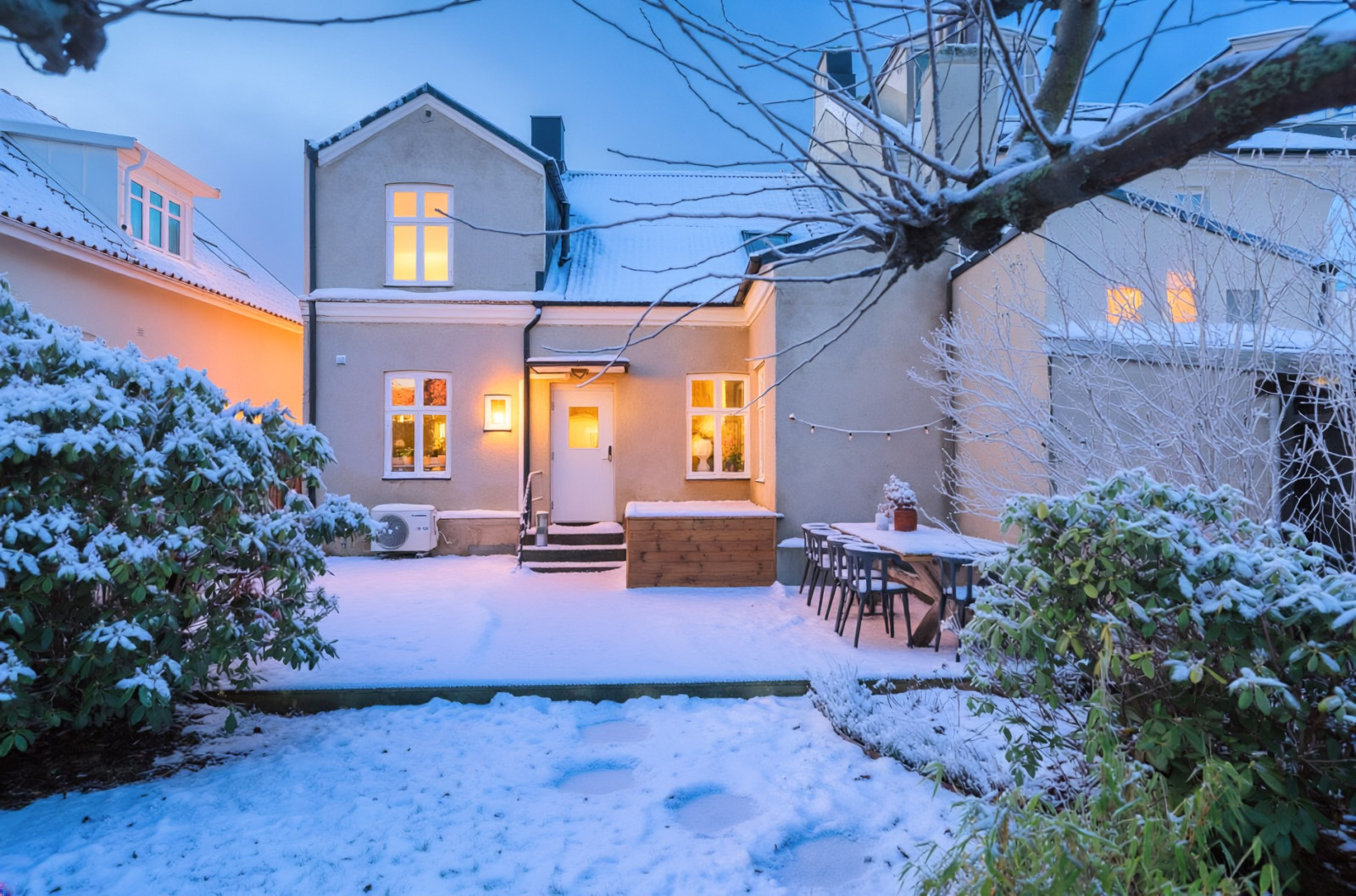 Trädgården är ett verkligt uterum, där varje hörn har sin egen karaktär och charm. Direkt vid köksutgången ligger ett trädäck med platsbyggd bänk, där många kan samlas för spontana måltider, samtal och skratt under bar himmel. Det andra trädäcket fångar kvällssolen och omfamnas av en spaljé med slingrande klätterväxter, som skapar en grönskande, skyddad matplats i lugn och ro. Ovan källartrappan reser sig ett upphöjt soldäck – en perfekt plats att breda ut dynor och låta solens strålar värma kroppen medan man njuter av utsikten över trädgården.