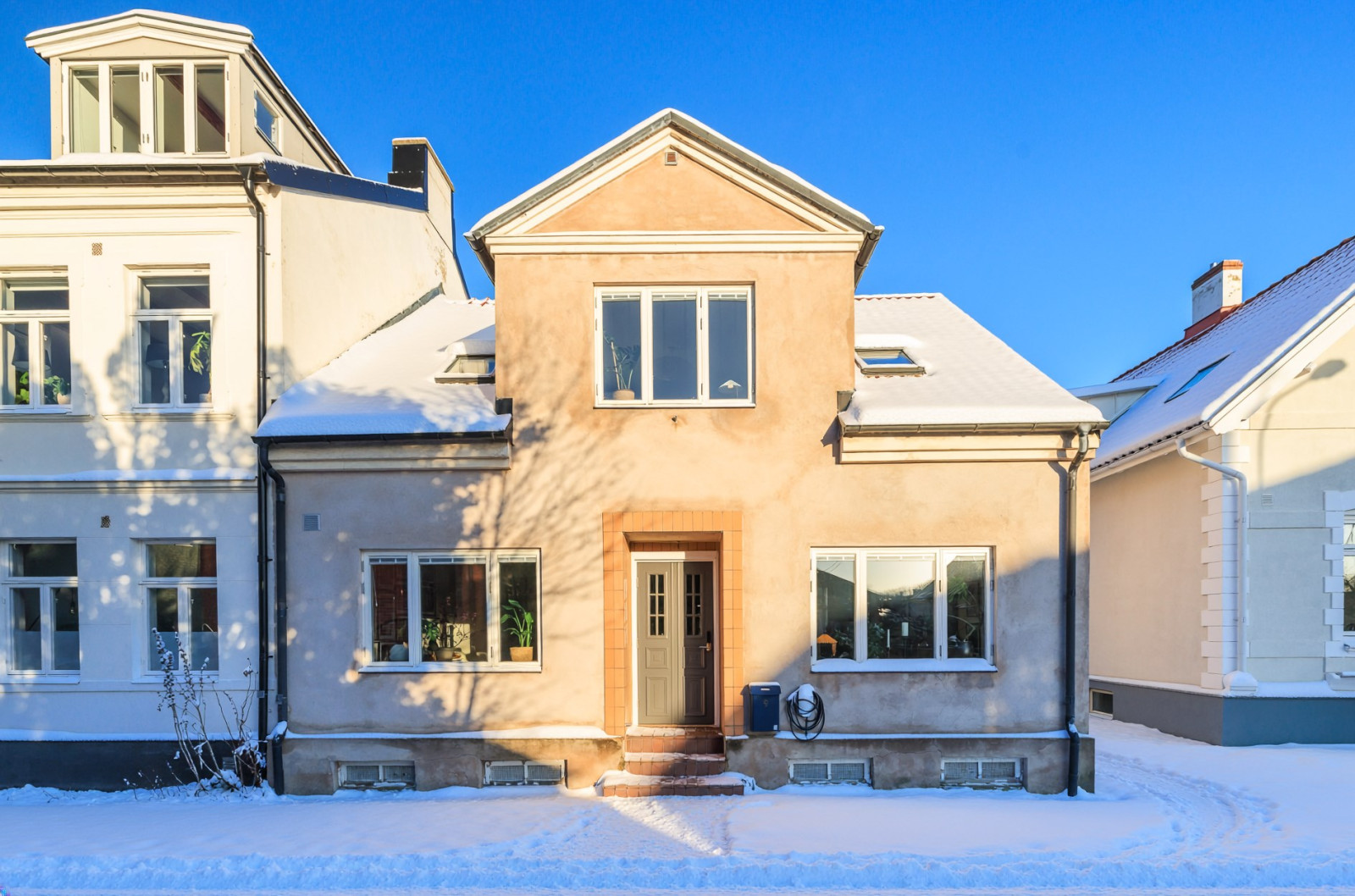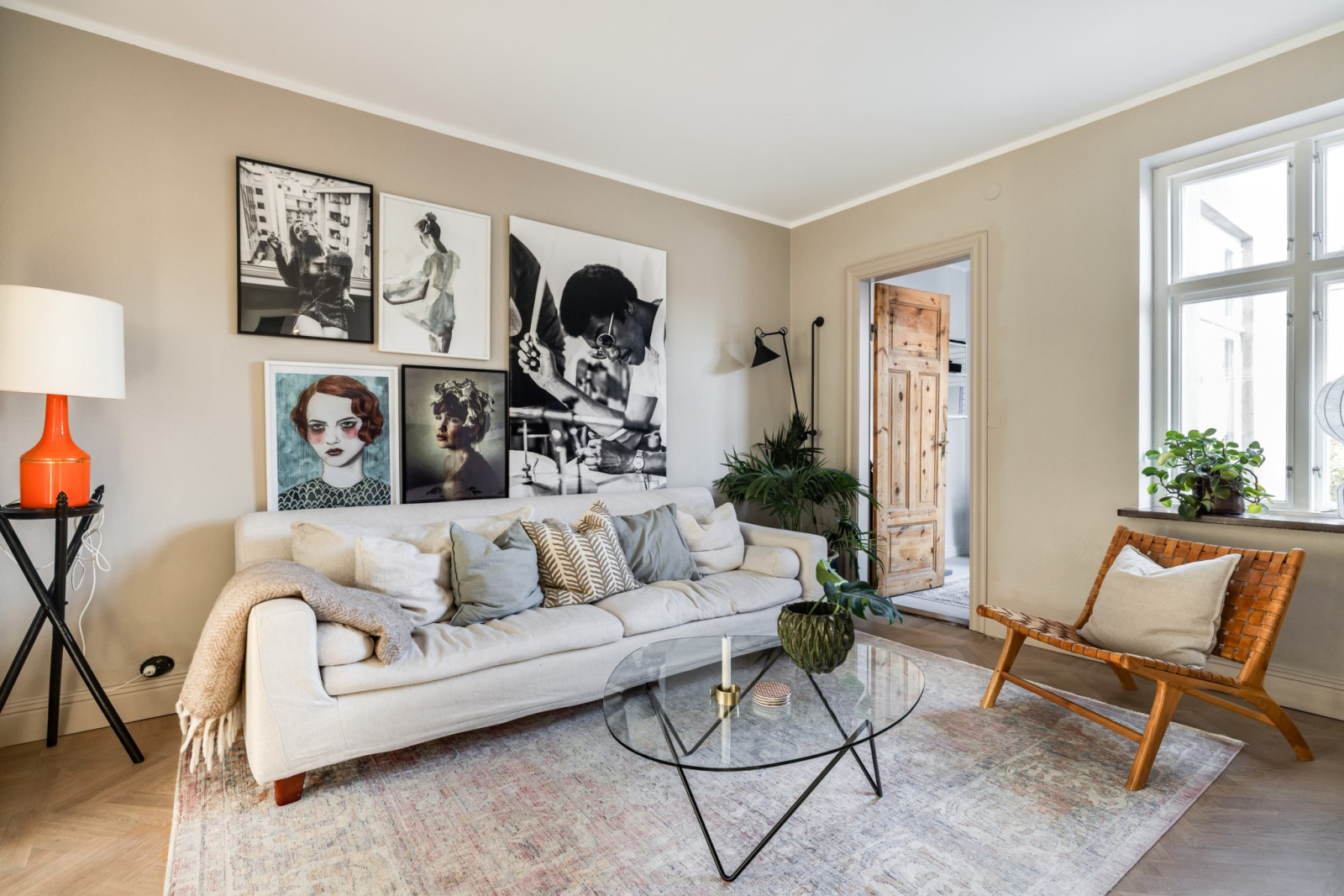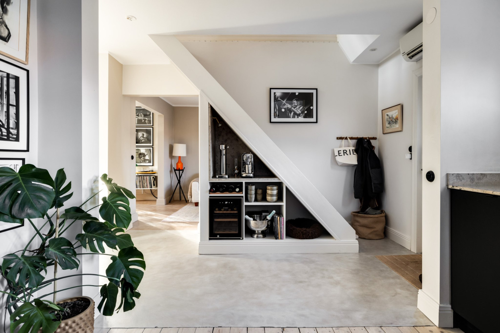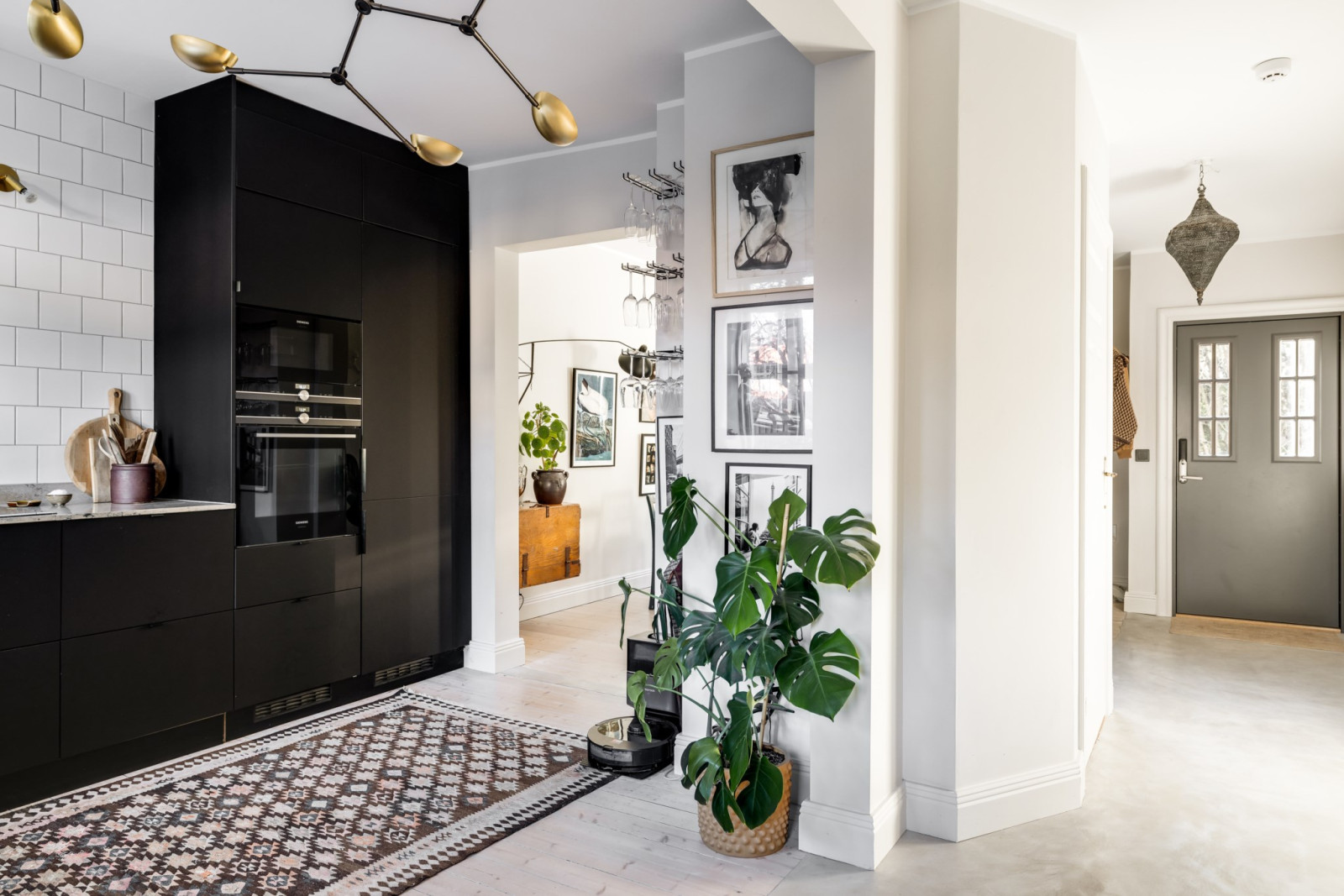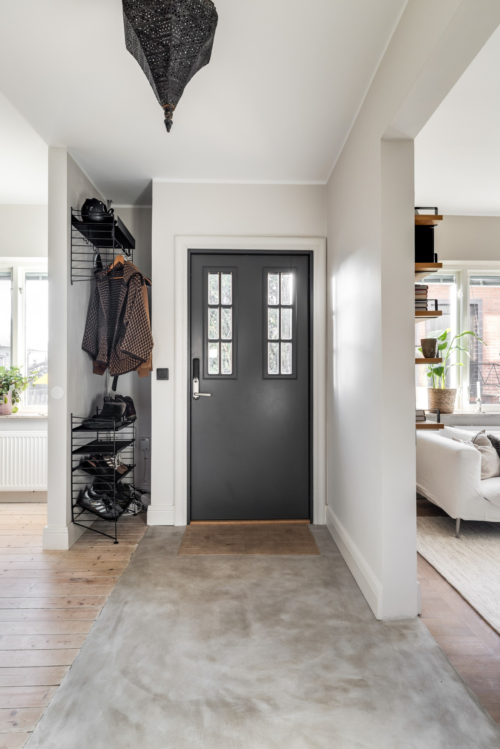 En välkomnande hall möter dig på Falsterbogatan 9 där materialval och ett vackert hem tar emot dig med öppna armar. På golvet vilar ett robust microcementgolv som möter både plankgolv och fiskbensparkett. Hallen mäter ca 2,6 m i takhöjd och denna rymlighet följer med i resten av entréplan. Välkomna in!