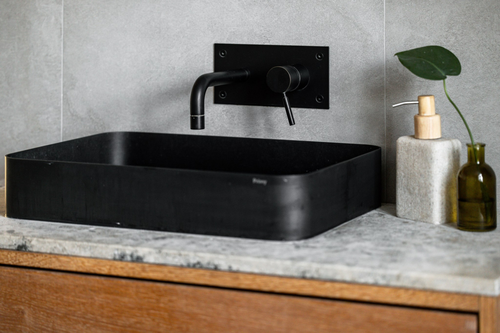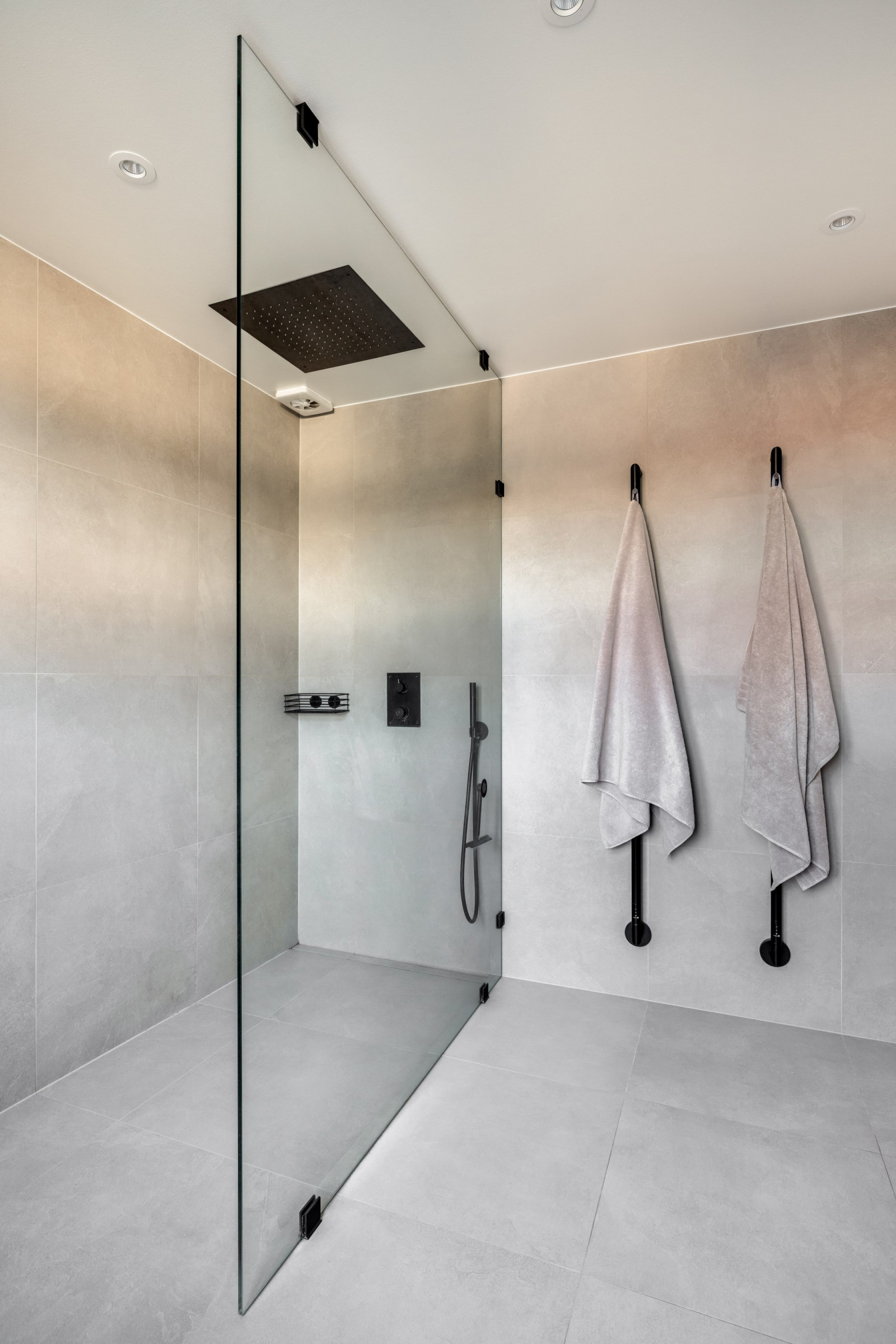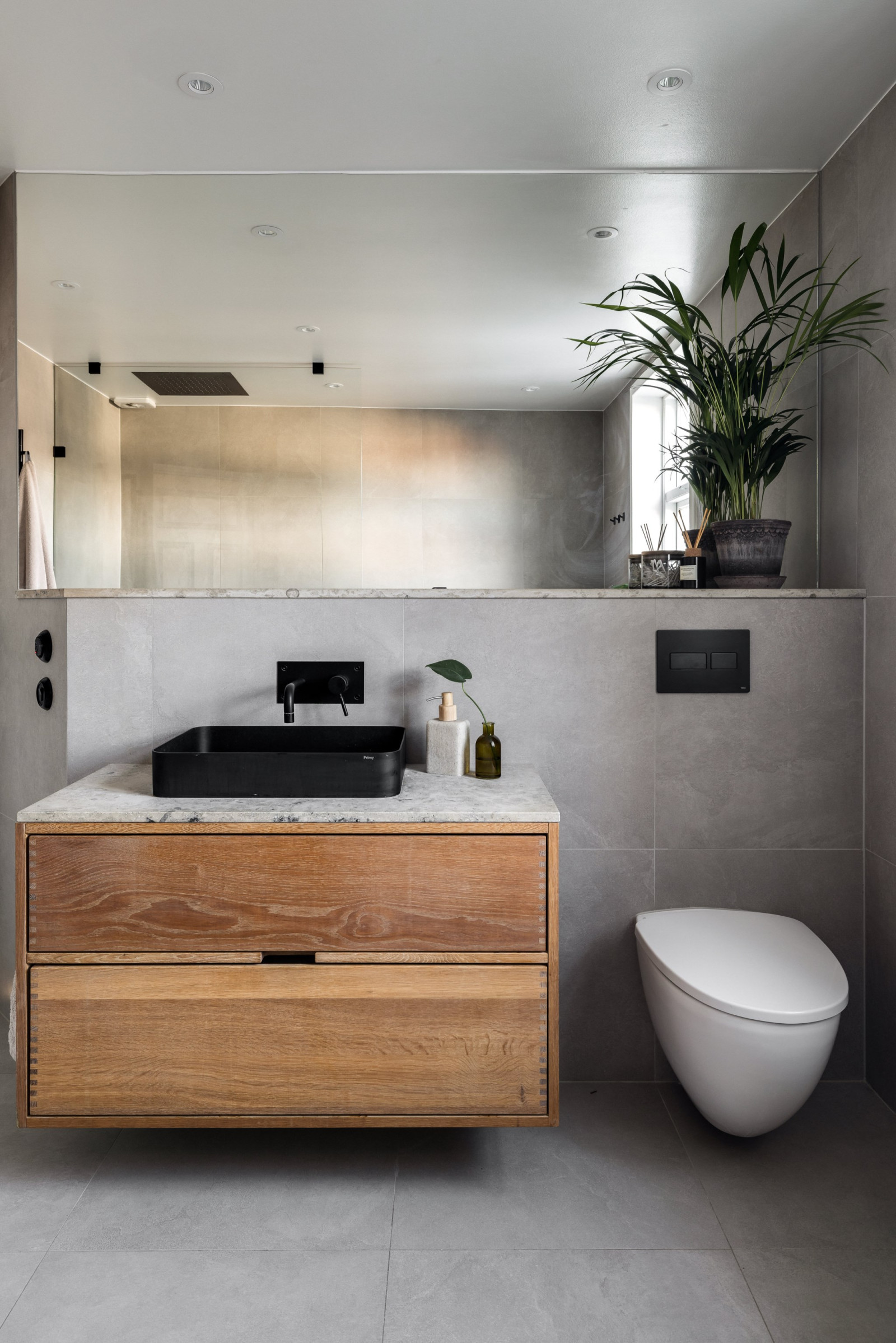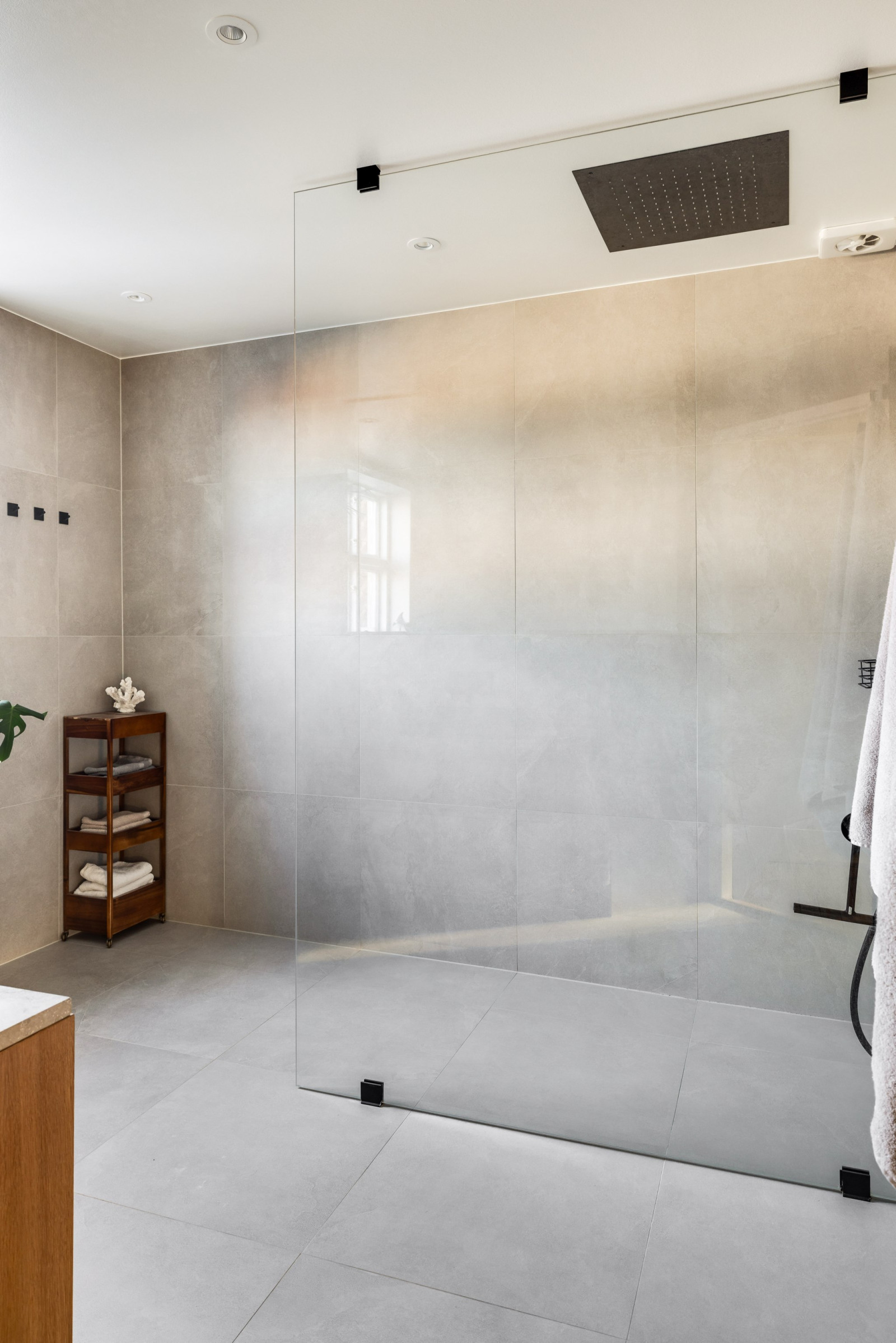 I husets andra frontespis ligger detta rymliga badrum, där full takhöjd skapar en luftig och inbjudande känsla. Golvvärmen sprider en behaglig värme under fötterna. Kommod i vackert trä möter ett svart rostfritt tvättställ från Scandtap, och den lyxiga takduschen förvandlar varje stund till avkoppling. Här möts moderna linjer och tidlös design i en harmonisk och rofylld miljö för vardagens små och stora stunder.