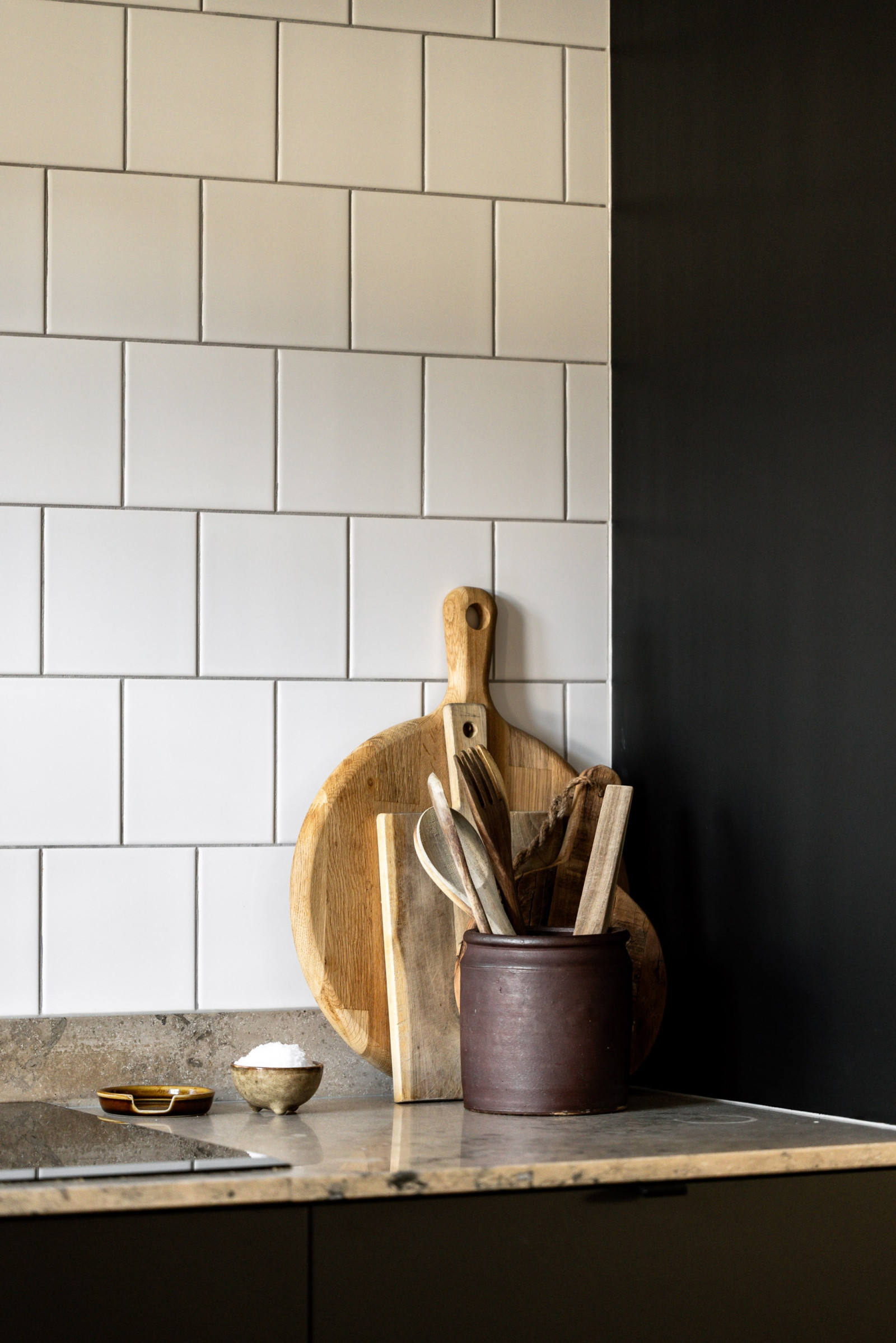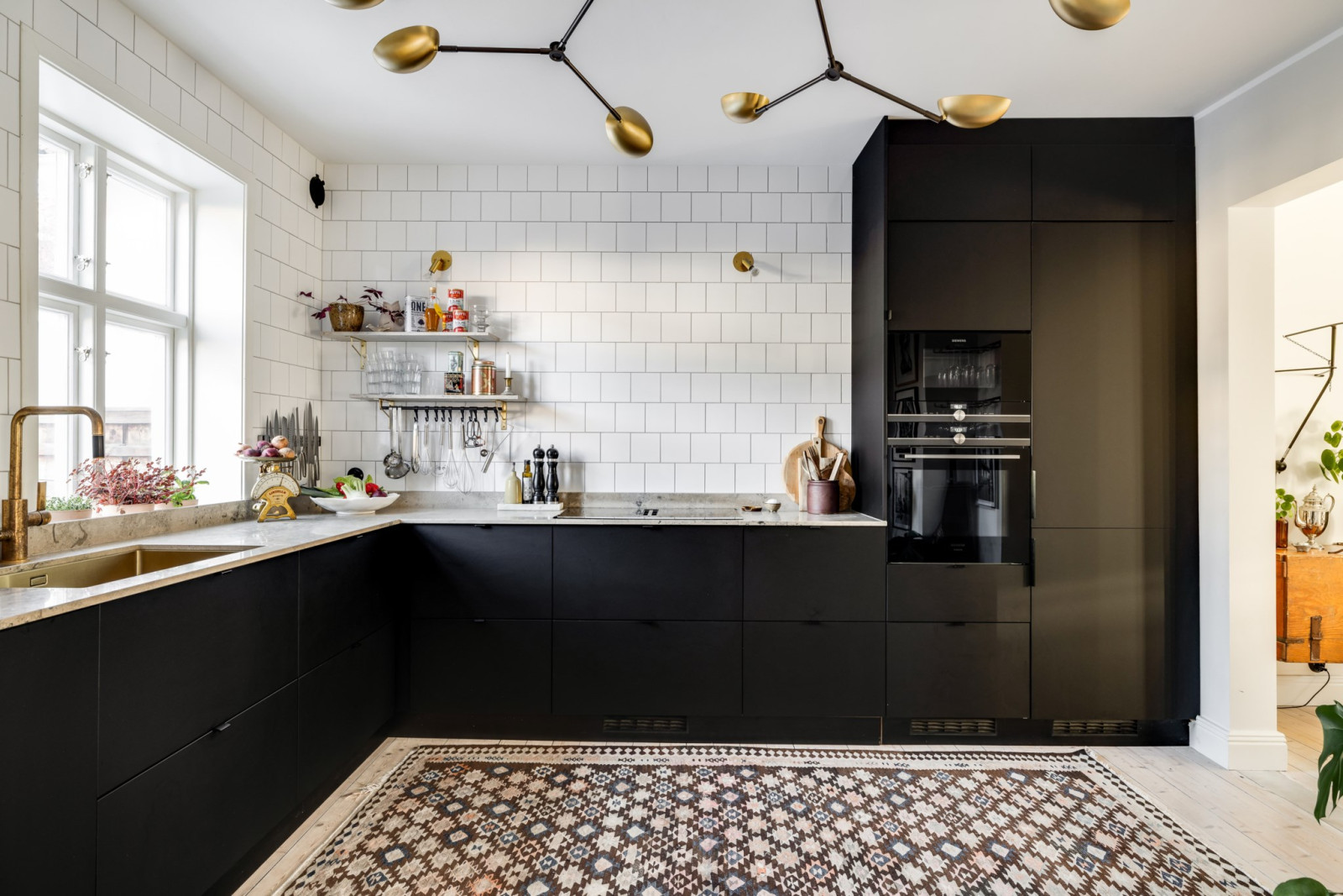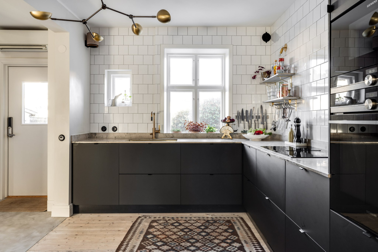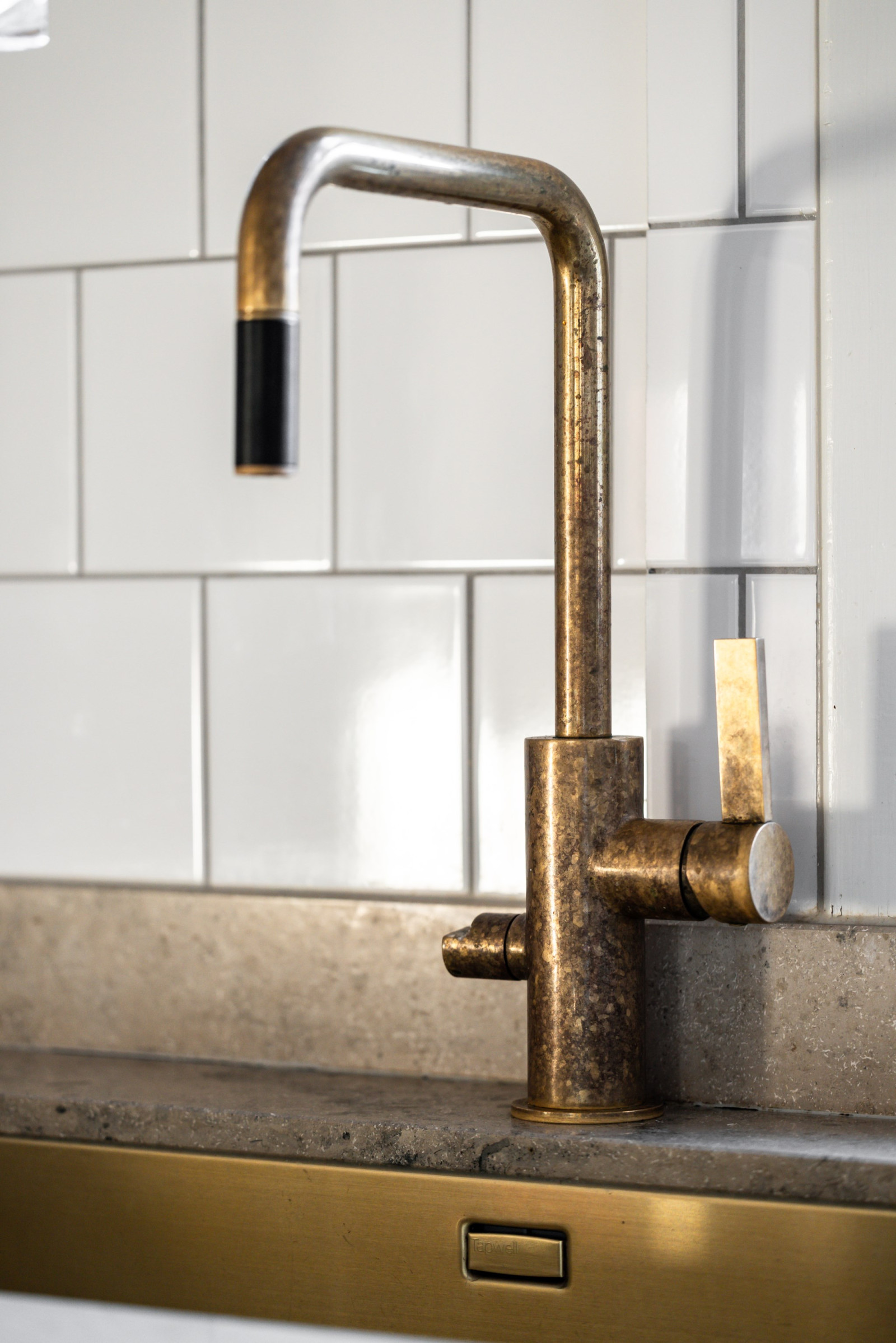 Ett stilrent och smakfullt kök från Kvik, med eleganta och tidstypiska detaljer. Bänkskivan i vacker kalksten, tillsammans med både kran och vask i exklusiv mässing från Tapwell, skapar en sofistikerad helhet. Den noggrant utvalda vitvaruparken inkluderar en induktionshäll med integrerad fläkt, ugn med pyrolys, en extra stor diskmaskin, mikrovågsugn samt en integrerad kyl/frys. Det stora fönstret ger ett vackert ljusinsläpp och blickar ut mot trädgården. Direkt bredvid köket finns en bakgårdsdörr som ger enkel tillgång till både trädgård och uteplatser. Under trappan har utrymmet utnyttjats på bästa sätt och inrymmer en lyxig kaffestation samt en elegant vinkyl.