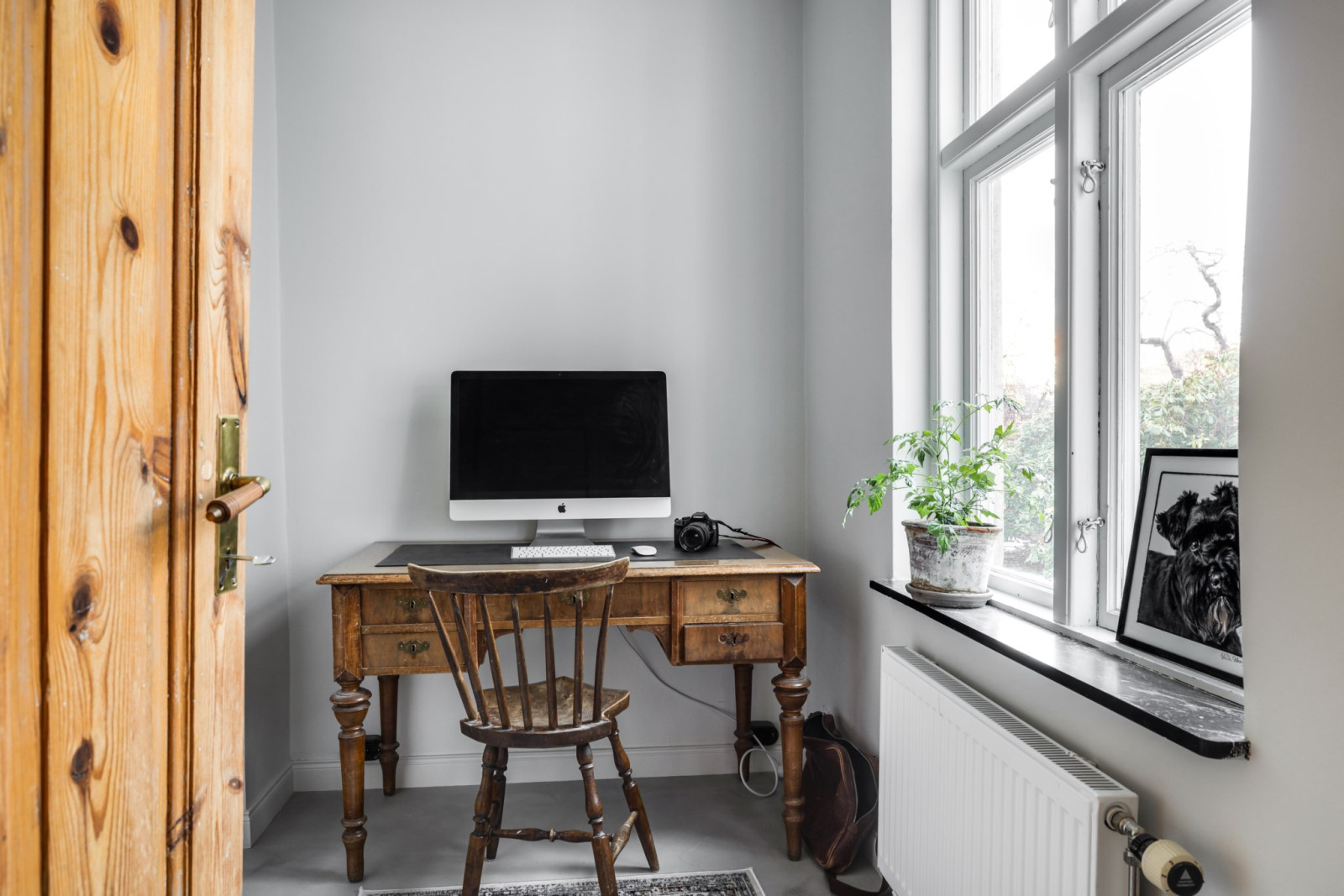 I hemmets mer avskilda del finns ett mindre dock välplanerat rum som lämpar sig utmärkt som kontor. Här råder ett stillsamt lugn, med plats för både arbete och eftertanke. Ett fönster mot trädgården släpper in ett mjukt ljus, och med dörr som kan stängas skapas en rofylld och funktionell arbetsplats.