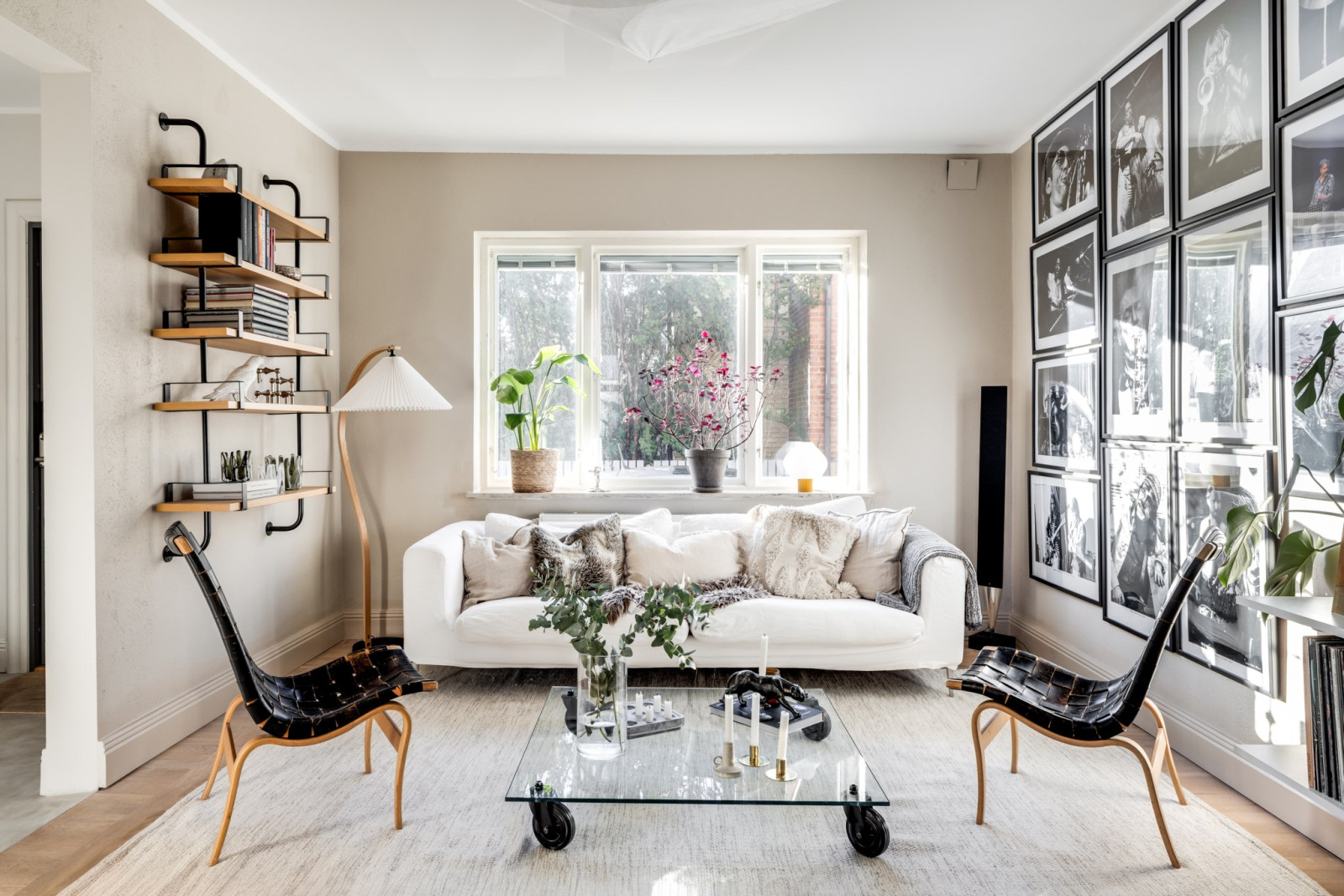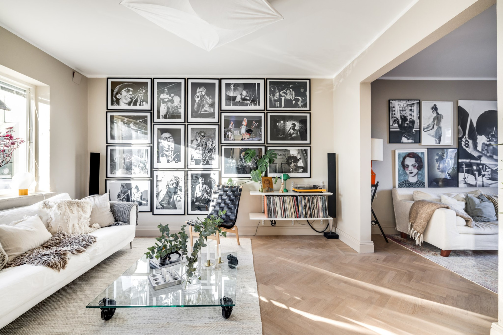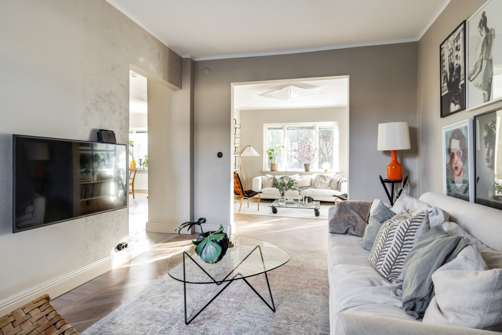 Det varsamt renoverade vardagsrummet är disponerat i fil och uppdelat i två harmoniska delar. Vackra, tidstypiska detaljer samspelar och skapar en varm och inbjudande atmosfär. Den ena delen är utformad som en lugn loungedel med soffgrupp, perfekt för avkoppling och sociala stunder, där stillhet och trivsel får ta plats. Den andra delen rymmer en tv-hörna som bjuder in till avslappnade kvällar. Stora fönster släpper in ett generöst och mjukt dagsljus som förstärker rummets karaktär. Golvet pryds av klassisk fiskbensparkett som ger rummet en tidlös och elegant helhet.