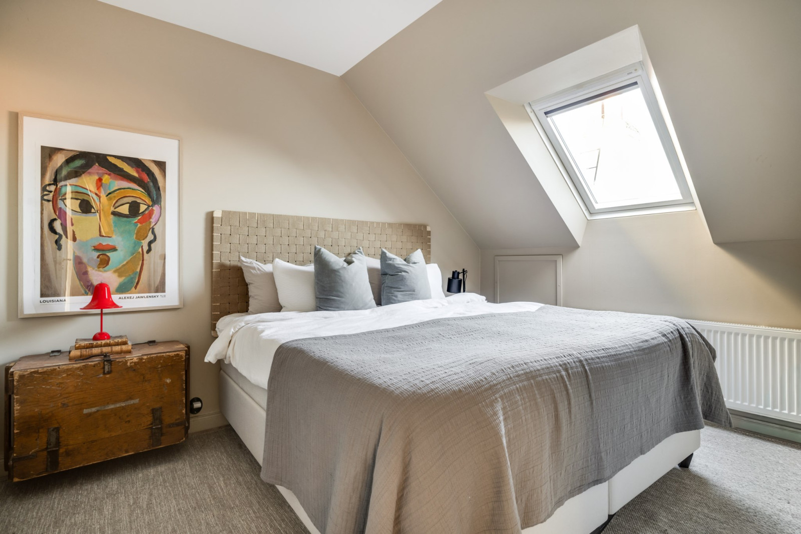 Mysigt sovrum, som vetter mot trädgårdssidan, målat i dova och behagliga toner.