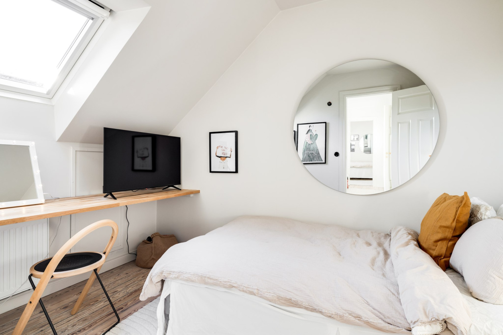 Två spegelvända och likadana sovrum ligger i varsin ände av huset. Välplanerade sovrum med plats för både säng och platsbyggda skrivbord.
