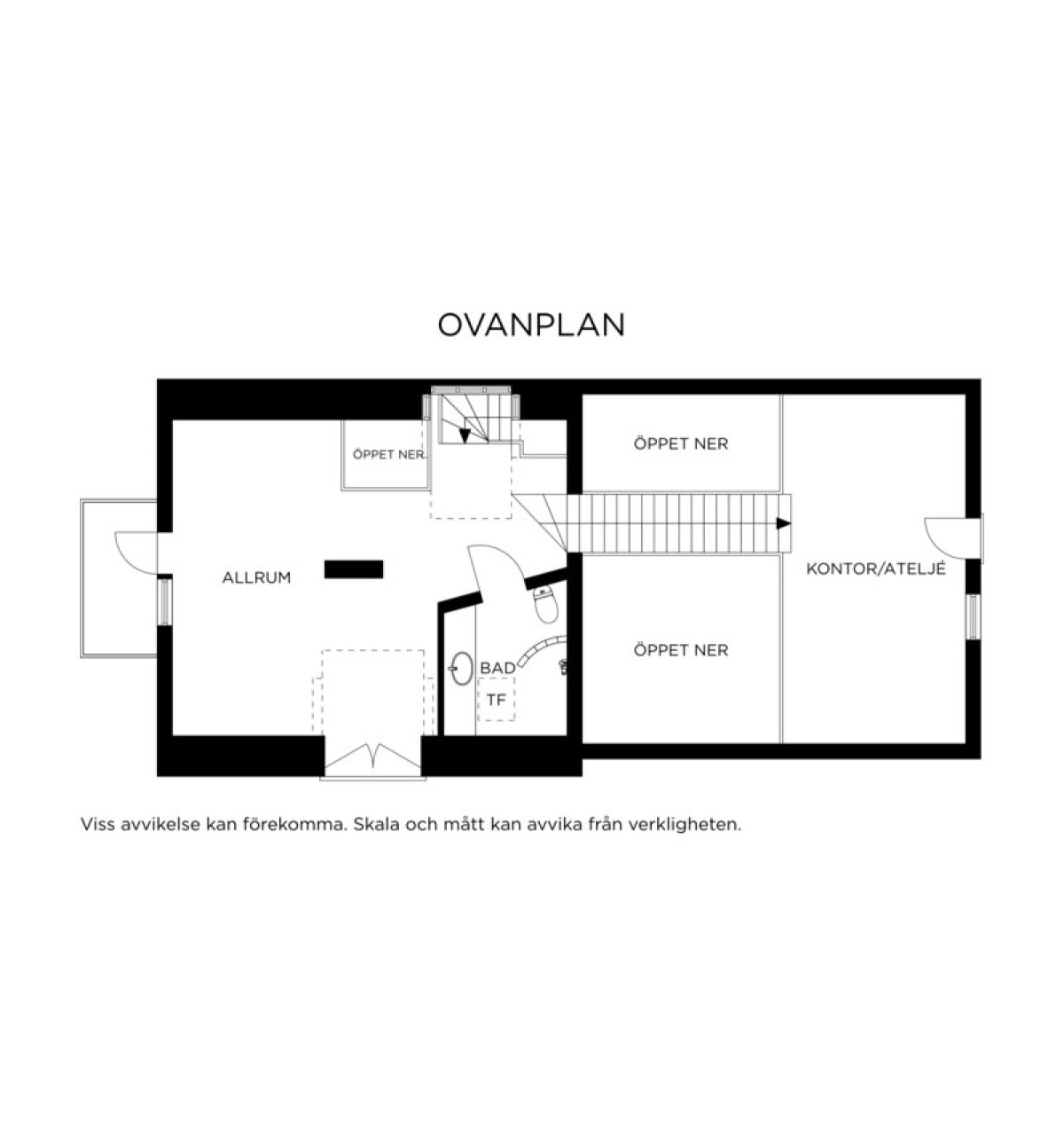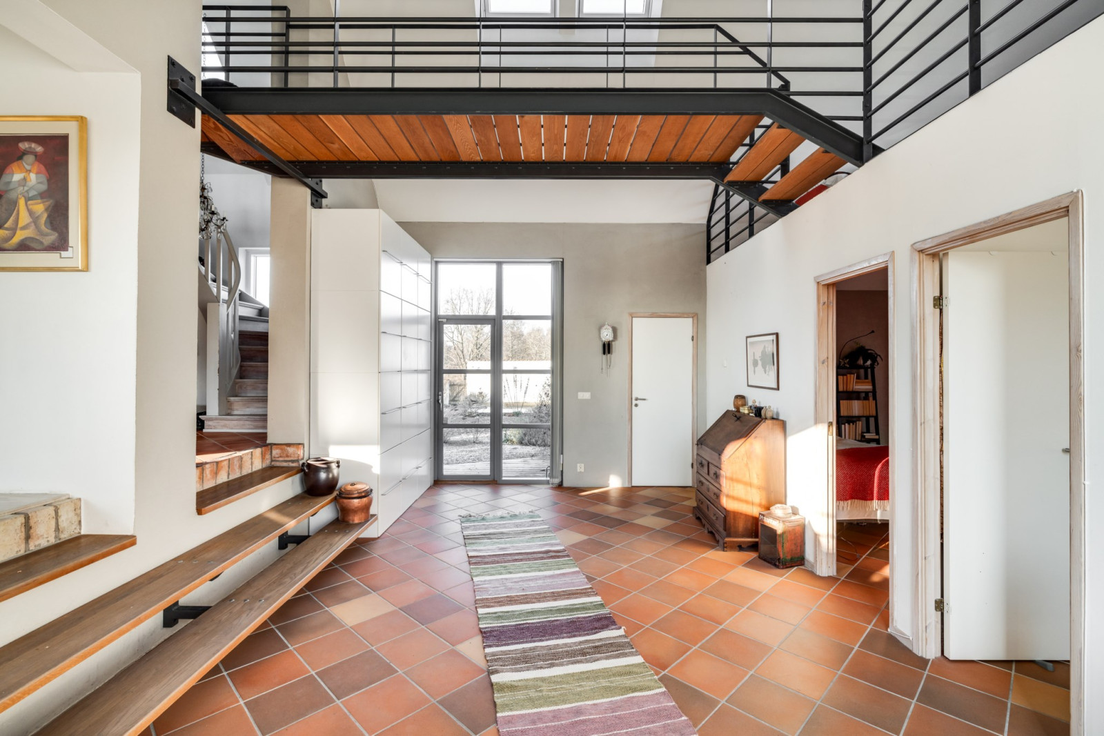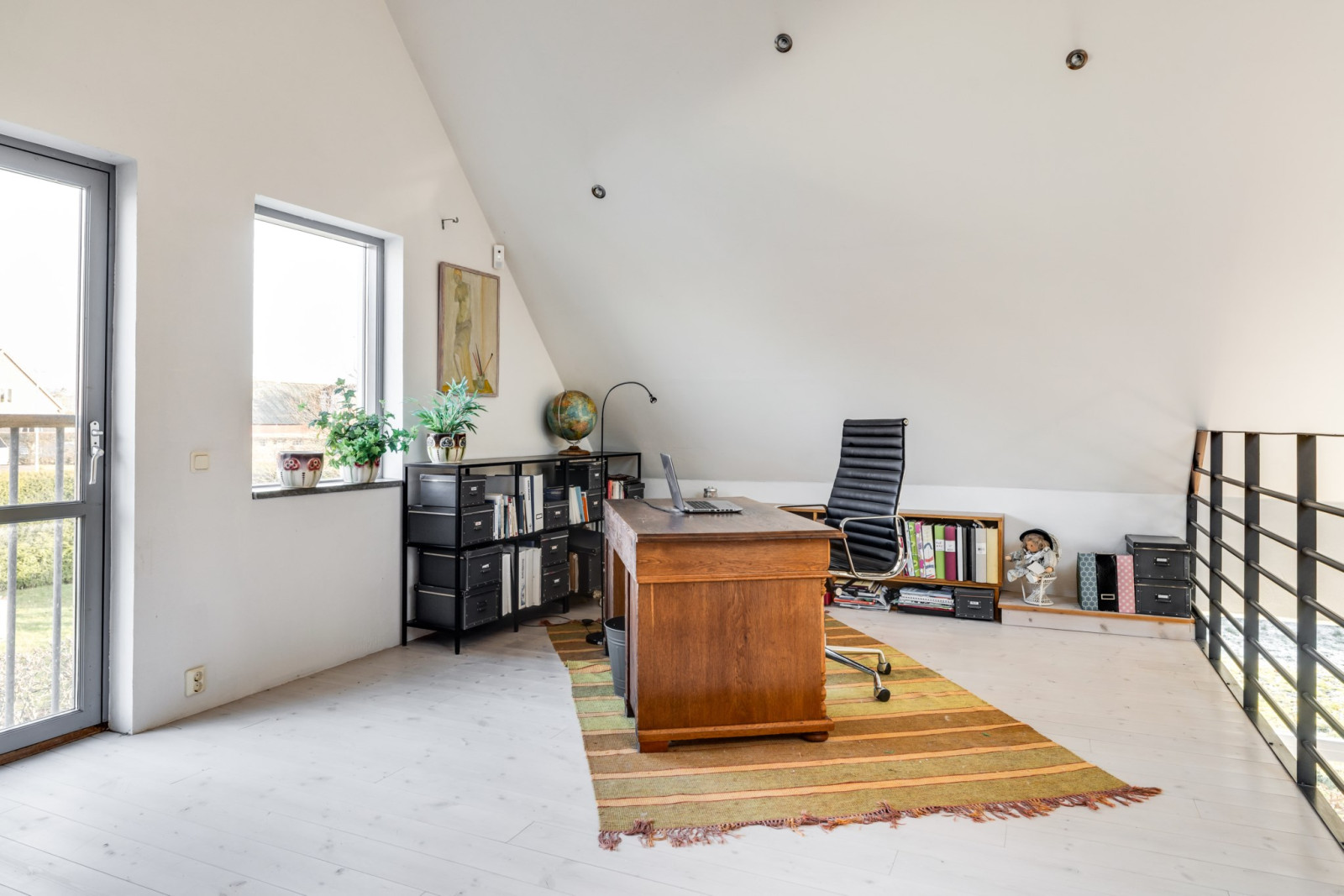 Spången över allrummet leder till ett stort gästrum/kontor. Vid behov av fler enskilda rum är det enkelt att skärma av detta med en vägg.