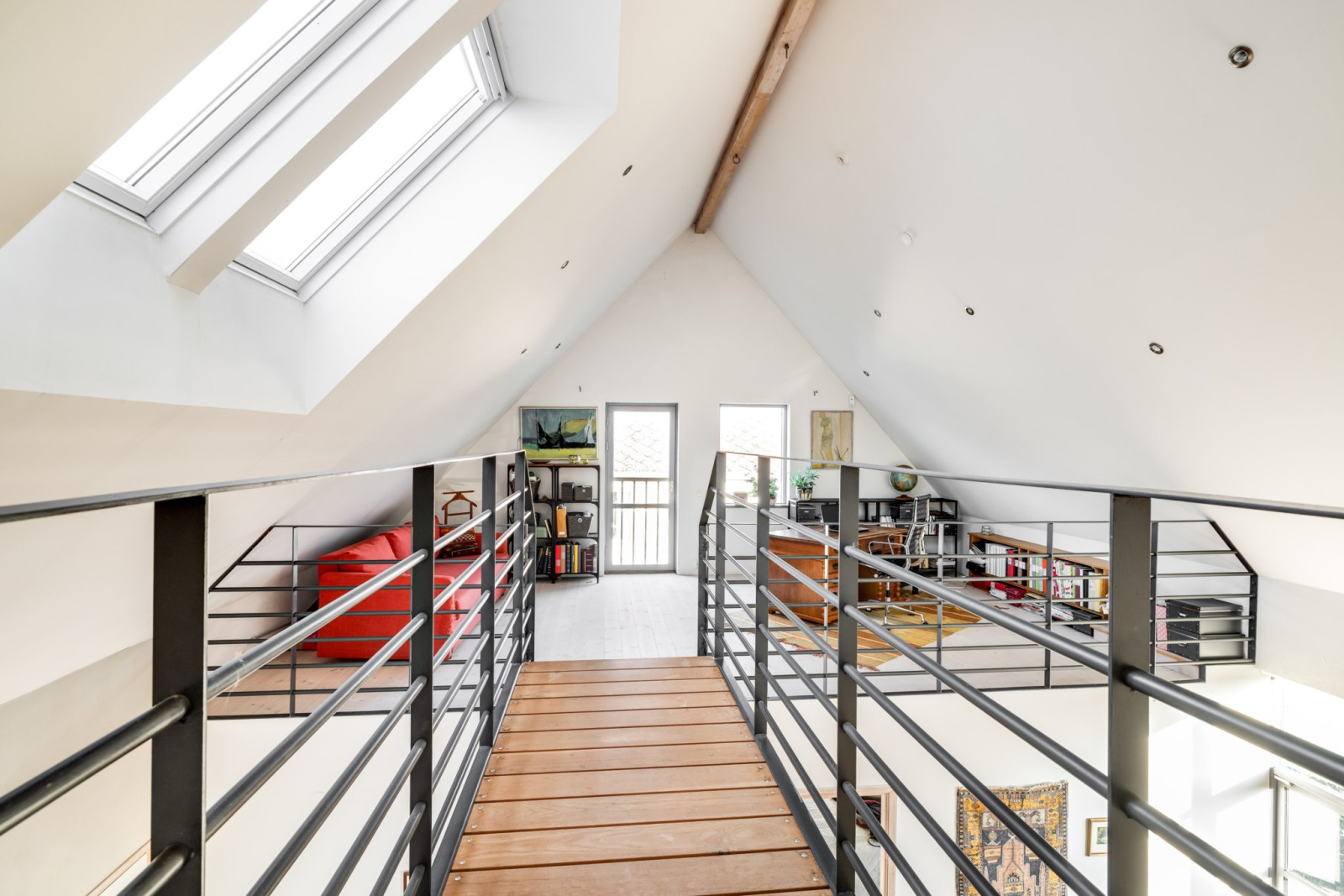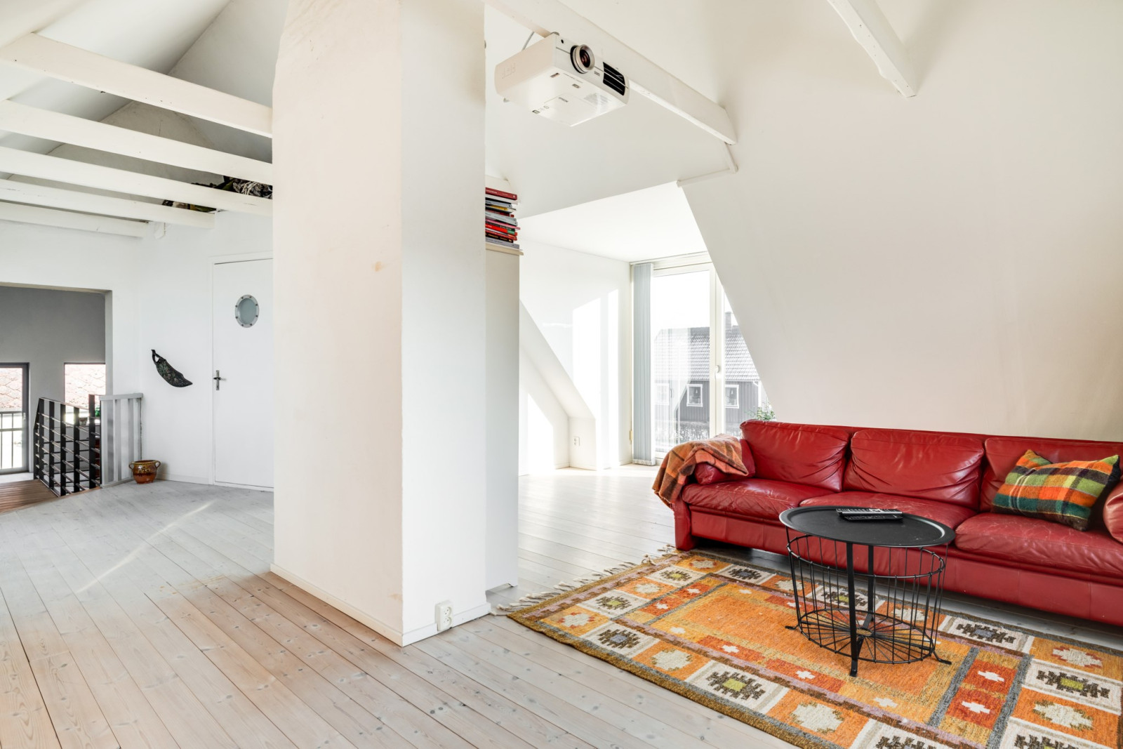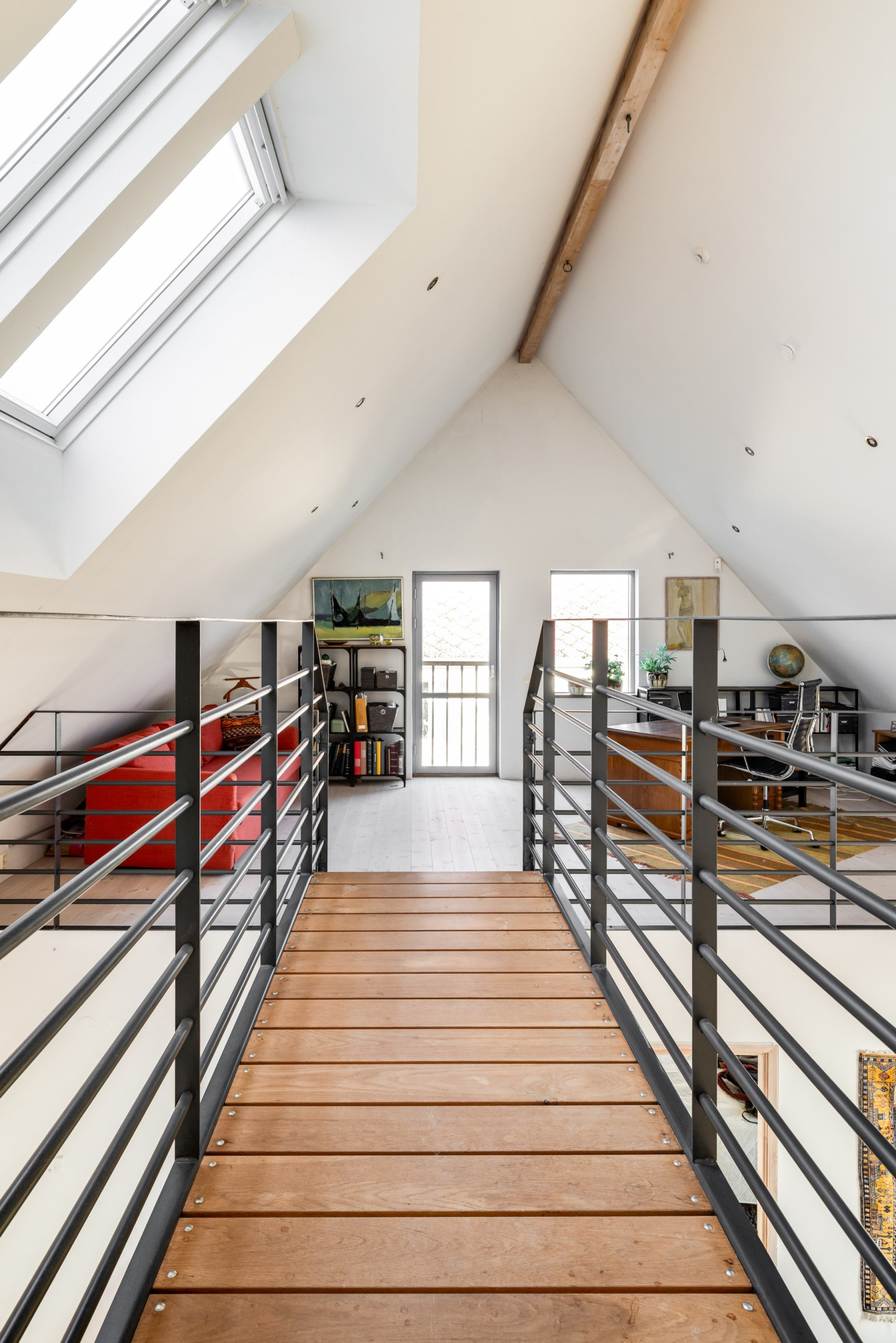 Öppet upp i nock, rustikt, vitoljat trägolv och ljusa takkupor skapar en härlig atmosfär åt denna våning.