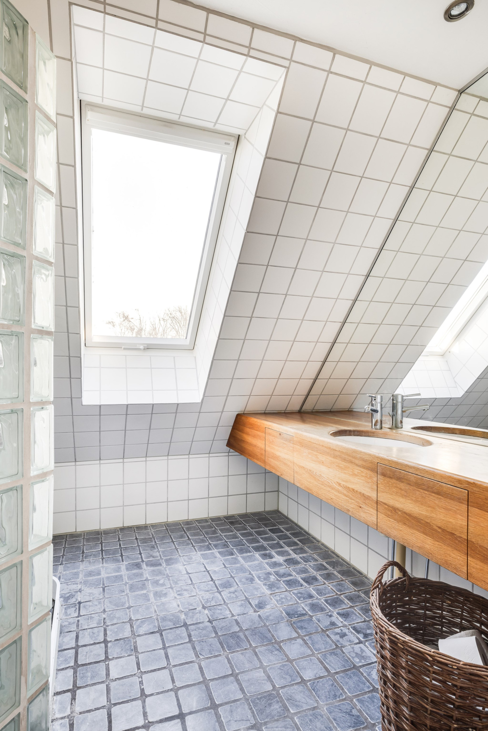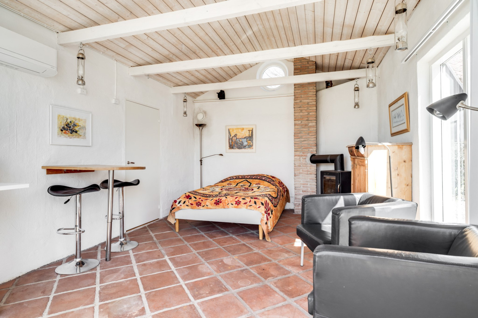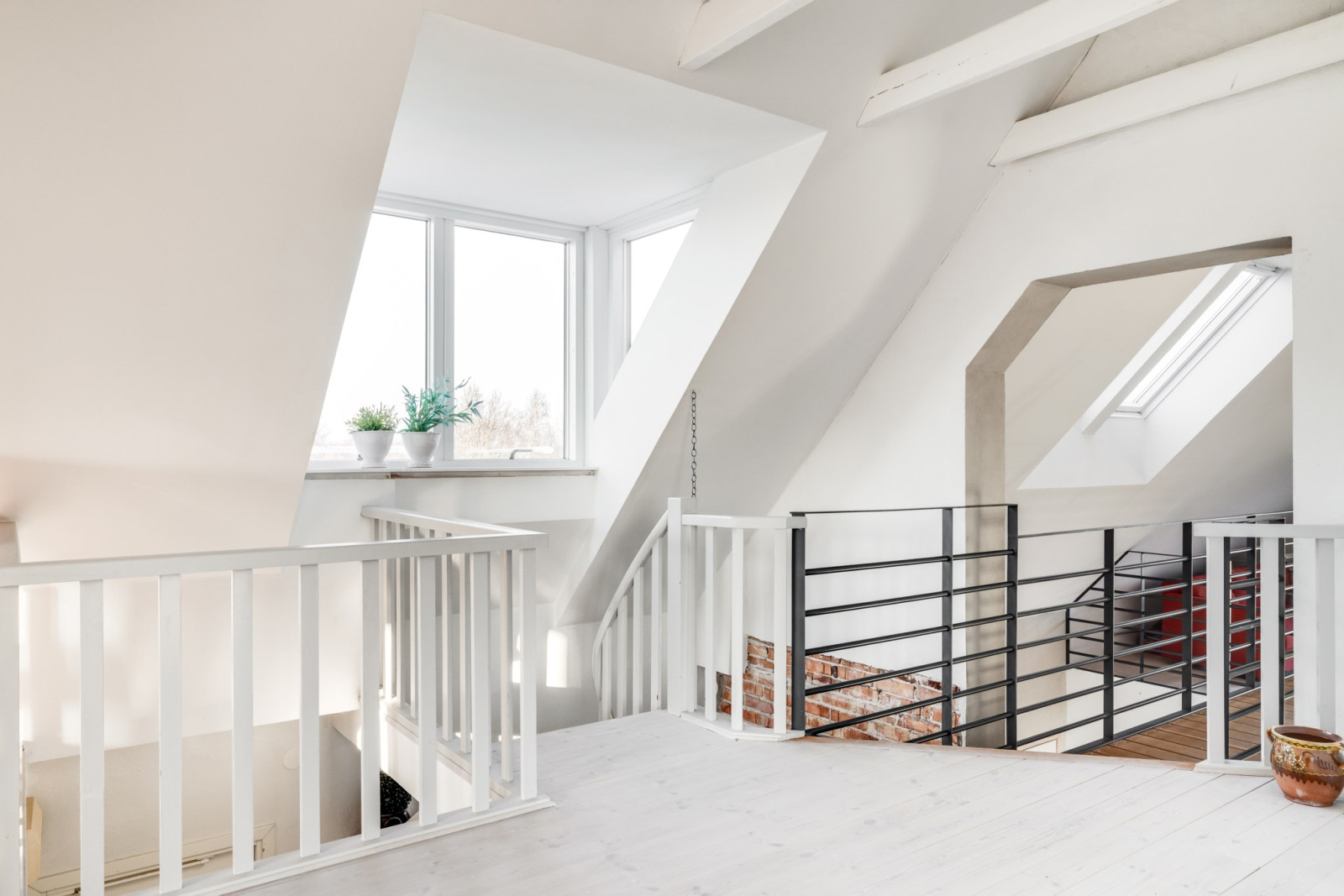 Öppet upp i nock, rustikt, vitoljat trägolv och ljusa takkupor skapar en härlig atmosfär åt denna våning.
