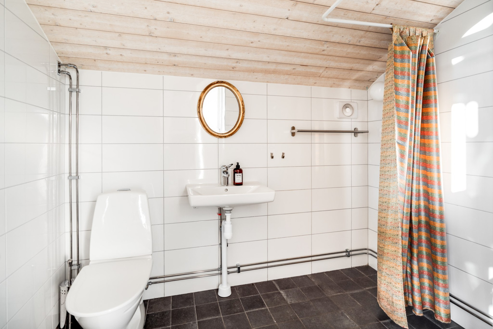Välplanerat, helkaklat badrum. Duschplats, wc, tvättställ och förberett för badkar.