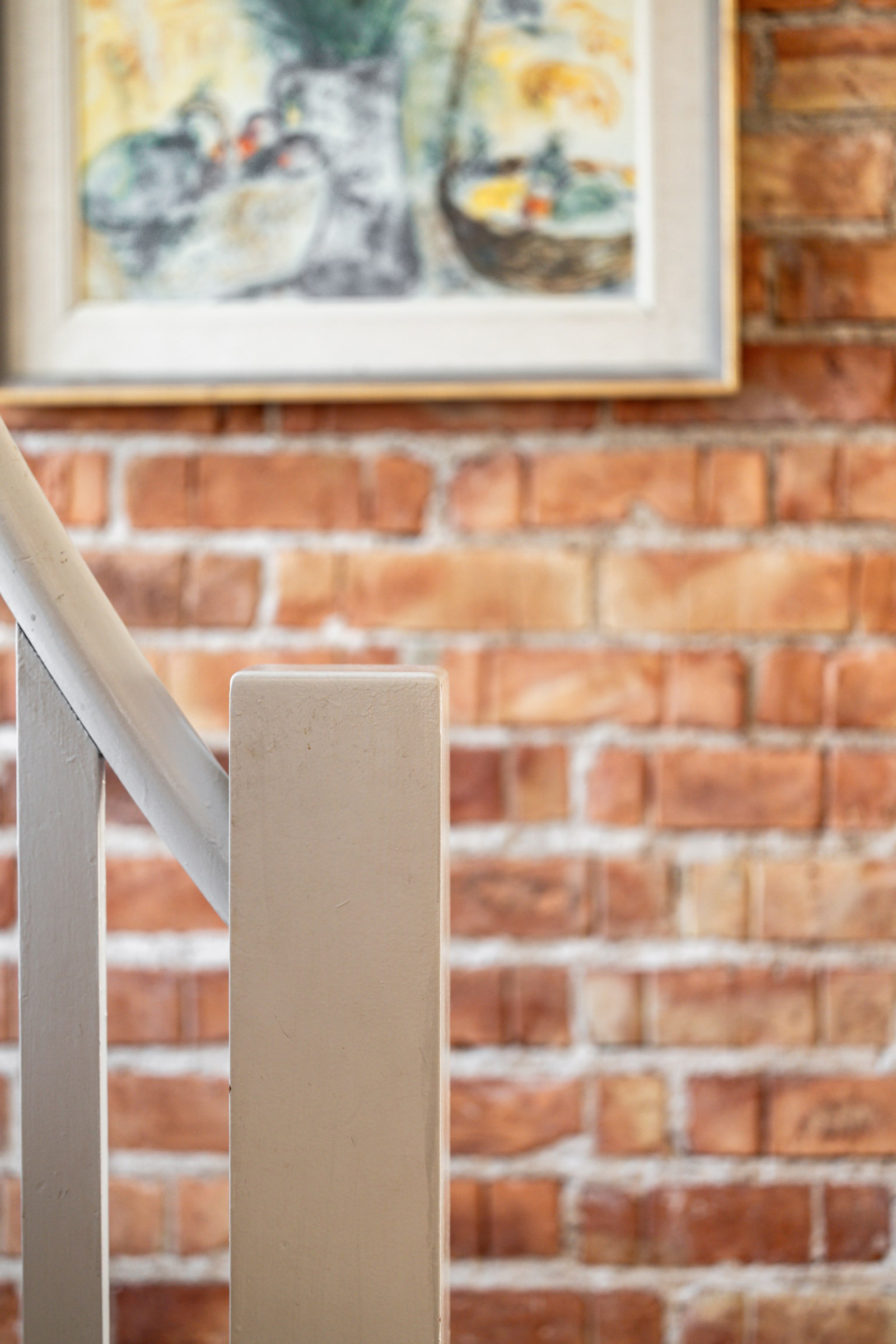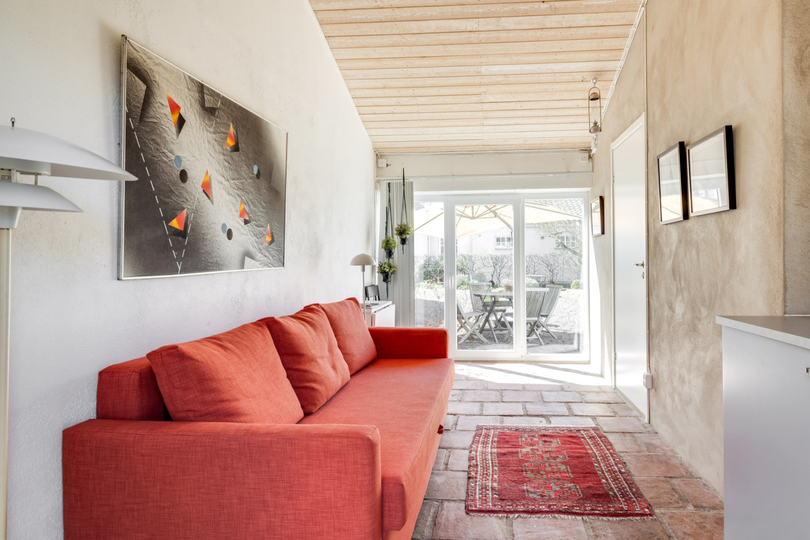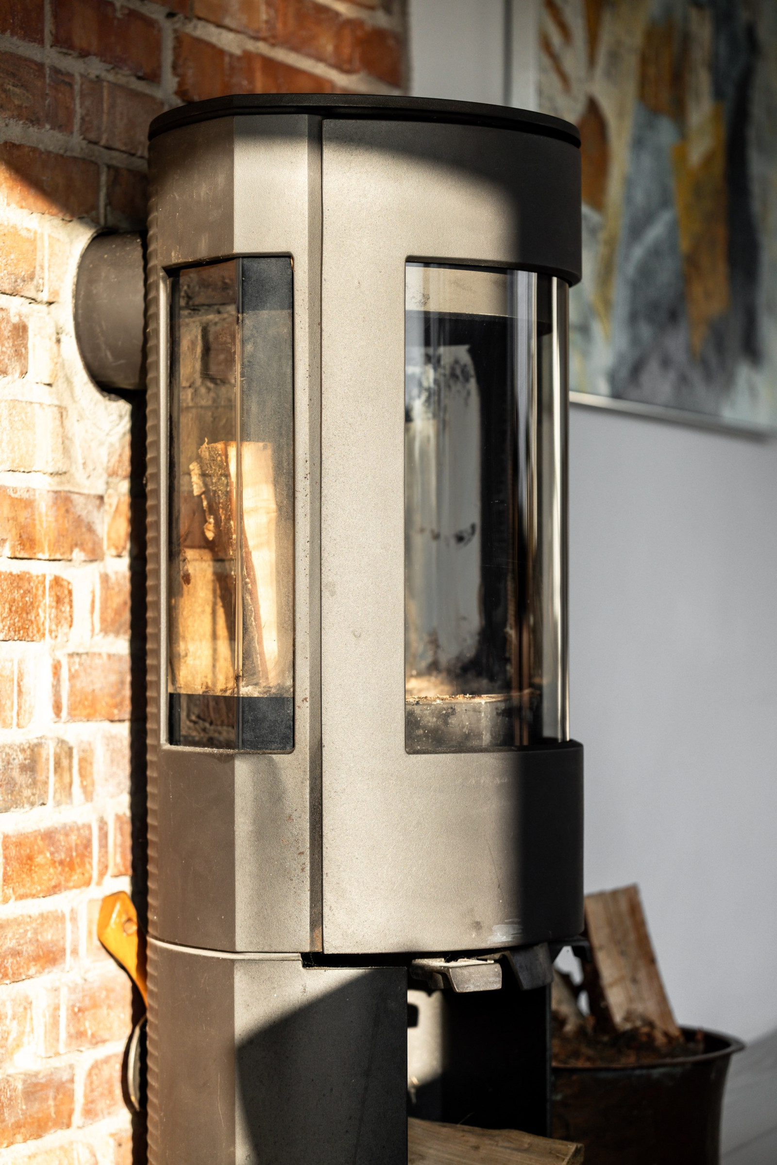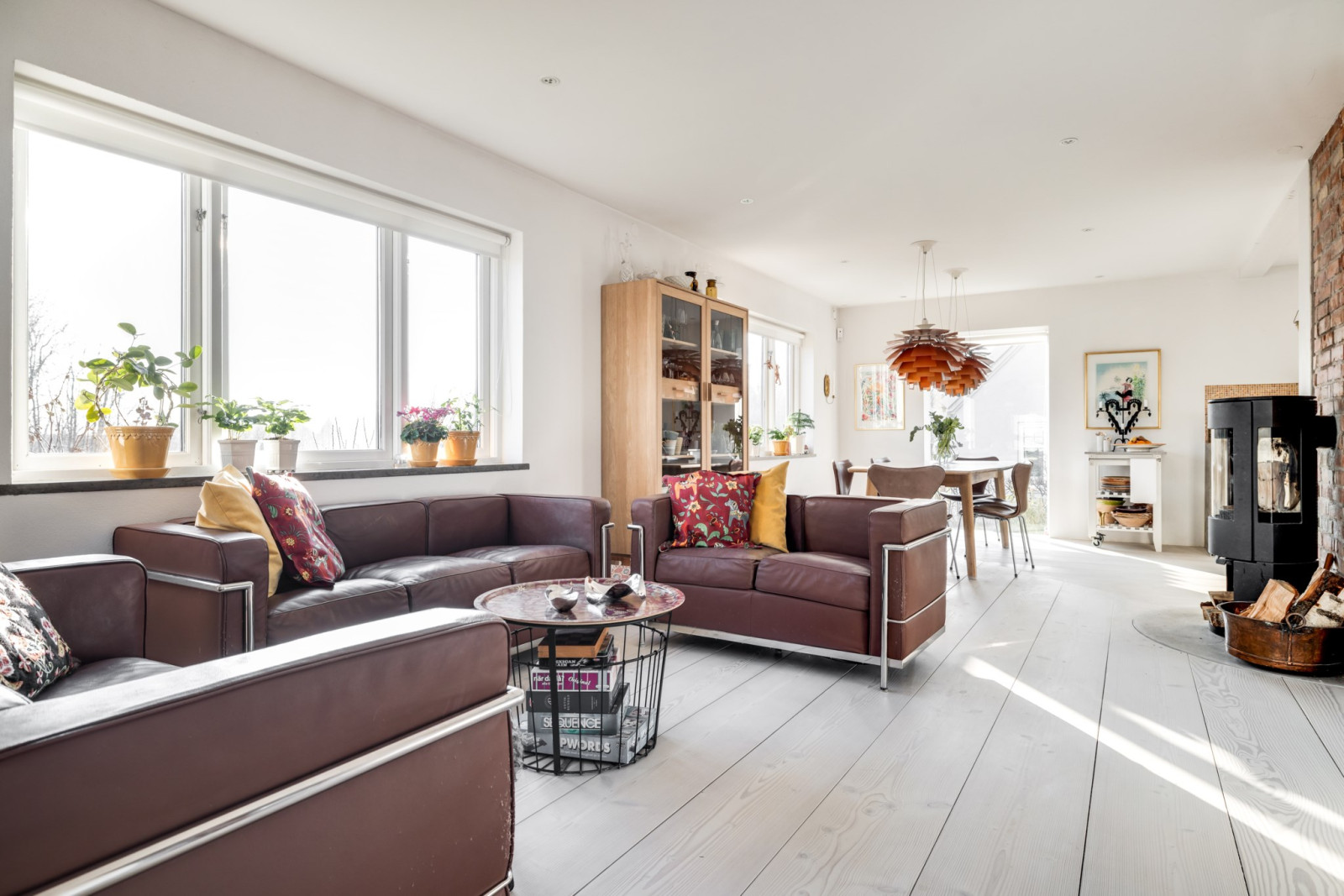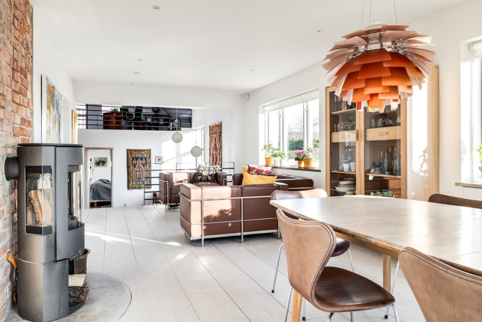 Mysigt allrum där den framtagna murstocken och rustika trägolvet skapar extra mysig känsla.