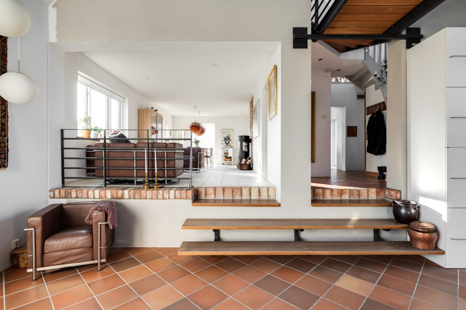 Vardagsrummet ligger öppet mot både hallen och matrummet. Två trappsteg ner och öppet i nock skapar en underbar atmosfär. Takfönster, altandörrar och stora fönsterpartier gör att ljuset flödar. En fantastisk yta för stora bjudningar eller barnens lek. Snyggt, uppvärmt och slittåligt klinkergolv.