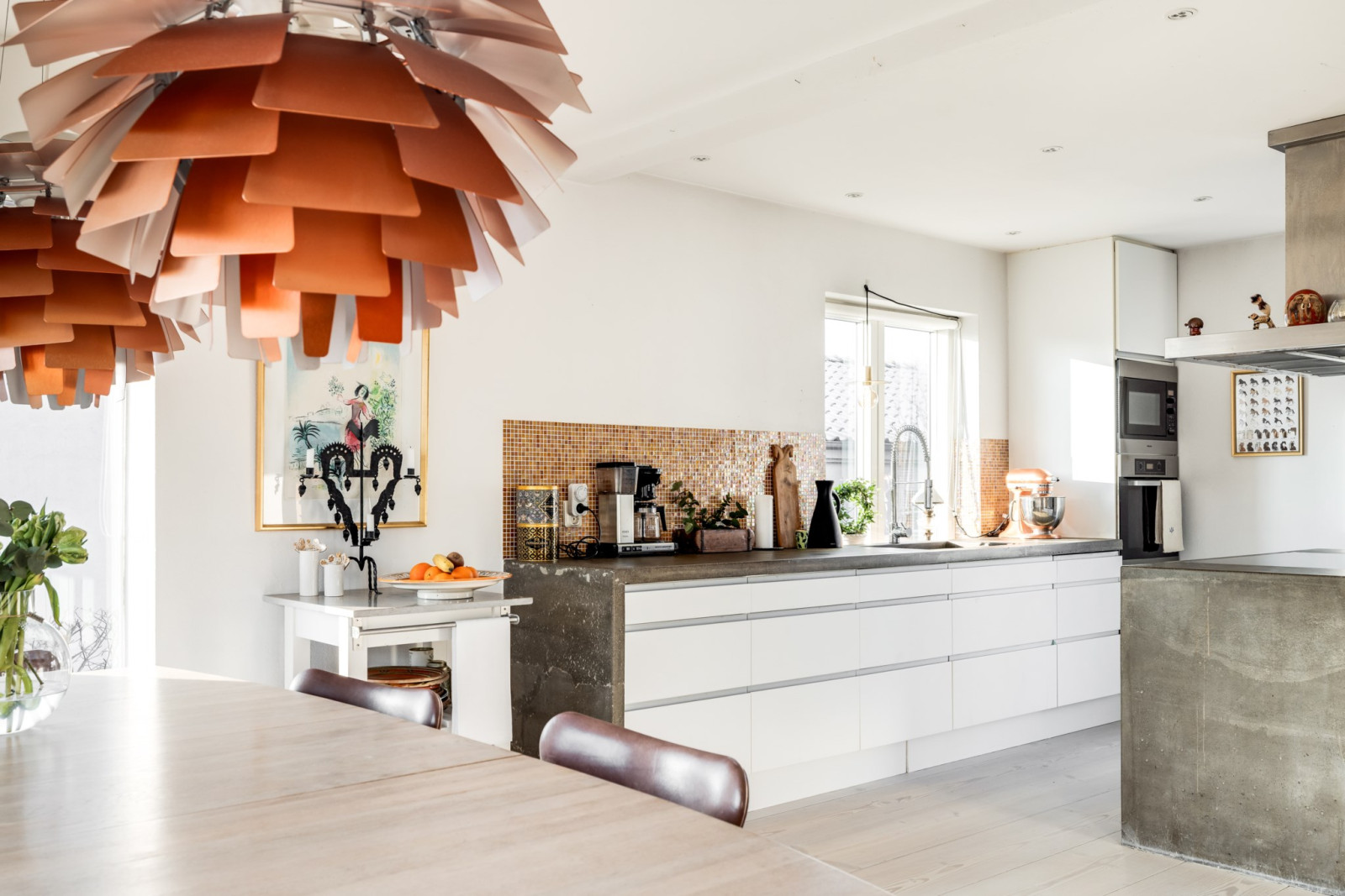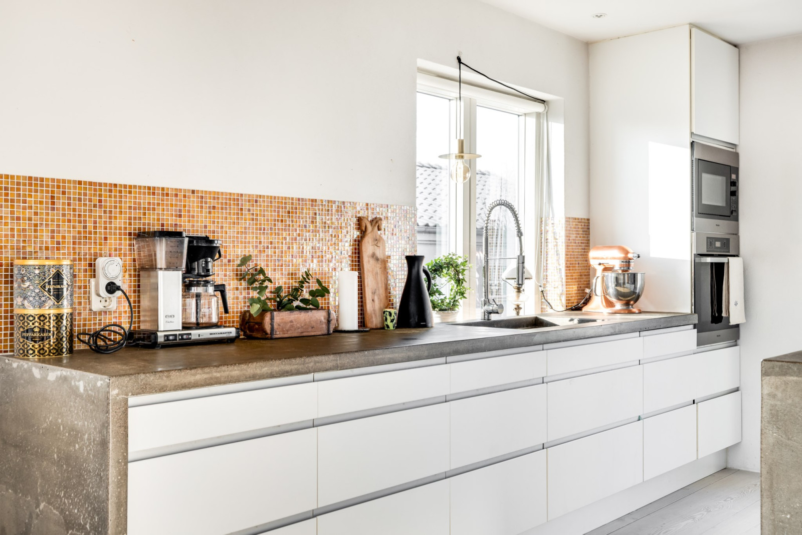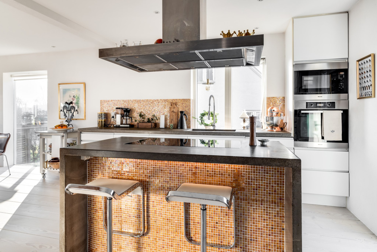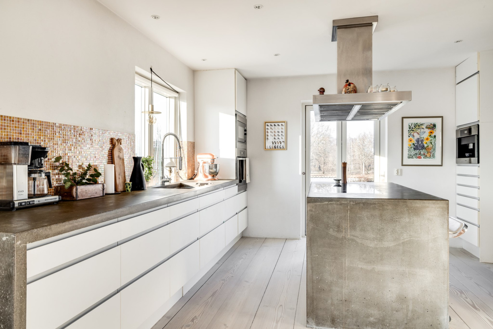 Ljust och välplanerat kök med arbetsytor och köksö i specialtillverkad betong. I köksön ligger en extra bred, cirka en meter, induktionshäll infälld. Generöst med förvaringsutrymme från Ikea och samtliga vitvaror från Miele. Inbyggd ugn och micro i behaglig arbetshöjd. Integrerad kaffemaskin och hel kyl och hel frys med väl avvägt avstånd till köksön. Allt från 2013.
