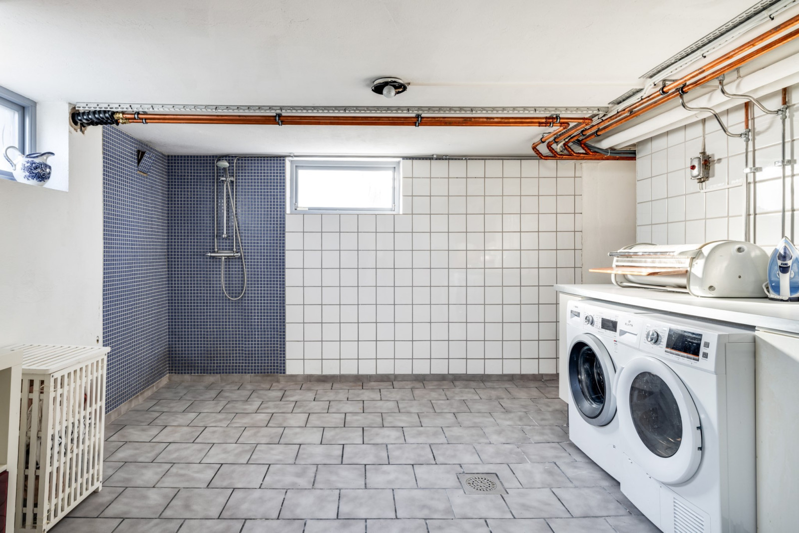 Rymlig tvättstuga med tvättmaskin, torktumlare, dusch och separat torkrum.