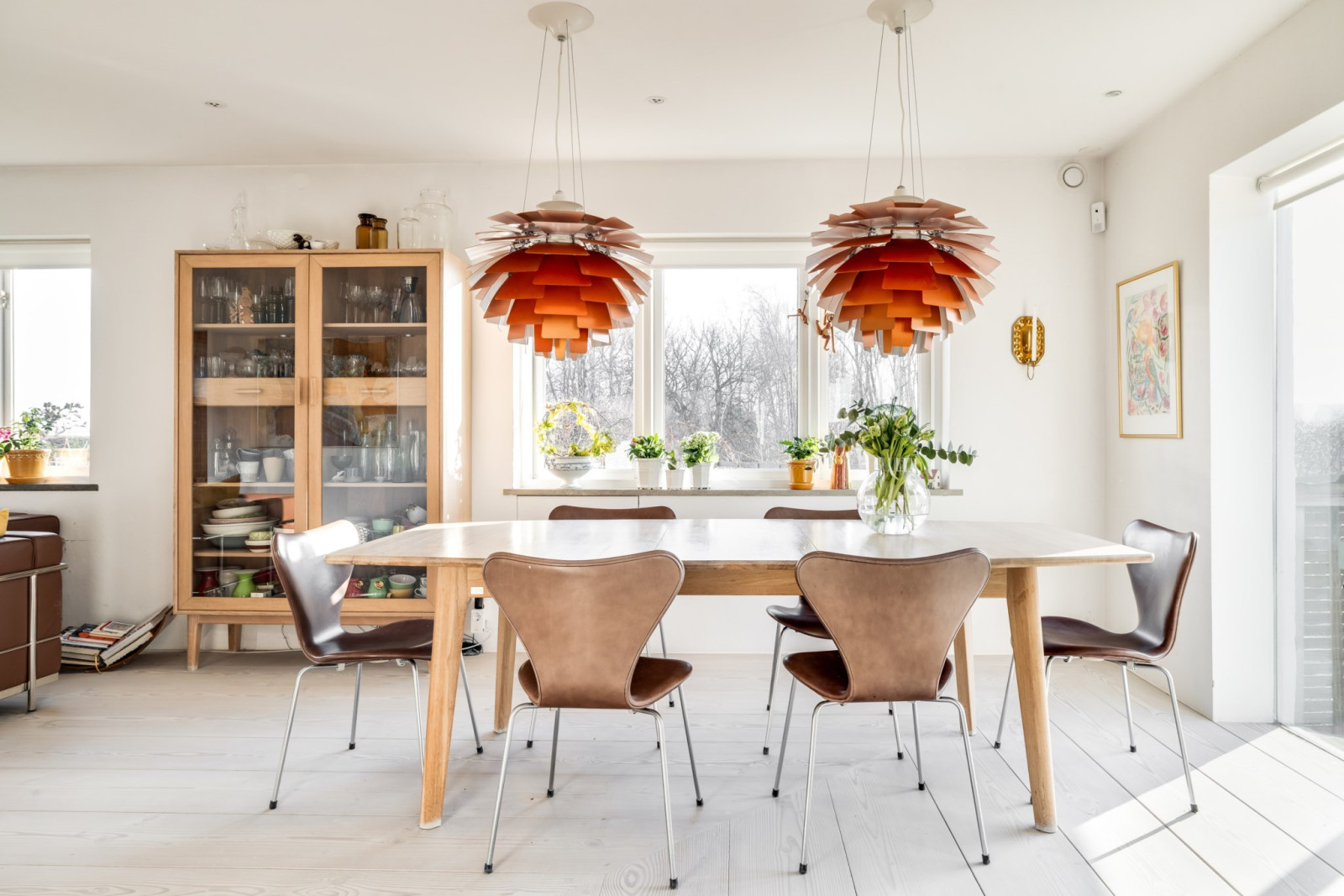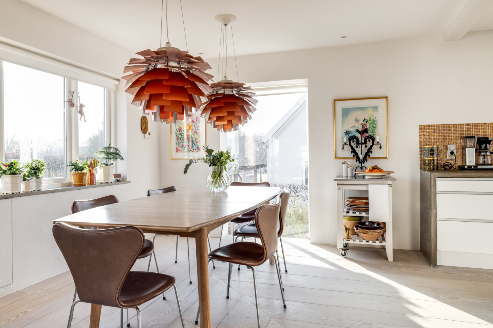 Matrummet ligger öppet och i vinkel med köket. Rustikt trägolv av Douglasgran, värmande braskamin och vitputsade väggar skapar en härlig atmosfär.