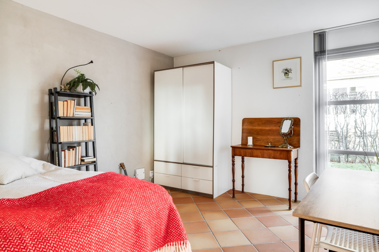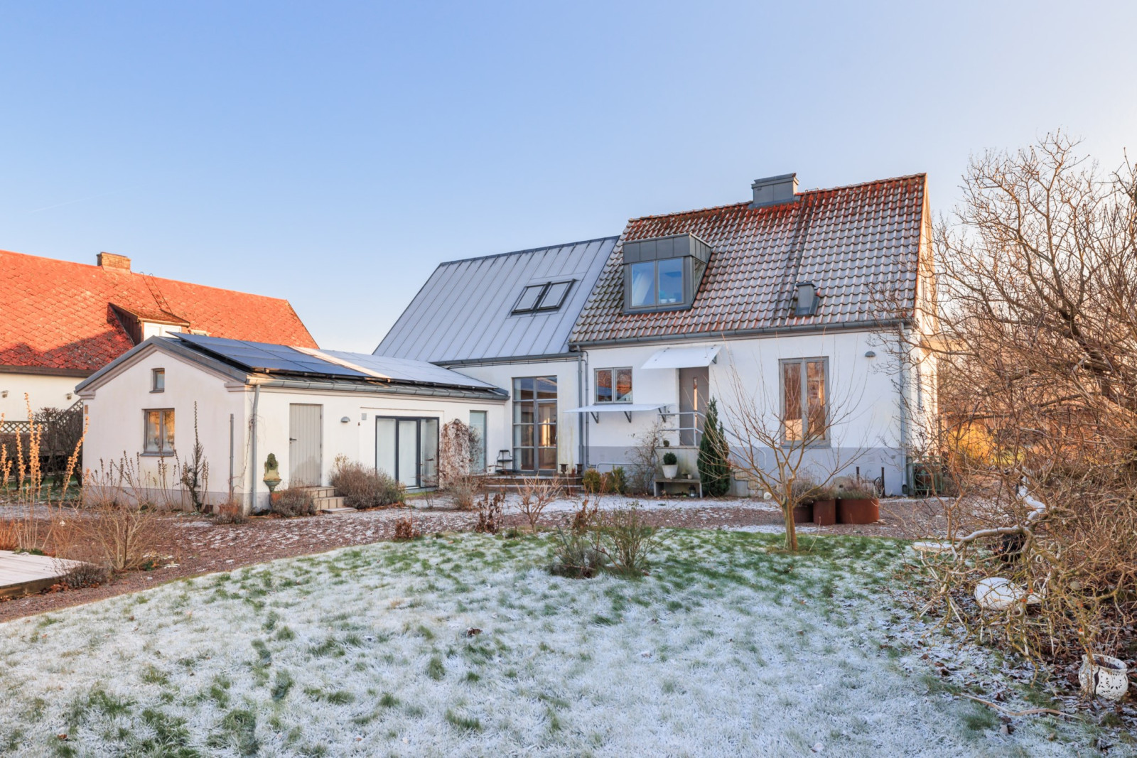 I vinkel med vardagsrummet ligger entréplanets tredje sovrum. Inrett i tidigare sidobyggnaden. Öppet upp i nock med takfönster skapar en otrolig känsla åt detta rum. Snyggt, uppvärmt klinkergolv.