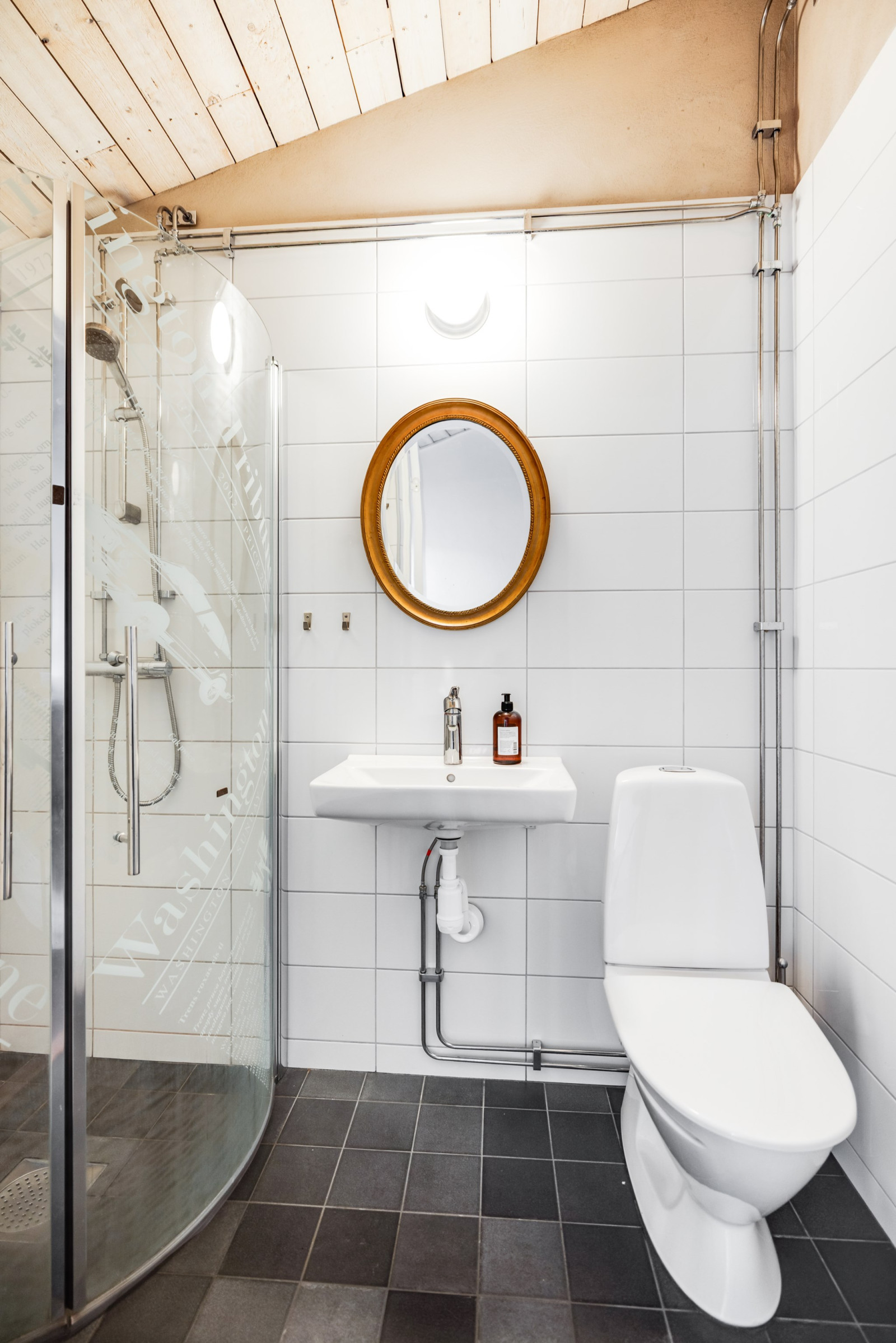 Helkaklat badrum med dusch, wc, tvättställ och golvvärme.