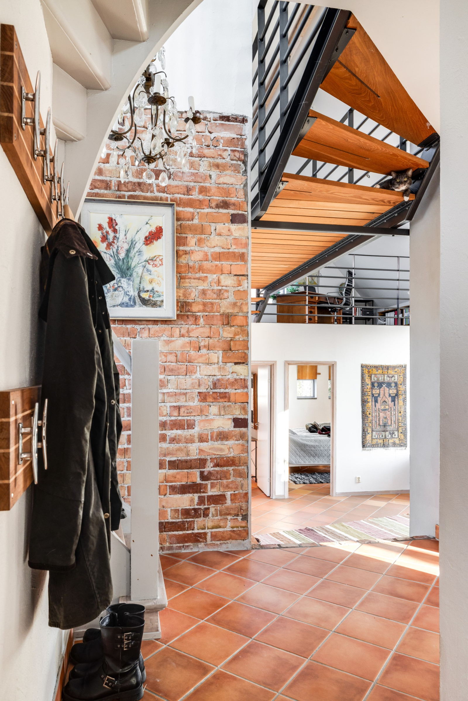 Praktisk hall med yta för ytterkläder och trappa till både ovanplanet och källarplanet. Öppet till ovanplanet skapar en rymlig känsla.