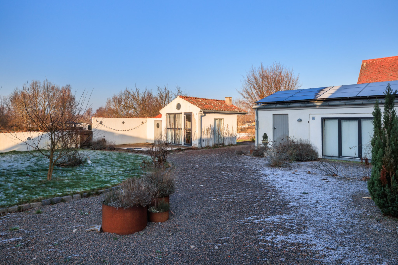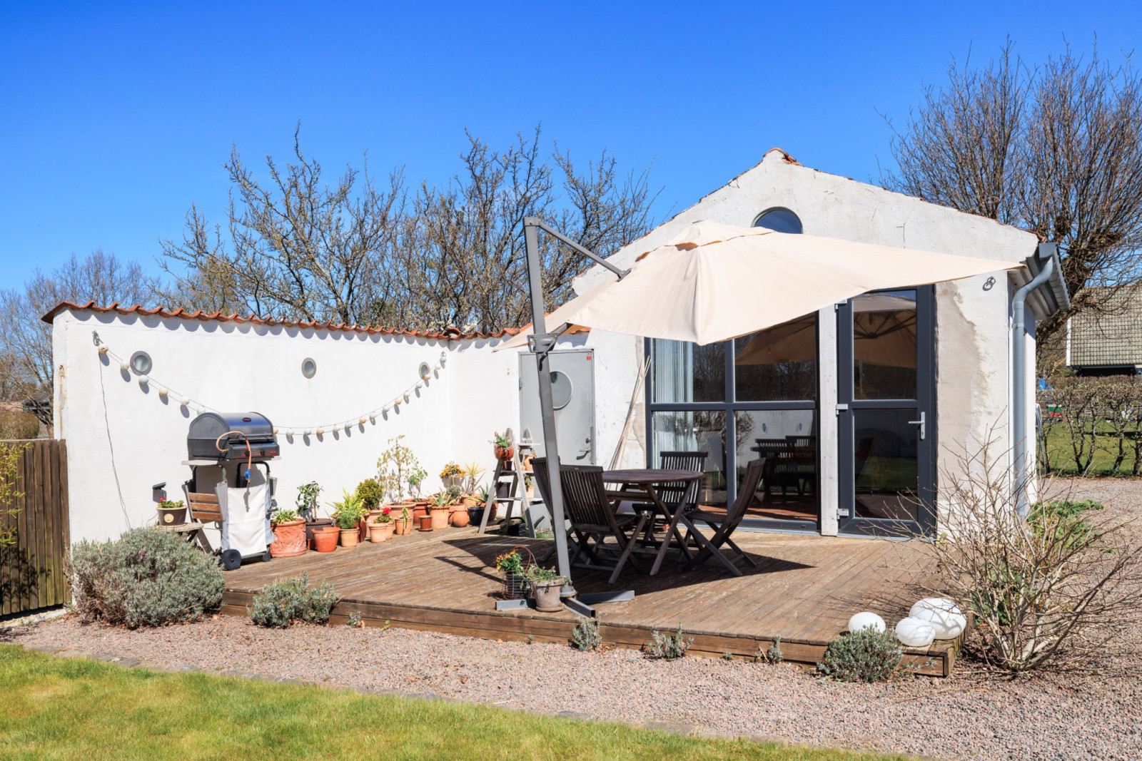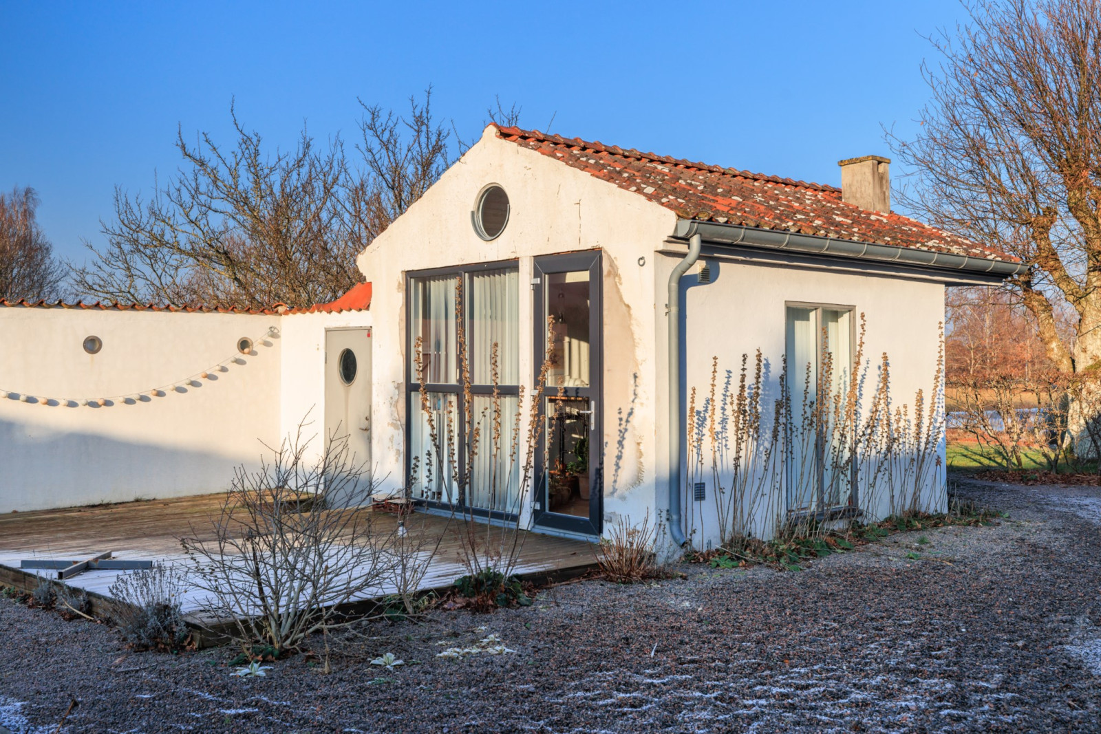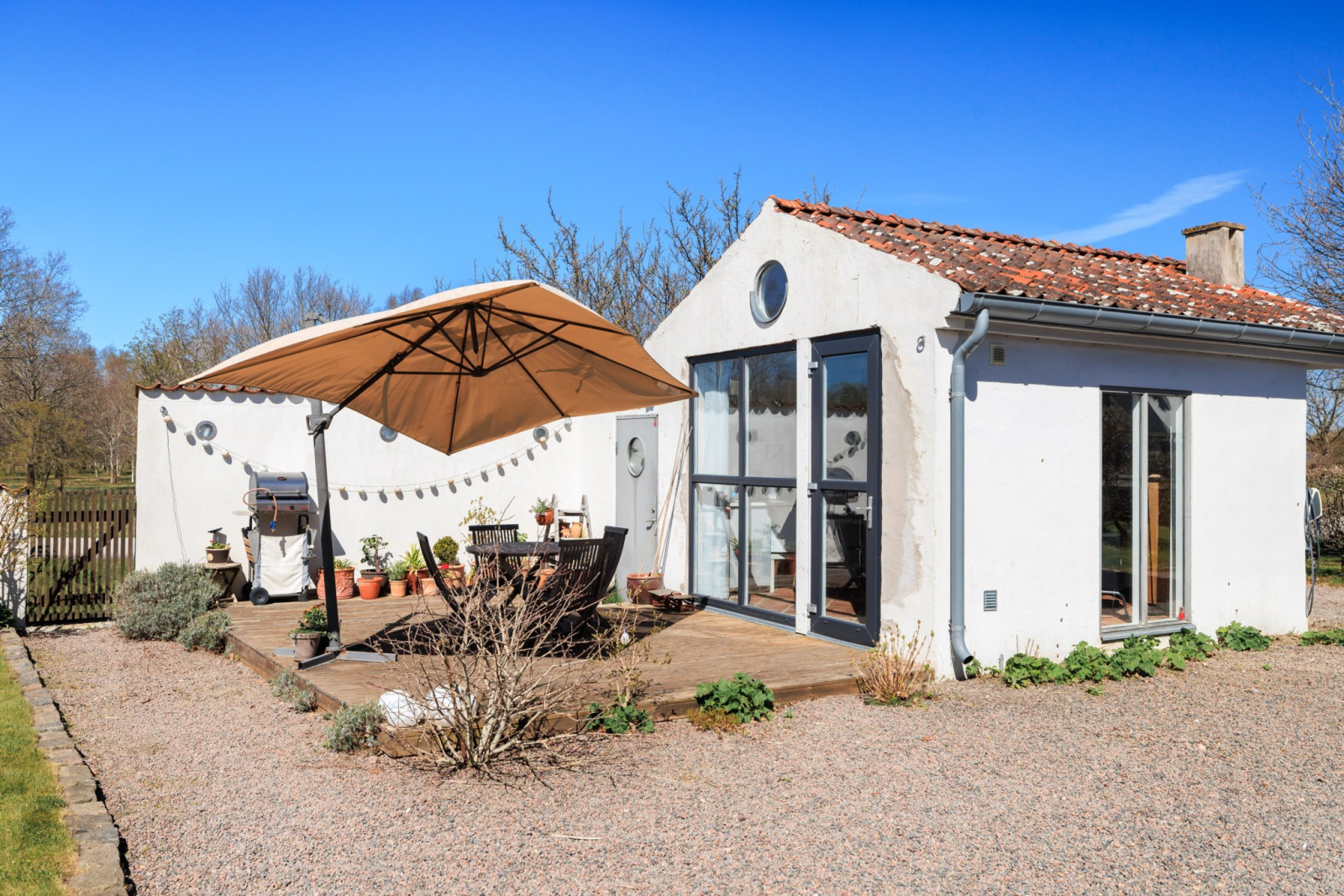 Jättemysig, friliggande byggnad med eldstad (ej i bruk), vitputsade väggar och handslaget tegelgolv. Pentry och helkaklat badrum från 2018. Perfekt för uthyrning sommartid.