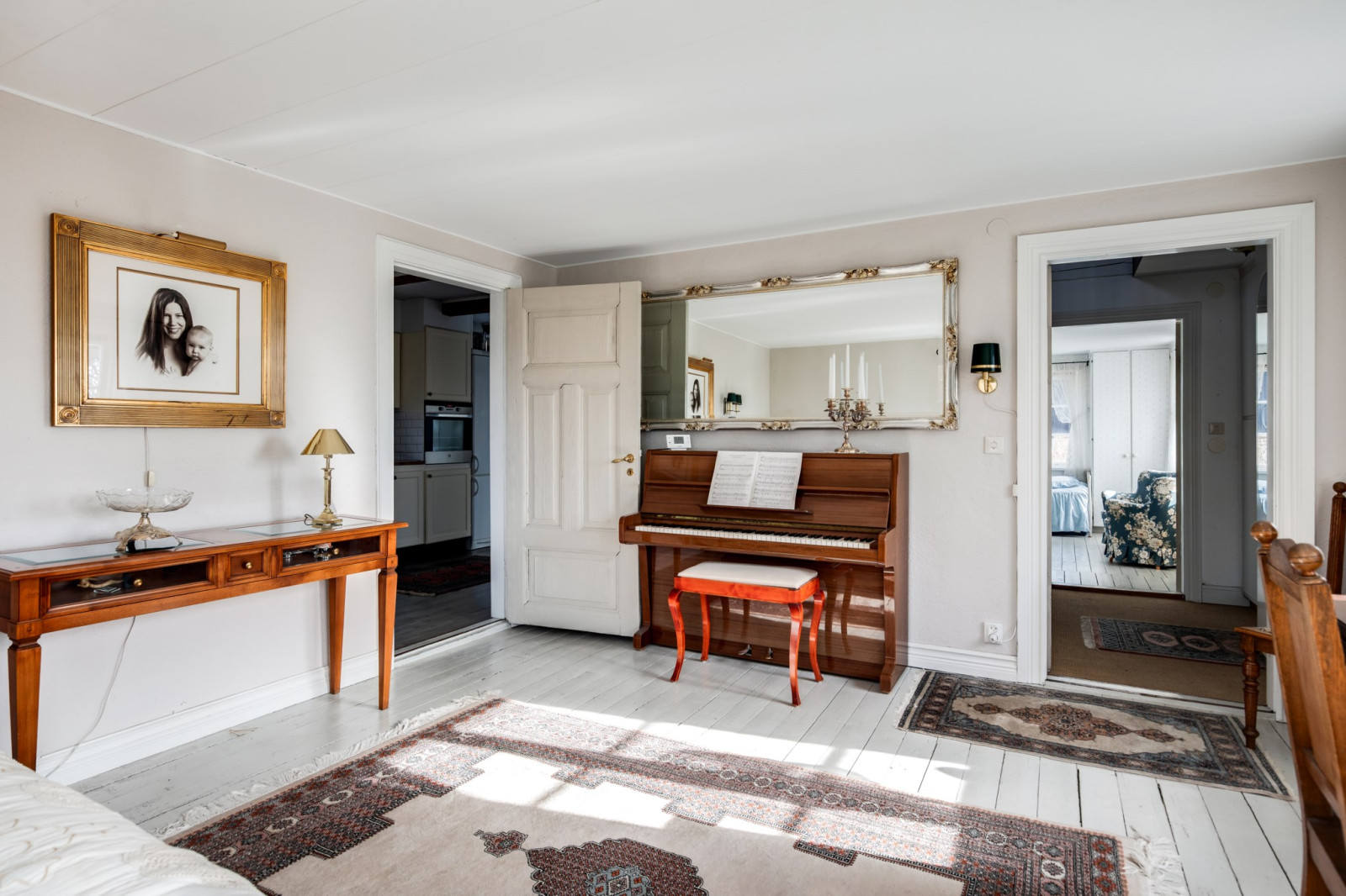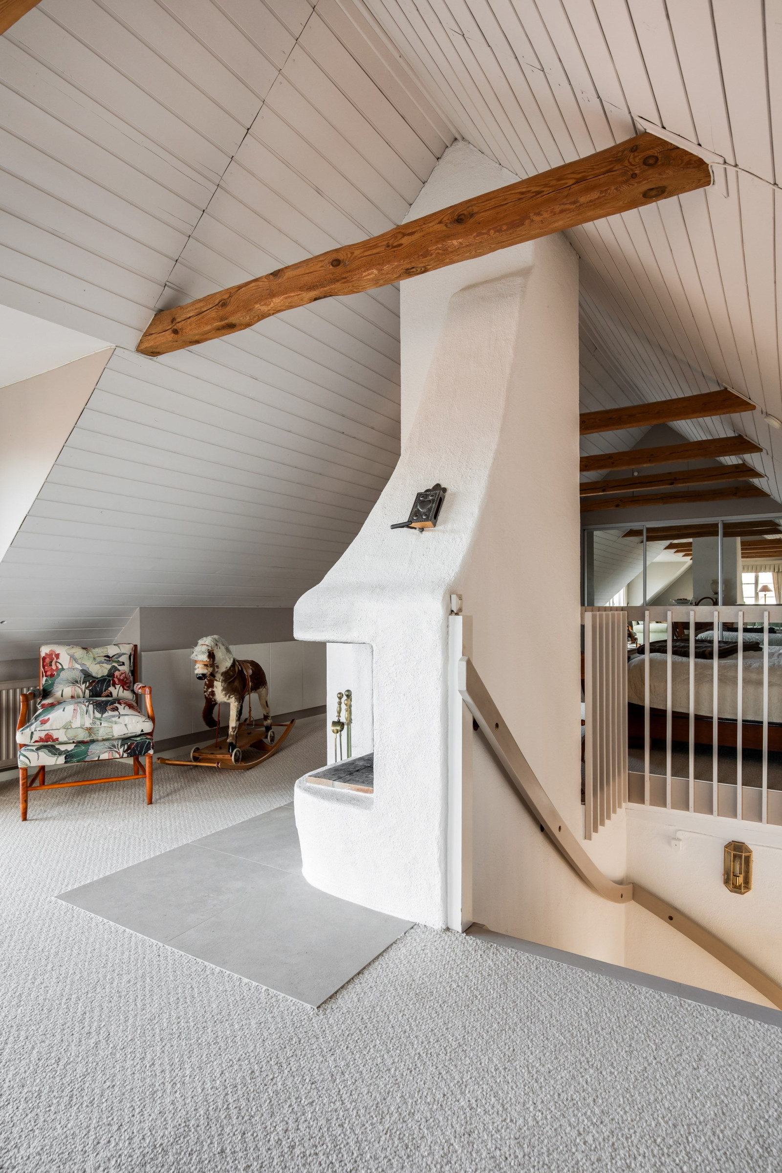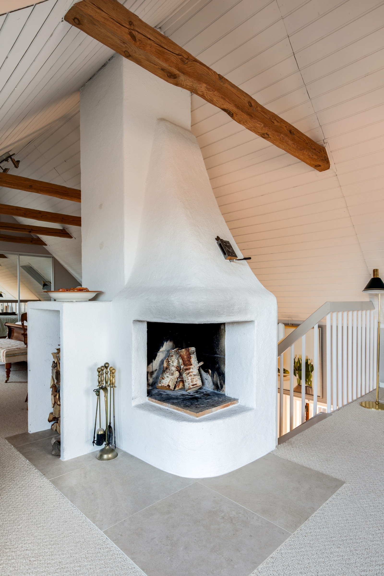 Generöst och inbjudande allrum med snedtak och synliga träbjälkar som ger rummet karaktär. Ljusa väggar och textilt golv skapar en varm och ombonad känsla. Stort fönsterparti ut mot balkongen ger fint ljusinsläpp och härlig utsikt. Centralt placerad vitputsad öppen spis bidrar till en trivsam atmosfär.
